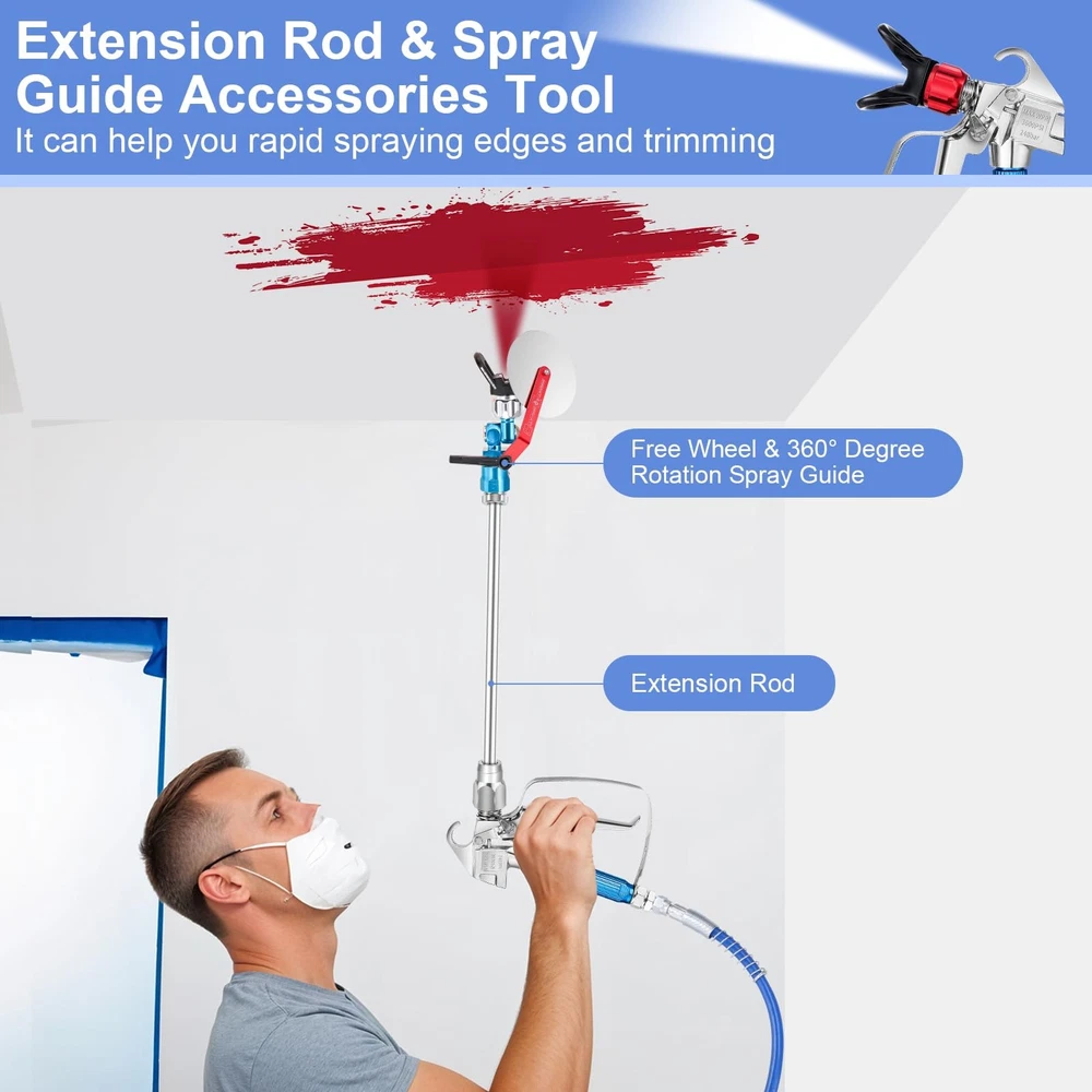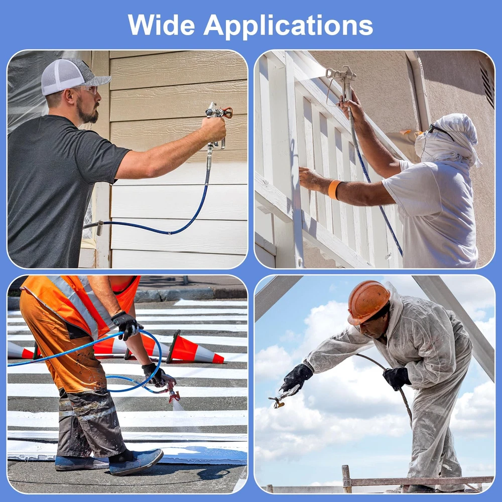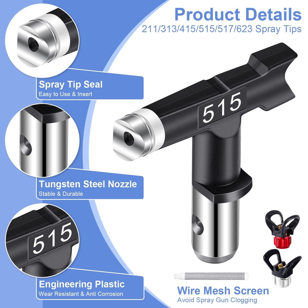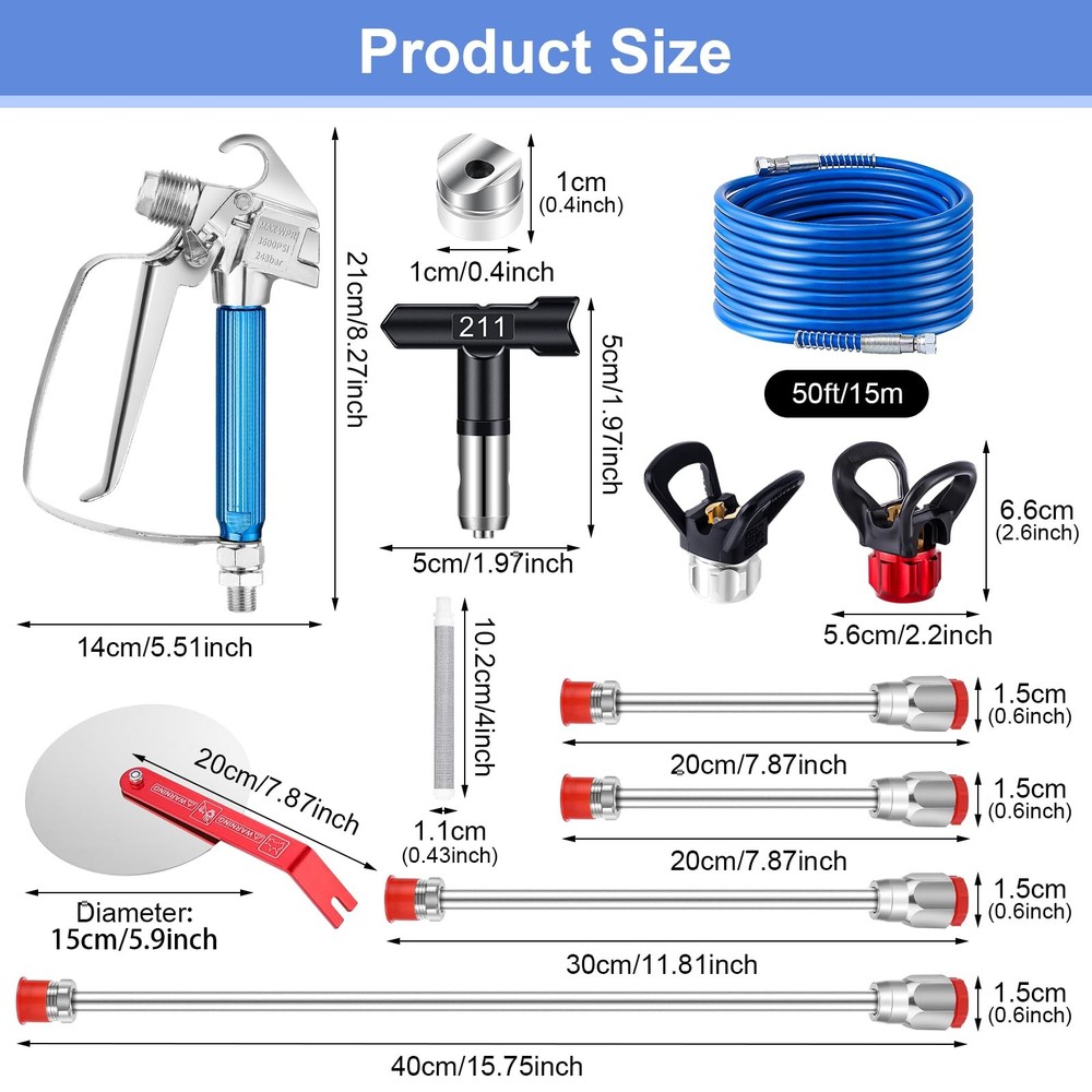 Specifications: Spray Tips Model: 211/313/415/515/517/623 Color: Black Silver Blue Material: Aluminum Alloy/Stainless Steel/Tungsten Steel Features: 1.The spray tips are very easy to install, it can be quickly installed in a short time without tools. 2.The spray gun filter can effectively help you filter impurities in the paint and prevent the nozzle from clogging. 3.The airless paint sprayer tips adopts a reversible design. Just rotate the nozzle and pull the trigger to quickly clean and clear the blockage. 4.The main body of the sprayer tip is made of tungsten steel, which is sturdy and durable. It will not be easily damaged even after long-term use. Package Includes: 1 pcs spray gun 1 pcs 50ft high pressure hose 1 pcs free wheel 1 pcs 180 degree rotation spray guide 2 pcs nozzle seat 4 pcs extension rod 6 pcs spray tips 6 pcs spray gun filters Package Includes: You will receive 1 pcs airless spray gun, 1 pcs 50ft high pressure hose, 6 pcs spray tips(211 313 415 515 517 623), 4 pcs extension rod(7.87"+7.87"+11.81"+15.75"), 2 pcs nozzle seat, 6 pcs spray gun filter, 1 pcs free wheel and 1 pcs 180 degree rotation spray guide. With just one purchase you have all the accessories you need to paint and start enjoying your painting time! Wide Compatible: The airless paint sprayer gun kit can be adapted to most airless paint sprayer, 50ft hose can accommodate a variety of work areas. Six modle of nozzles and four sizes of extension rods can meet your various spraying needs. The nozzle seat and spray gun filter can help you prevent paint splashes or drips, filter impurities in the paint and avoid nozzle clogging. The spray guide accessories tool can help you rapid spraying edges and trimming. Easy Installation: The airless paint sprayer gun are very easy to install. You only need to install the tip seal on the nozzle, then insert the spray tip into the nozzle and slightly rotate it to complete the installation. Then connect the spray gun and paint sprayer with a high pressure pipe to start your spraying work.(You can learn detailed installation steps, replacement steps for the spray gun filter element, and how to install the spray guide accessory tool through pictures.) Material: The spray gun and other accessories are made of aluminum alloy and stainless steel, high pressure hose is made of polymer fibers, the spray tip is made of tungsten steel, which is strong and durable. It feels comfortable and will not be easily damaged even after long-term use. At the same time, the spray tip adopt a reversible design, you just need to rotate the spray tip 180° and pull the trigger, it will be quickly complete the cleaning and dredge the blockage. Wide Application: The airless paint sprayer gun accessories are ideal for spraying doors, trim, interior walls, ceilings, fences, cabinets, sheds, decks and many other places indoors and outdoors, which can meet your needs for various spraying projects.