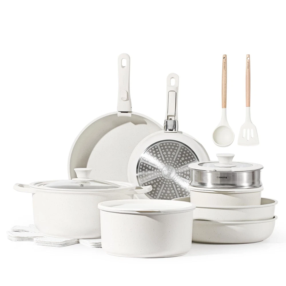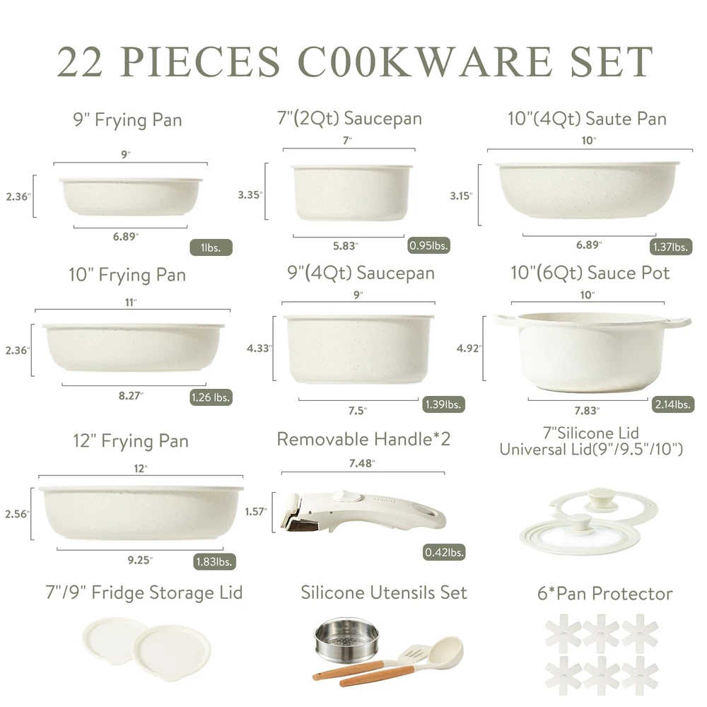πππ π πͺππππππ-ππππ πͺπππππππ : Optimal storage and easy stacking with the handles off saves up to 70% more space of detachable handle pots and pans set. πππ π ππππ-ππππ πͺπππππππ: Cleanup with ZERO elbow grease thanks to the nonstick granite. As both a cookware set and a dinnerware set, 1-time cleaning for all. π΄πππππππππππ πͺπππππππ πΊππ: Removable handle for the ultimate versatilityβ go from ALL kinds of stoves to the oven, to the grill, to the fridge, and onto the table in a click. πππ πππβπ πͺπππππππππ ππ πΈππππππ: Balanced convenience-rich features, rapid&even heat transfer, and nonstick performance as the same as other cookware sets. πΎππππ-ππππ πΊππππππ: Each cookware passes strict multi-inspection process. In case you received defected items caused by delivery, please don't hesitate to reach out, you will be guaranteed to get a solution or a new replacement. π¨ππ-ππ-πππ πΊππ: This cookware set includes 12''/10''/9'' fry pans, 4qt/2qt saucepans, 4qt saute pan, 4qt casserole, 2 removable handles, 9''/10'' silicone lid, 9''/7'' storage lids, 6*pan protectors, silicone turner, silicone spoon, steamer.