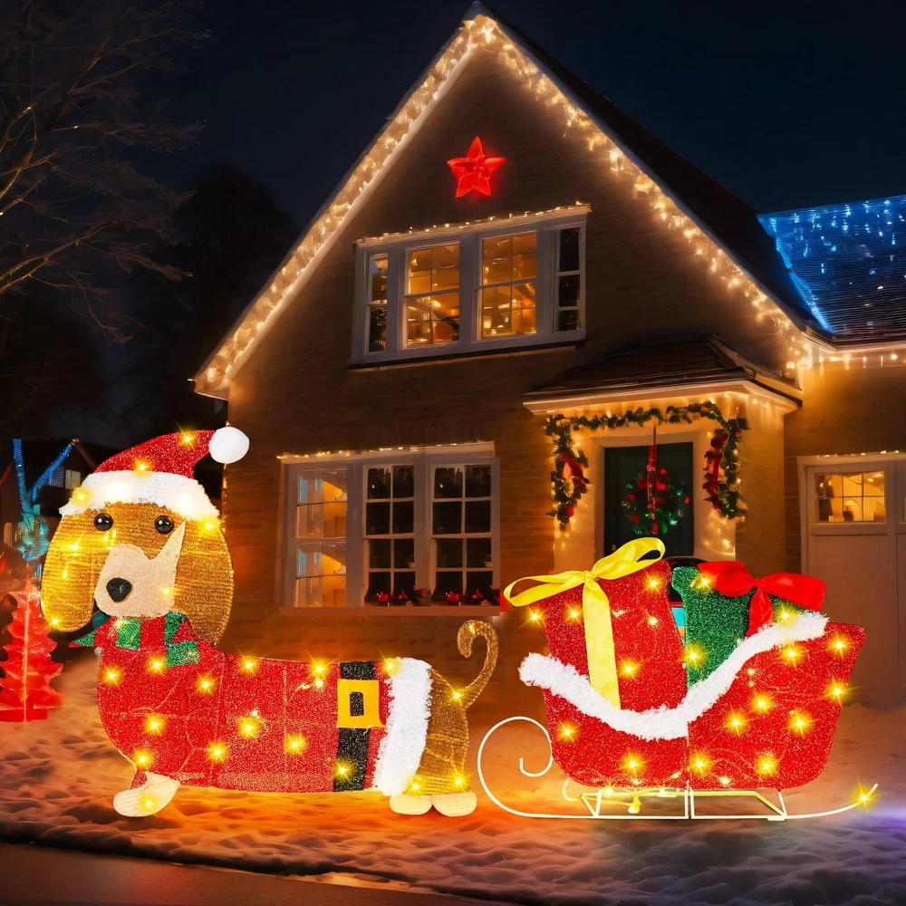 Features: Cute Christmas decorations: Christmas Dachshund decorations wearing green scarves, dragging sleds with gift boxes to welcome your guests, classic appearance effects and cute puppies add Christmas colors to your yard decoration, creating a joyful festive sense. Easy to install: The detachable design allows this outdoor Christmas decoration to be quickly installed in just three steps. But please be careful not to scratch the wire. Specifications: Material: metal Color: red, green, white Size: 23 inches (58 cm) Package includes: 1 x Lighted Christmas outdoor decoration set Notes: Manual measurement, please allow slight errors on size. The color may exist a slight difference due to different screen displays Lighted Christmas Outdoor Decoration Set: transform your holiday display with this lighted Christmas dog decoration set featuring a delightful 23 inches dachshund dog pulling a sleigh; This cheerful Christmas dachshund decoration adds a whimsical touch to your outdoor Christmas decor, welcoming guests with its festive charm. Note: The light string can be directly wrapped around the product, you can also prepare tape or adhesive tape to reinforce Ideal Size for Eye Catching Appeal: standing at an impressive 23 inches, this lighted Christmas dachshund sleigh decoration is designed to stand out in any yard or garden; The size makes it an ideal focal point for outdoor Christmas decorations, ensuring it captures attention and spreads holiday cheer to all who pass by Weather Resistant and Stability: constructed with sturdy metal brackets and lamp tube, this dog Christmas outdoor decoration is built to withstand winter weather; The durable materials ensure that your lighted Christmas yard decorations will remain vibrant and charming throughout the holiday season and beyond Glow Christmas Lawn Display: featuring glowing white lighting effects, this metal Christmas outdoor decoration brings warmth and joy to your festive displays; The illuminated Christmas yard decoration creates a magical sense, perfect for Christmas themed parties, winter holiday parties, nighttime festivities, family gatherings, indoor and outdoor decorations, or terrace decorations Multiple Scenes: classic appearance effects and cute puppy add Christmas colors to your yard decoration, creating a joyful festive sense; This dachshund Christmas outdoor decoration is perfect for a variety of outdoor settings, including yards, gardens, and porches; Ideal for holiday parties, family gatherings, or simply brightening up your neighborhood, this Christmas sleigh outdoor decoration adds a playful and festive touch to any outdoor space
