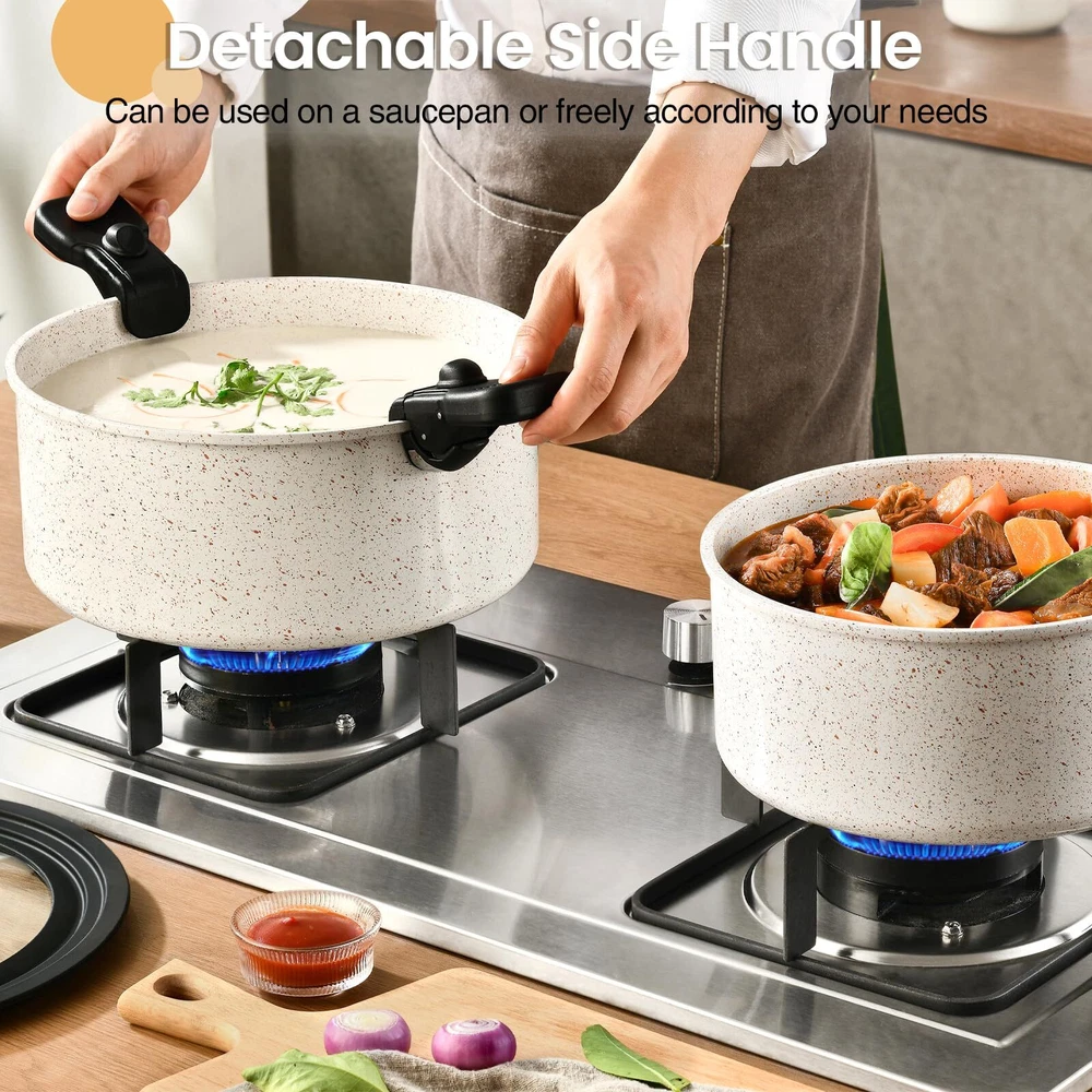 4 Removable Handles: Our removable cookware set has four removable handles, which can solve the trouble of not having enough handles. Two of the short handles can be used for saucepans or as you see fit. Remove the handles to easily stack pots and pans for storage, saving up to 70% space Universal Lid Design: Our 3 -in-1 pan lids of kitchen cookware set with vent comes in 3 various sizes. two universal lid fit pans & pots 7''-7.8''-8.6'' and pans & pots 8.6''-9.5''-10'' Multitasking Cookware Set: One set solves multiple needs, can be used as tableware and grill pan, and can be stored in the refrigerator with a freezer lid. Removable handles bring it to the table with just a click. Experience 5X superior non-stick cooking with minimal oil,food just slides off smoothly. All Stoves Use: Our cookware supports induction, gas, electric, and ceramic, and oven safe up to 550°F. Easy to Clean: removable pots and pans set has a ceramic nonstick design throughout for effortless cleaning and is dishwasher and handwash safe What You Get: This cookware set includes 11''/9.5''/7.8''frying pans, 5.1QT/3.3QT/1.8QT sauce pans, 11'' silicone lid, 7''-7.8''-8.6'' universal silicone lid, 8.6''-9.5''-10'' universal silicone lid, detachable side handle*2, detachable handle*2, pot protector*5, insulation mats*2, 7'' fridge storage lid, utensil set Guaranteed Customer Satisfaction: Each cookware passes a professional and strict quality inspection. If you receive any defective product due to delivery or encounter any problem while using the saucepans, please feel free to contact us