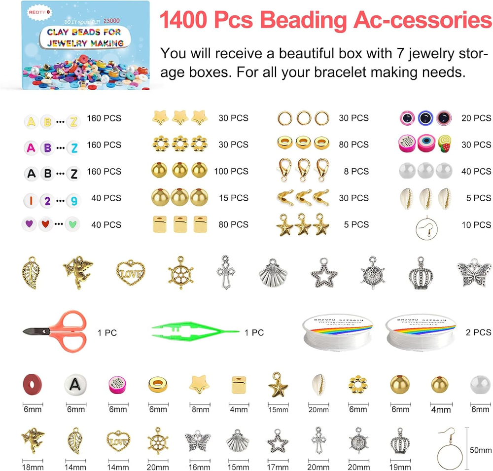 Store New Arrivals Add to Favorite View Feedback Contact Fast deliveries to the customer's home Quality customer service John Make the customers happy! 23000 Pcs Clay Beads Bracelet Making Kit 144 Colors 7 Boxes Flat Polymer Heishi Beads Set for Friendship Jewelry Making with Pendant Charms Crafts Gifts for Girls Ages 6-12 Kids Adults Description 144 Rich Colors: This clay beads kit has EVERY color kids need to make bracelets—perfect for young beginners! With tons of fun hues, it opens up endless possibilities for unique color mixes, so kids can craft one-of-a-kind bracelets and jewelry all by themselves. They’ll stay entertained for hours, creating with 2025’s fun gradient rainbow shades and blended tones! The finished bracelets turn out bright, beautiful, and totally eye-catching—guaranteed to make kids proud to show them off everywhere Everything Needed for Bracelet Making: This clay beads kit comes with everything you need to make bracelets! 144 colors and 20,000+ clay beads, enough to make 150+ beaded bracelets. It includes plenty of accessories, such as letter beads, number beads, star beads, gold spacer beads, earrings, charms, 2 rolls of stretchy string, scissors, jewelry tweezers, and 20+ accessories and tools for kids to get creative Ideal for Craft Days: Here’s a fun craft activity for weekends or rainy days! The bracelet-making kit comes with plenty of beads, allowing kids aged 6–12 to spend hours using their imagination and creativity to DIY unique bracelets, necklaces, earrings, anklets, or other jewelry—with the ability to make over 150 pieces up to! Whether given as gifts to family or exchanged as friendship bracelets with classmates and friends, it’s a great choice. Not only does it allow kids to be creative, but it also keeps them away from their cell phones for a while (Note: Recommended for ages 6+ under adult supervision) Bead Storage Box: 23,000 clay beads and accessories are neatly stored in 7 sealed, sturdy divided storage boxes. This unique design effectively prevents color mixing between beads. The clay beads bracelet making kit includes 144 vibrant colors of clay beads, with 150 beads of each color. Each color is housed in its own dedicated compartment, keeping everything perfectly organized. When kids are crafting bracelets or jewelry, they can easily and quickly find the exact color beads they need, providing great convenience for their creative projects. It’s incredibly practical and user-friendly for young artisans Birthday Gifts & Well-Packaged: This bracelet-making kit is beautifully packaged, very cute, and perfect as a fun craft activity for everyone to enjoy at a daughter's birthday party, as one of the Christmas gifts for a granddaughter, as a handmade gift for a niece who likes DIY bracelets, as a group craft activity during kids' camping breaks, or as an excellent choice for students' after-school activities. It is suitable for people aged 6 and up, including children, teenagers, and adults, and a fun and practical gift Brand After-Sales Promise: No matter what, if you’re dissatisfied with the product you receive, please contact Redtwo at any time. Our professional after-sales team will provide you with a perfect solution within 24 hours. At Redtwo, we hope every bracelet making kit brings happy smiles to children Product Description The video showcases the product in use. The video guides you through product setup. The video compares multiple products. The video shows the product being unpacked. Create beautiful clay bead bracelets with your child! Step away from screens to enjoy hands-on activities that may help improve skills and color perception while strengthening your parent-child bond. Experience a fun and harmonious family atmosphere together. VARIOUS STYLE DIY CRAFTS Are you still worried about how to make earrings? This video will teach you how to make earrings Earring kit include earring hook and earring ring. Put the clay beads through the earring ring, and then assemble the earring hook and earring ring together. You can try to use different colors of clay beads to make different styles of earrings. I hope this video is helpful to you, thank you! The video showcases the product in use. The video guides you through product setup. The video compares multiple products. The video shows the product being unpacked. The video showcases the product in use. The video guides you through product setup. The video compares multiple products. The video shows the product being unpacked. Are you still worried about knotting? This video will teach you two ways to tie knots Method 1: Knot directly,You don't need to prepare any accessories Method 2: Knot with clamshell beads,Need to prepare 2 clamshell beads,2 jump ring and 1 lobster clasp Please watch the video for detailed tutorial,I hope this video is helpful to you, thank you! BEST TEEN GIRL GIFTS! Imagine Her Reaction as she opens her pretty clay bead box to see a beautiful Jewelry bracelet kit for the first time. It’s a Precious Moment that you’ll want to capture! ALUABLE COLLECTION AND GIFTS! An ideal gift for girls, teens, and all crafts makers. Lovely gifts for Christmas, Thanksgiving Day, birthday, etc. Let’s have a great crafts party! Compare with similar items Add to Cart Add to Cart Add to Cart Add to Cart Add to Cart Add to Cart Customer Reviews 4.7 out of 5 stars 702 4.7 out of 5 stars 702 4.7 out of 5 stars 702 4.6 out of 5 stars 11,370 4.6 out of 5 stars 7,889 4.6 out of 5 stars 7,889 4.6 out of 5 stars 11,370 Price $18.99 $ 18 . 99 $26.99 $ 26 . 99 — $19.99 $ 19 . 99 $8.48 $ 8 . 48 $6.99 $ 6 . 99 $6.99 $ 6 . 99 Color 144 Color 192 Color 168 Color 64 Color 24 Color 24 Color 18 Color Quantity 23000 Pcs 28000 Pcs 26000 Pcs 18000 Pcs 7200 Pcs 6800 Pcs 5100 Pcs Bead Organizer 7 box 9 box 8 box 4 box 2 box 1 box 1 box Complete Accessories ✔ ✔ ✔ ✔ ✔ ✔ ✔ With Letter Beads ✔ ✔ ✔ ✔ ✔ ✔ ✔ Item model number Bracelet Making Kit-23000 Warranty De