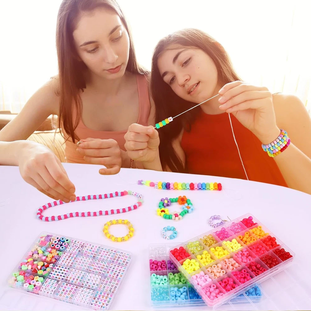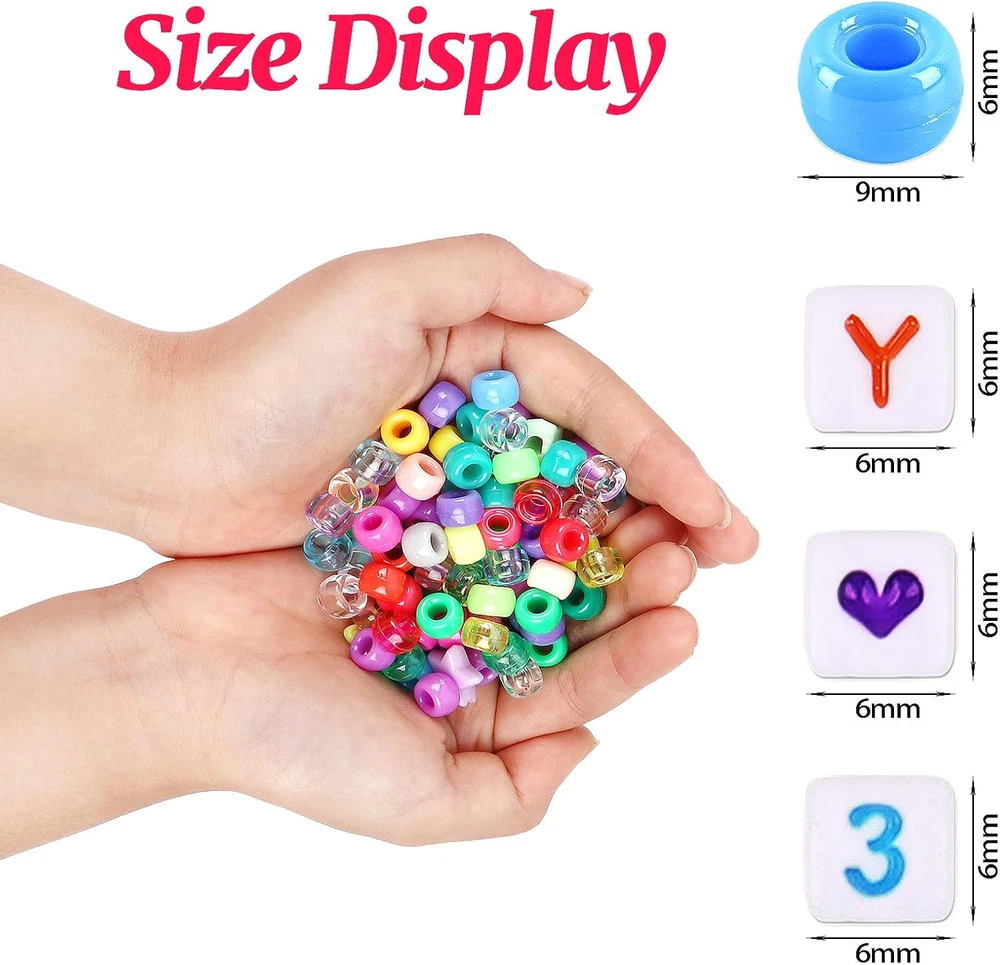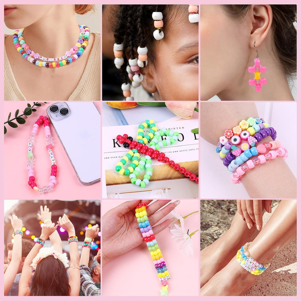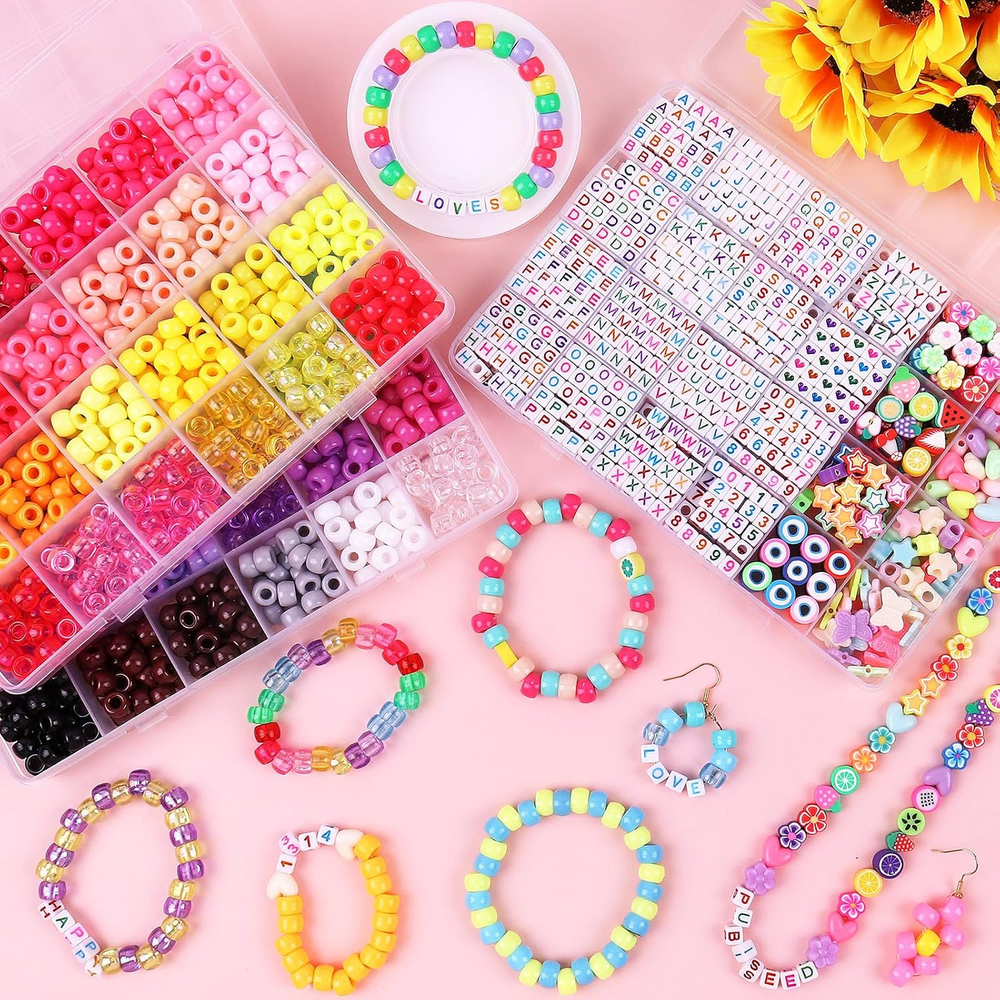 【2303PCS pony beads for jewelry making kit】Our bracelet making kit includes 2 boxes of 48 colors kandi beads with about 1300pcs, approximately 700pcs of full 26 square letter beads, 40pcs round colorful heart beads, 100pcs square colorful number beads, 100 clay beads of four different shapes, 100 plastic beads in four different shapes, 1 roll each of 10Meter elastic string and white nylon string, and 1 roll of 5Meter colorful elastic nylon string. It's perfect for your diverse DIY beads for bracelets. 【Preferred choice for making friendship bracelets】Here is one box of letter beads for bracelets and accessories beads(clay beads, heart beads, star beads, flower beads..etc.) for jewelry making. The alphabet beads assortment meets various word pairing needs, each small cell contains two letters, and the clear grid classification saves time searching for beads. Use pony beads set to make Taylor's album name, your name, lyrics, album title, or phrase onto the bracelet with your friends for Swifties! 【Great for Both Fun and Creativity】Pubiseed kandi bracelet kit is suitable for DIY friendship bracelet beads, letter necklace, rings, hair beads, name keychains, anklets, earrings, hair bands, glasses chains, mobile phone chains, shoelaces, etc. Hand-made is full of fun, Hands-on activities always spark creative inspiration, so indulge in creating jewelry that embodies your unique style. 【FAMILIES TIME】Use friendship bracelet kit to make a bead kit with your friends and families! Avoid electronic products, enhance hands-on ability and color perception, create a fun and harmonious family atmosphere. 【Hassle-free customer service】If you encounter any issues with our bracelet beads, kindly reach out to us. We pledge to furnish a gratifying resolution within 24 hours. For quality-related issues, a replacement or refund is allowed. We extend our heartfelt appreciation for your unwavering support of the Pubiseed brand. Product Description The video showcases the product in use. The video guides you through product setup. The video compares multiple products. The video shows the product being unpacked. Compare with similar items Add to Cart Add to Cart Add to Cart Customer Reviews 4.9 out of 5 stars 93 4.9 out of 5 stars 93 4.8 out of 5 stars 30 4.6 out of 5 stars 25 4.6 out of 5 stars 25 Price $18.99 $ 18 . 99 $19.99 $ 19 . 99 $9.99 $ 9 . 99 — — Material Glass Glass Clay Clay Clay Number of beads 1711 1711 7000 4000 4000 Colors 48 Colors 48 Colors 24 Colors 6 Colors 6 Colors Storage Box 2 Boxes 2 Boxes 2 Boxes 1 Box 1 Box Letter beads include ✘ ✘ ✔ ✔ ✔