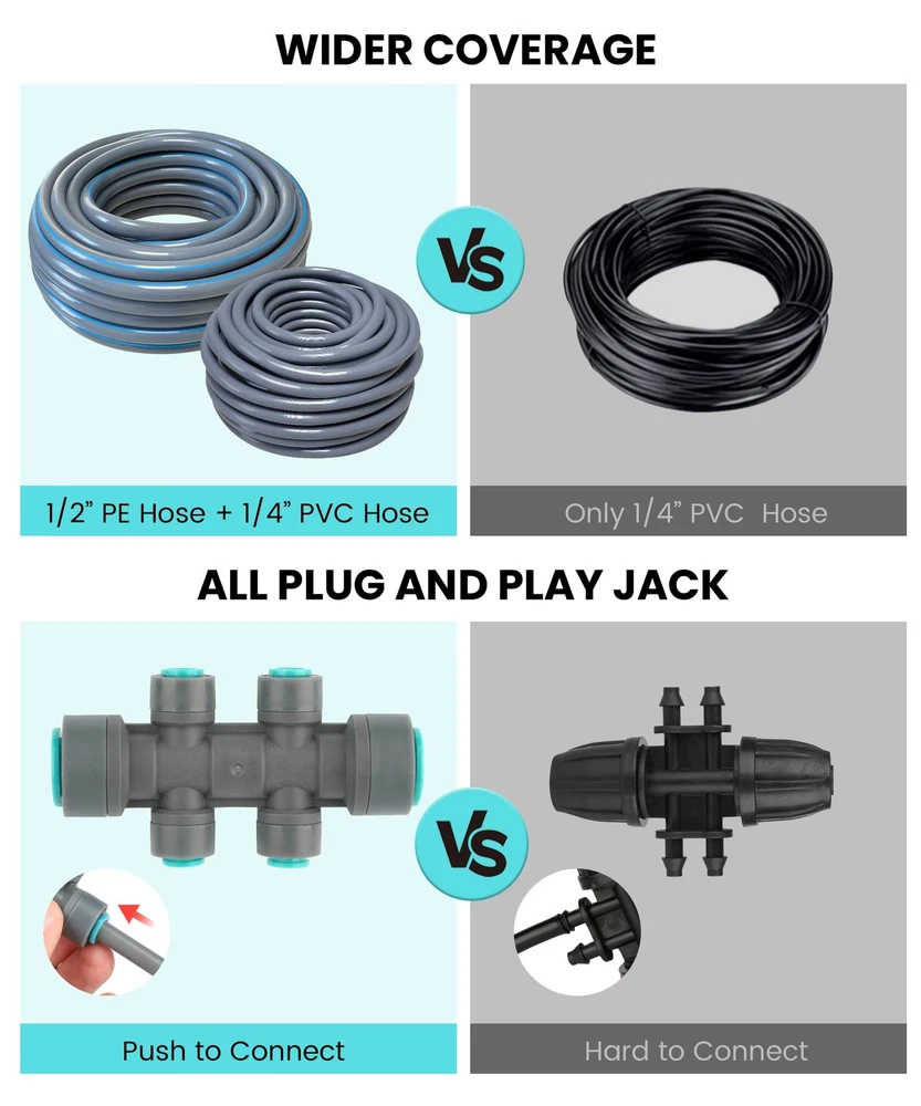 A kit to easily irrigate your garden: The drip irrigation system includes 33 feet of 1/2-inch PE and 197 feet of 1/4-inch PVC irrigation hoses. All interfaces are quick-connect interfaces, making it the most novel and simple irrigation system at present. Quick connection, easy installation: This plant drip irrigation kit is designed with a Y-type diverter main valve and fully quick-connect components, which can be easily installed in minutes. Assembly does not require complex tools or expertise. Multiple watering methods can be achieved: This garden watering system has three adjustable nozzles: Stream Emitter, Vortex Emitter, and Misting Nozzle. It provides precise watering for various plant types to meet diverse needs. Quick Connection Drip Irrigation System: All interfaces are quick-connect. The drip irrigation kit includes 33 feet of 1/2-inch PE and 197 feet of 1/4-inch PVC irrigation hose. Easy installation makes it the most novel and simple irrigation system available. Quick connection, easy installation: This plant drip irrigation kit is designed with a Y-type water distributor and fully quick-connect components, which can be easily installed in minutes. Assembly sprinkler system does not require complex tools or expertise. Multiple watering emitters can be achieved: This garden watering system has three adjustable nozzles: Stream Emitter, Vortex Emitter, and Misting Nozzle. It provides precise watering for various plant types to meet diverse needs. Durable and high-quality materials: This automatic irrigation system is made of sturdy PE and PVC hoses, which are weather-resistant and durable. The detachable emitters and safety connector can be disassembled and used repeatedly, ensuring smooth operation and easy maintenance. DIY multi-scene application: This garden watering system can be flexibly DIY assembled, making it very suitable for gardens, greenhouses, raised bed, flower bed, courtyards, allowing you to water multiple plants with different needs at the same time.