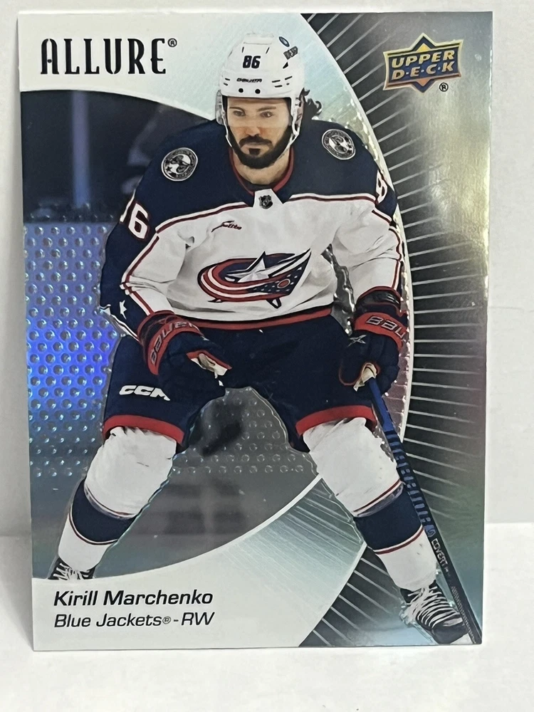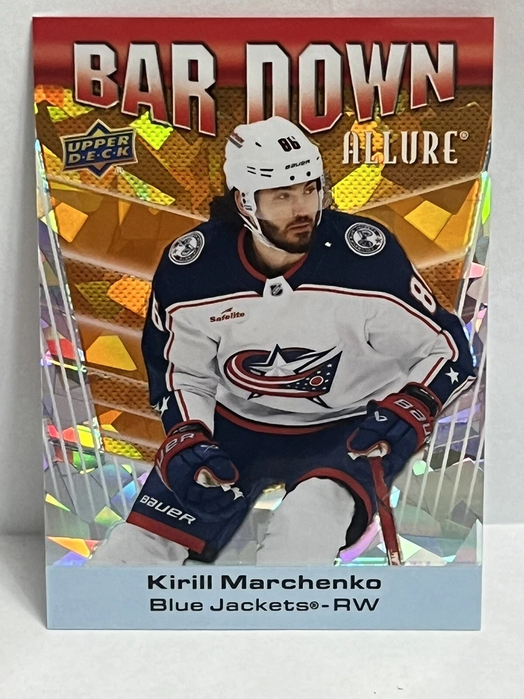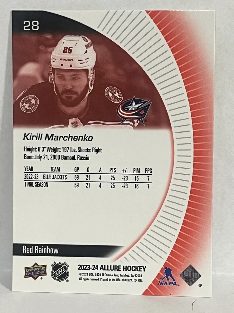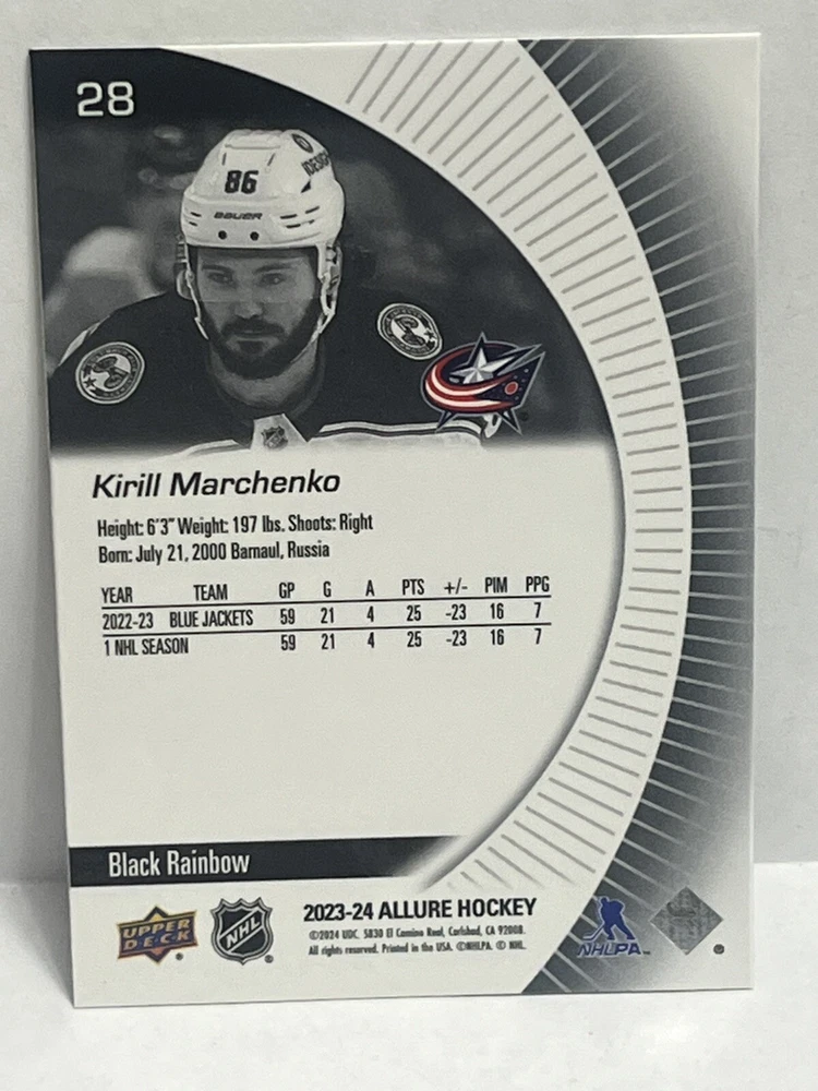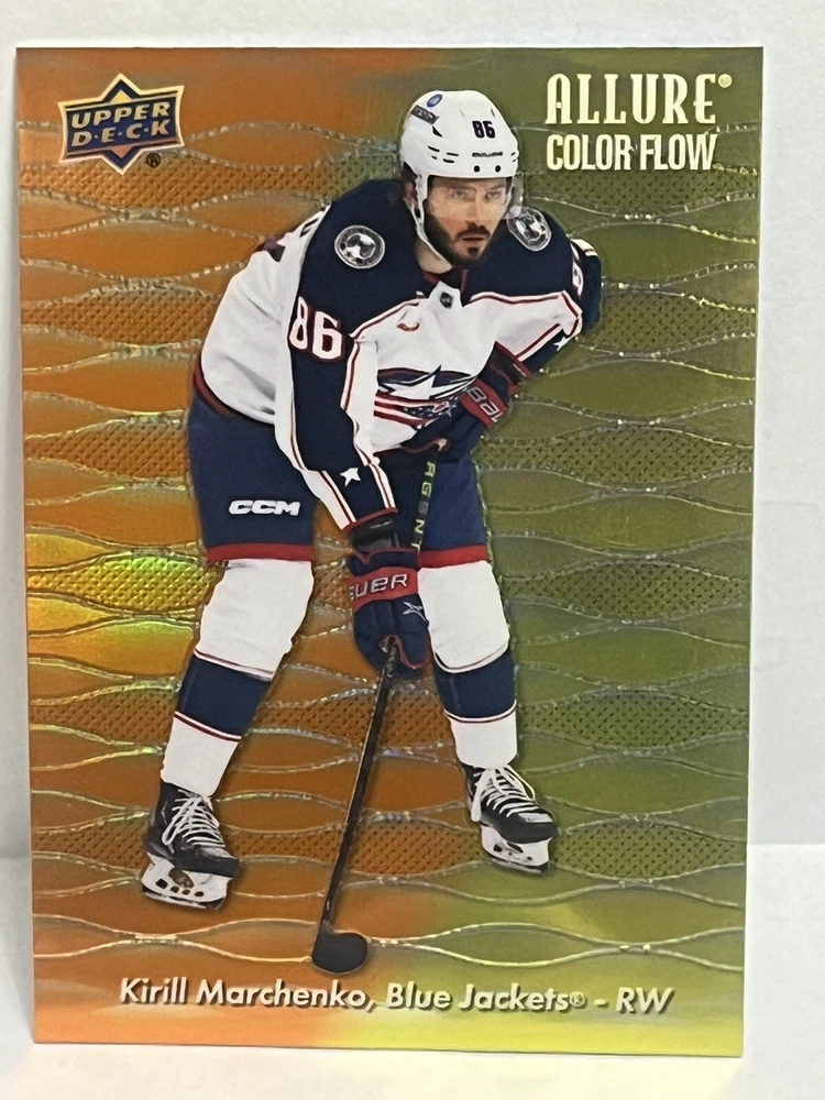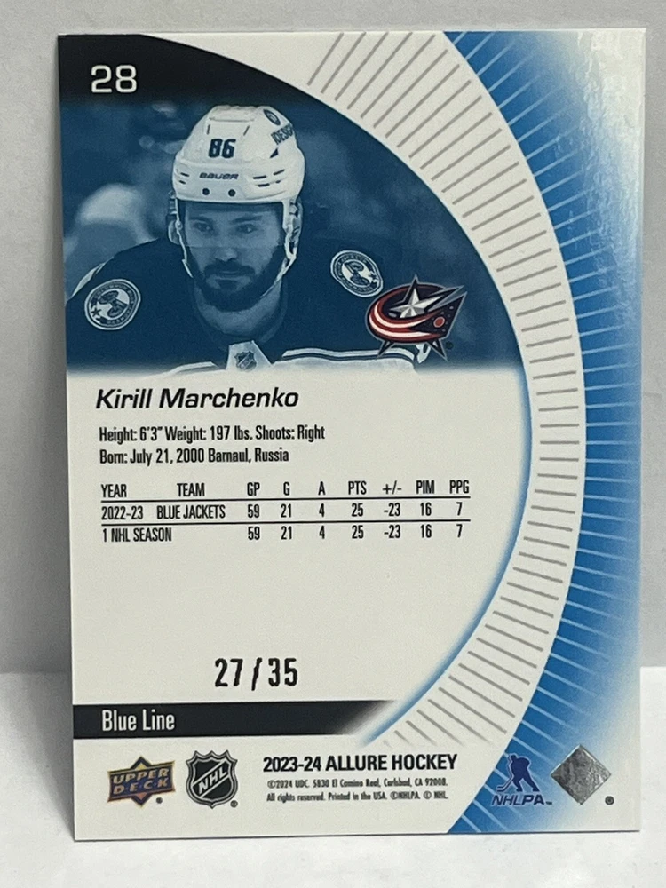 23/24-Allure Kirill Marchenko- Blue Line #27/35 & Orange Bar Down#246/399-Red Rainbow and 2 Color Flow Cards and Black Rainbow,4 Card Lot is a must-have for any Columbus Blue Jackets fan or hockey card collector. This rare set includes a limited print run of 35 cards featuring the talented player. The striking blue parallel and two-color flow cards add a unique touch to this Upper Deck Allure collection, making it a standout addition to any sports trading card collection. Selling 6 cards as is. Seller takes no responsibility for lost or damaged cards on route to buyers destination and any delays in shipping.