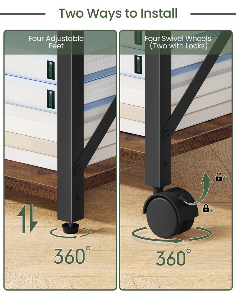 Printer Stand with Wheels/Adjustable Feet The printer stand features premium particleboard with a sturdy metal frame and X -crosses for durability. It has 4 casters and 4 adjustable feet, offering two installation options for flexibility. The larger top meets diverse placement needs, and its rustic brown or solid black finish adds elegance. It's functional and stylish, suitable for home and office use, creating an efficient and comfortable workspace. Spacious Panels for Easy Storage: The wide top, sized 23.6"L x 15"W, easily fits most home printers. The lower shelf offers space for small printers or paper storage. The tiered design maximizes space and versatility for diverse office needs 2 Options for Flexible Use: The printer stand is equipped with 4 casters and 4 adjustable feet for flexible use. The casters, two of which have brakes, allow for easy mobility, while the adjustable feet ensure stable desk placement Versatile Use: The printer table is ideal for storing office supplies like scanners, copiers, and printers. It also doubles as a storage shelf for books, plants, and more, fitting seamlessly into kitchens, living rooms, offices, and other spaces Premium Build for Durability: The printer stand features quality particleboard and a metal frame for durability. The side X-crosses offer excellent stability and support. The top shelf can bear 88 lb Effortless Assembly: With a straightforward structure, clearly numbered parts, easy-to-follow instructions and all necessary tools, you can quickly assemble the print stand and put it into use in no time