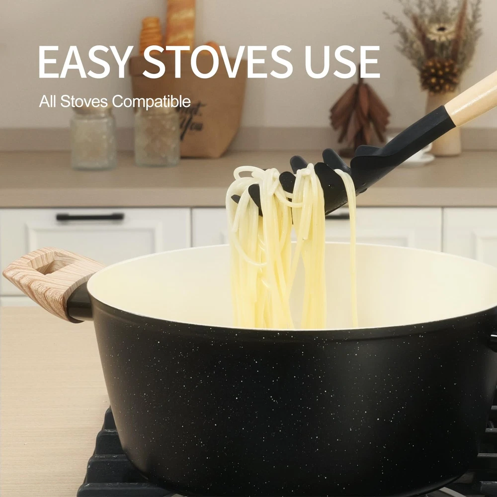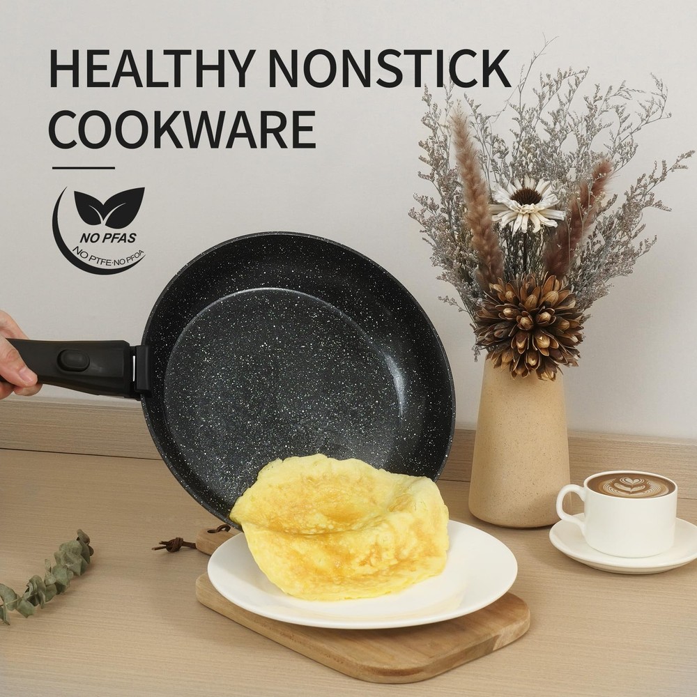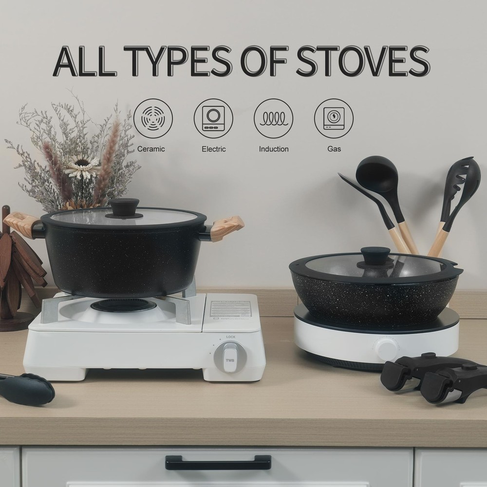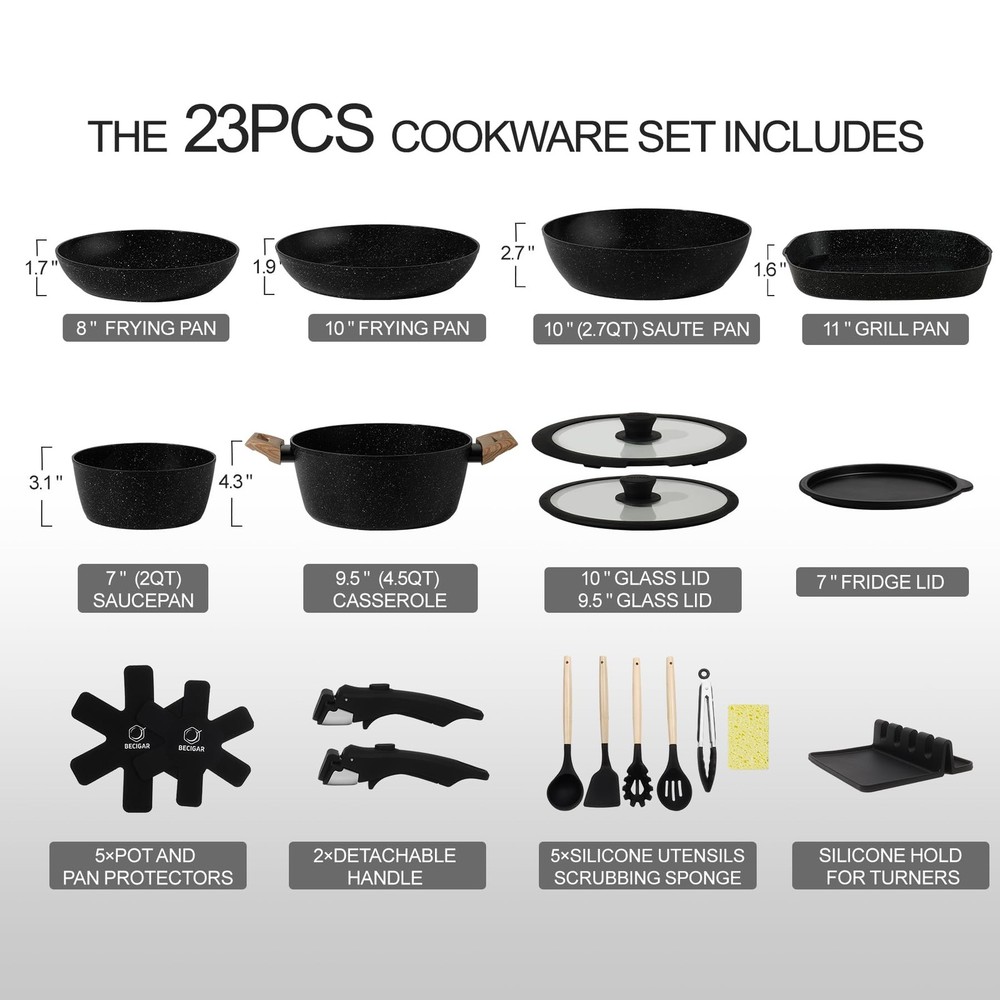 23pcs Ceramic Nonstick Cookware Set, Nonstick Detachable Handle Ceramic Cookware, Induction Kitchen Cooking Set with Removable Handle,include Frying Pans & Saucepans Oven Safe(Black) 1. High-Performance Nonstick Coating: Non-stick performance, PFOS/PFOA free, our cookware ensures your daily cooking is always safer and healthier. 2. Secure Removable Handle: Support up to 22 pounds, the handle is heavy duty tested, fit for removable handle set pots and pans, no need to worry about wobbly handles. 3. Easy Cleaning & Wide Compatibility: Just a cloth and rinse it with water, less water wasted.recommend hand wash,it is really easy to clean. with extended bottom design. Our nonstick cookware can work on all cooktops, including induction. 4. Stackable and Compact: Save up to 75% more space with stackable pots and pans set and detachable handles, allowing for storage in cabinets or RVs. 5. 23PCS Granite Cookware Set: 8 Inch 11 Inch Frying Pan ,10.5 Inch Grill Pan , 1.6” Qt 7” SaucePan with Fridge Lid, 10” Saute Pan with Lid, 4.3Qt 9.5” Casserole with Lid, 2 x Detachable Handle , 5 x Pot and Pan Protectors,4 x Silicone Turner and Soup Ladle,1x Tongs, 1 x silicone holder for turners,1 x scrubbing sponge