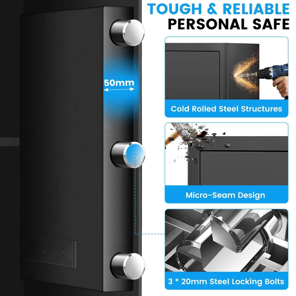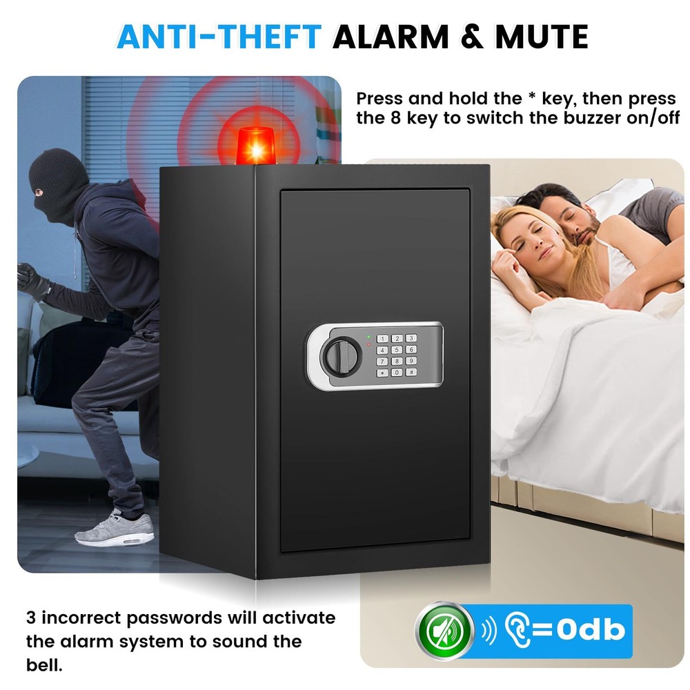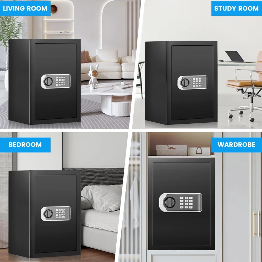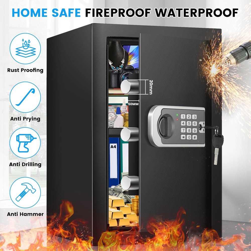 2.4 Cuft Home Safe, Safe Box Fireproof Waterproof, Fireproof Safe for Home with Electronic Keypad, Spare Key, Smart Alert, Mute Mode, Anti-Theft Fireproof Safe for Document Money Valuable 【SAFE BOX FOR HOME USE】 The exterior dimensions of our home safe are 13.78‘ x 12.20’ x 16.54'. Therefore, it is perfect for storing sensitive documents, spare credit cards, passports, medications, car keys, guns and valuables. It can be easily concealed in the home, making it ideal for those who want to protect their belongings from the prying eyes of children or friends/family/acquaintances. 【STEEL STRUCTURE & THICKENED BOX DOOR】 The security safe is made of sturdy cold-rolled steel, which has good rust resistance and high temperature resistance, making it strong and durable. It also features 3 round 20mm locking bolts, a 50mm thick door and a micro-seam design that is impact and pry-resistant, providing safer and more reliable protection. 【BURGLAR ALARM & SILENT MODE】 This anti-theft safe is equipped with an intelligent alarm system to prevent unauthorised access. If the combination is entered incorrectly 3 times in a row, the system will automatically lock and sound an alarm. If you are worried that the beeping sound of the safe is disturbing others, you can also set it to silent mode and turn it back on when you need to prevent burglary. 【FIREPROOF & WATERPROOF DOCUMENT BAG】Our safe box comes with a fireproof and waterproof document pocket. You can place your cash, jewellery and important documents in the fireproof bag before placing them in the safe, so you will be doubly protected in the event of a fire or rainstorm. 【DIGITAL SAFE WITH COMBINATION LOCK】 Our safes come with a programmable keypad, 2 spare keys and an external battery compartment. The digital keypad has a responsive touchpad that makes it easy to set and change passwords, and if you forget your password, you can use the spare keys to open the safe. If you can't find the key or the battery runs out, simply plug the external battery pack into the safe. 【FIXED TO WALL/FLOOR】 There are 2 pre-drilled holes on both the back and bottom panel of the document safe, which can help you fix the safe in inconspicuous places such as under cabinets/desks, effectively preventing people from stealing your stuff quickly. Therefore, it is very suitable to be used as a security setup for homes, hotels, dormitories and offices. 【REMOVABLE SHELVES & LED LIGHTS】 Our Personal Security Safe comes with a removable shelves, so you can adjust the storage space of the safe according to your needs. In addition, this safe has a built-in LED light for quick access to your belongings at night. Shipping We offer FREE shipping on all orders! We ship within Three business days of payment, usually sooner. We use a selection of shipping services such as UPS, FedEx, USPS etc. We only ship to the lower 48 states, no APO/FPO addresses or PO Boxes allowed. Local pickups and combined shipping options are not provided at this time. Return You can return a product for up to 30 days from the date you purchased it. Any product you return must be in the same condition you received it and in the original packaging. Please keep the receipt. Payment We accept payment by any of the following methods: PayPal Please pay as soon as possible after winning an auction, as that will allow us to post your item to you sooner! Feedback Customer satisfaction is very important to us. If you have any problem with your order, please contact us and we will do our best to make you satisfied. Contact Us If you have any queries, please contact us via ebay. We usually respond within 24 hours on weekdays. Please visit our eBay store to check out other items for sale! Thank you for shopping at our store.