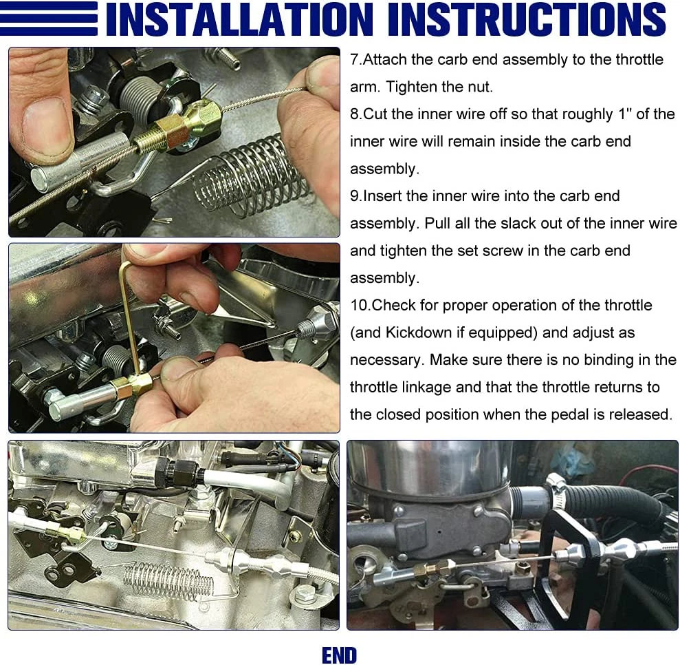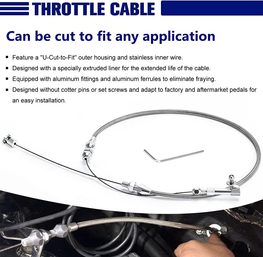 The braided throttle cable is universal to use, can be cut to fit any application.(you need additional parts to make it fit at some situation) The PQY throttle cable is made of high quality stainless steel,equipped with aluminum fittings and aluminum ferrules to eliminate fraying. has the U-cut-to-fit outer housing, is available in 24 or 36 inch lengths with a u-cut-to-fit stainless inner wire. The throttle cable is designed without cotter pins or set screws and adapt to factory and aftermarket pedals for an easy installation. Package include 1pcs 24 inch throttle cable and 1pcs allen wrench. Product Description Installation Tips: 1. Before beginning the installation, disconnect the negative battery cable and use wheel chocks to block the vehicle's wheels. 2. The hole in the firewall must line up with the hole in the upper arm on the Throttle Pedal. Determine exactly where the Throttle Cable needs to pass through the firewall. 3. Remove the carb end assembly. Pull the inner wire out of the cable housing,insert the firewall fitting through the firewall from the engine side. 4. Insert the throttle cable adjuster into the Cable Mounting Bracket. NOTE:There must be some slack to allow for engine movement. 5. Reinstall the inner wire into the cable housing from inside the passenger compartment. Connect the clevis (or the ball end if the clevis was removed) to the Throttle Pedal. 6. Attach the carb end assembly to the throttle arm. Tighten the nut. 7. Cut the inner wire off so that roughly 1" of the inner wire will remain inside the carb end assembly. 8. Insert the inner wire into the carb end assembly. Pull all the slack out of the inner wire and tighten the set screw in the carb end assembly. 9. Check for proper operation of the throttle (and Kickdown if equipped) and adjust as necessary. Make sure there is no binding in the throttle linkage and that the throttle returns to the closed position when the pedal is released.