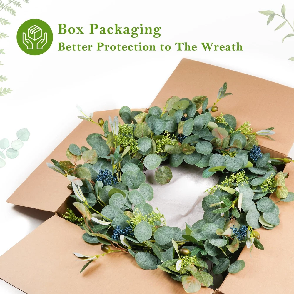 Eucalyptus Wreath for Front Door, 24 Inch Eucalyptus Wreath with Olive Leaves and Berries All Year Round, Handmade Green Spring Summer Wreaths for Front Door Indoor Outdoor Wedding Holiday for all seasons 【Large Size】 Fully expanded eucalyptus wreath, the inner diameter is about 30cm/12 in, the outer diameter is about 61cm/24 inches. To prevent damage to the 24 inch eucalyptus wreath during shipping, the summer wreath is tightened. Please follow our instructions to fluff the leaves before hanging it. If you want to it temporarily, the leaves can be easily tightened so you can fit it into a smaller space. 【Lifelike】 This Eucalyptus wreaths for front door is made of more than 3 types of eucalyptus leaves with different colors, and some olive leaves, and it is additionally dotted with blue/white berries, which makes it look more vibrant and natural. Front door wreaths for all seasons keeps blooming and could be used for a long time. 【Beautiful All Year Round】 The eucalyptus leaves are silk so they never fall, the berries are foam so they never rot. No maintenance, no management required. Eucalyptus year round wreaths for front door looks full and fresh every day. 【Add Something You Like】 Vine Branch instead of plastic, which is convenient for you to snap other decoration to the eucalyptus wreath. You can add maple leaves and pumpkins to eucalyptus wreath in autumn, and you can add bells and stars at Christmas. You will find that your wreath is most unique when you design it yourself. 【Application】 Year round wreaths for front door to welcome guests, hang it above your fireplace, or on a living room wall to brighten up your home. This 24inch summer wreath is also suitable as wedding wreath, welcome wreath, spring wreaths, eucalyptus Wreath for sitting room, wedding scene, wedding car, photography background etc. It also makes a great gift for weddings, housewarming, Mother's Day,birthday and other holidays. 【Our 】 We are a company with years of professional experience in designing, developing and manufacturing indoor and outdoor decorative artificial plants with the best quality. Because the 24 inch eucalyptus wreath is handmade, the size will vary slightly. If there are any problems with our products, please 【】 at the first time, we will definitely give a perfect answer.