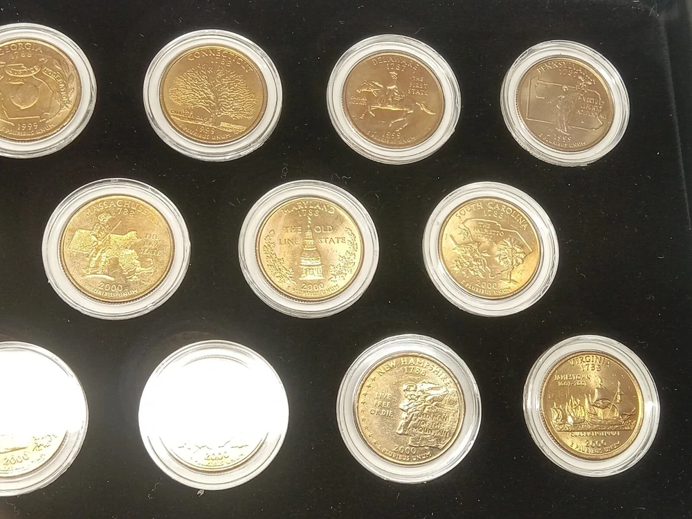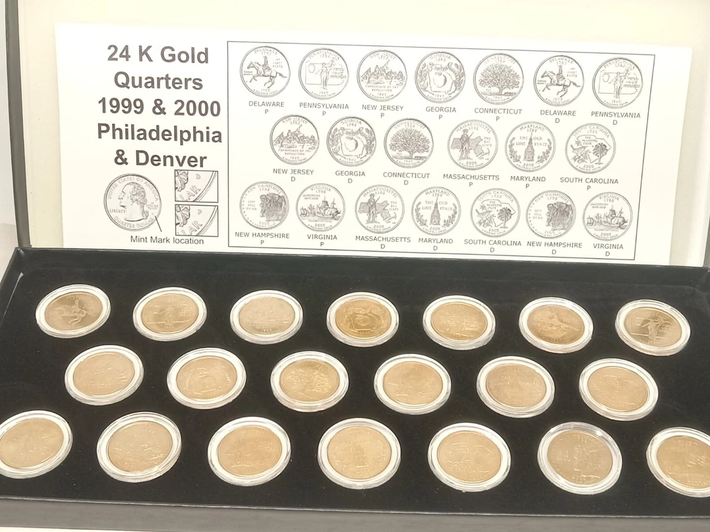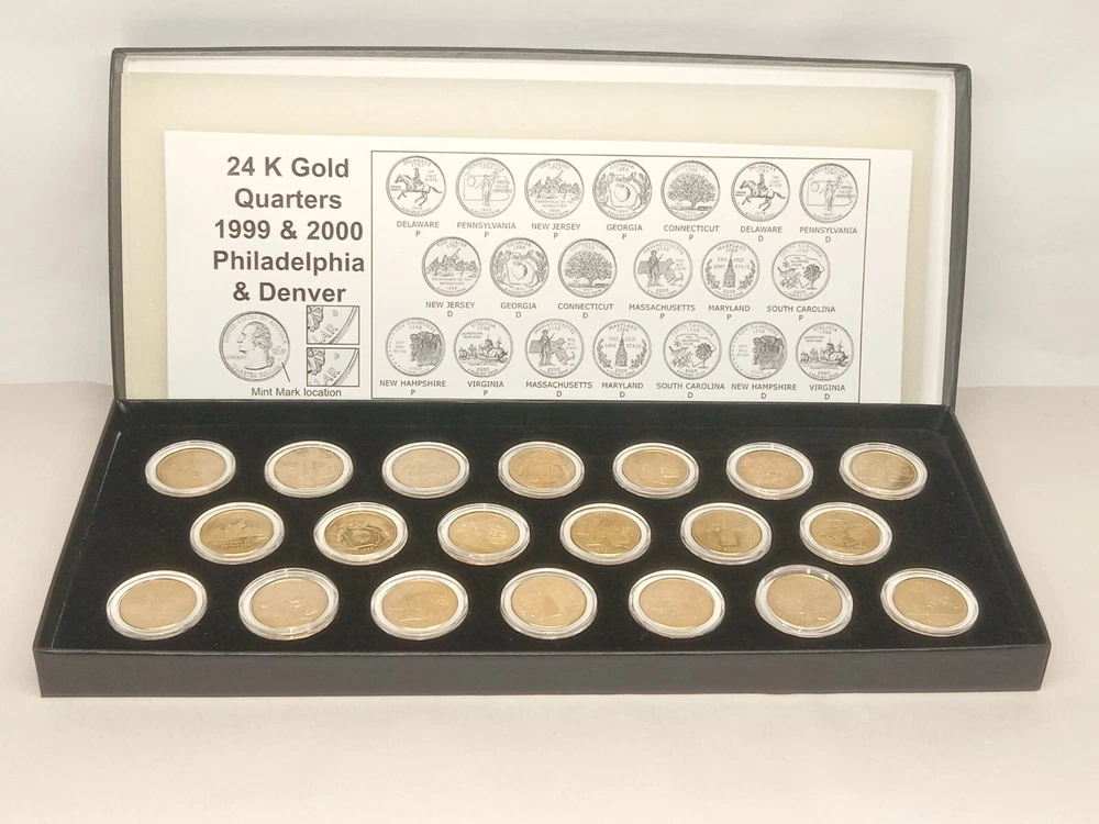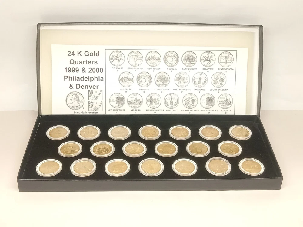 Add some shine to your coin collection with this stunning "24K gold quarters from 1999 and 2000 Philadelphiaand Denver" set. These uncirculated coins feature the Philadelphia and Denver state designs and are perfect for adding to your collection or gifting to a fellow coin enthusiast. The coins are ungraded and uncertified, making them a unique addition to any collection. The denomination of these coins is 25C and they were struck as business strikes with a golden finish. Don't miss out on the opportunity to own a piece of United States history with these beautiful state quarters. This is the first set of 20 Quarters. All Philadelphia and all Denver State Quarters for the years of 1999 and 2000. These awesome coins are perfect for an investment piece. Great designs and with the gold coloring instead of the normal color they really stand out in a wishing well. 24 K gold (they are not solid 24 K .999 Gold) They do have the original paper and case with holder for all coins in this 20 Coin set.