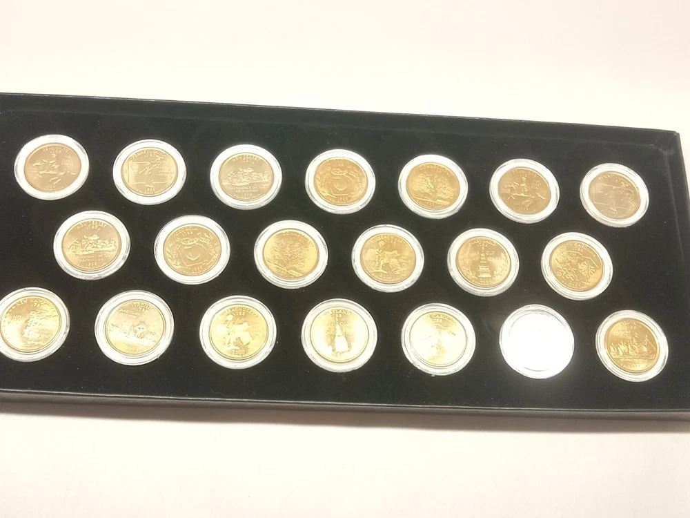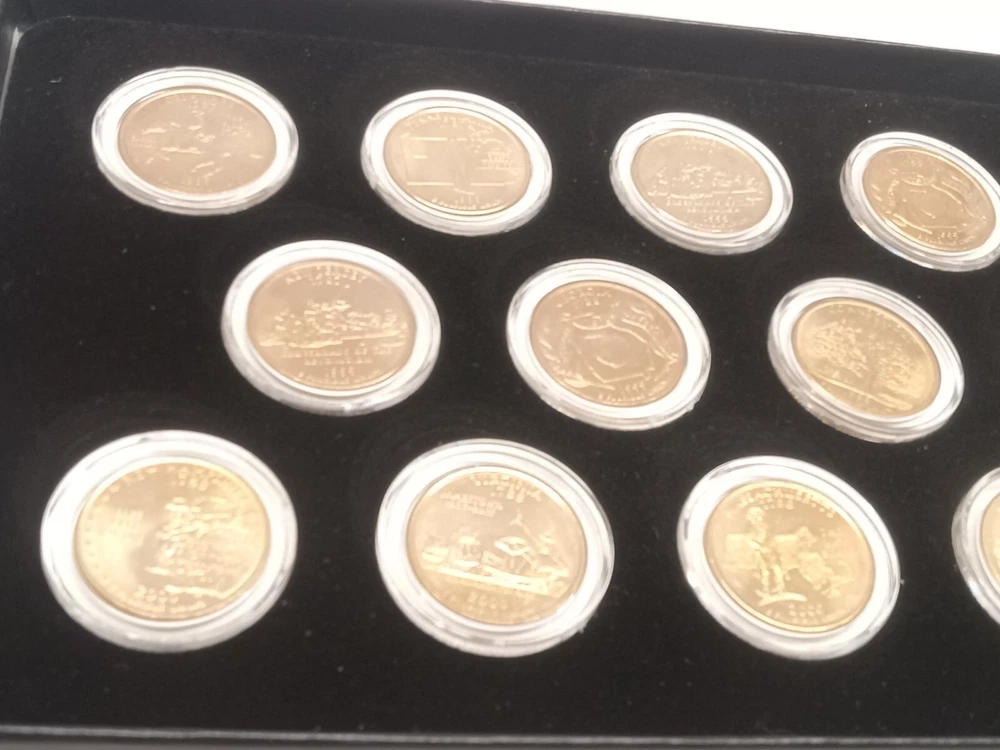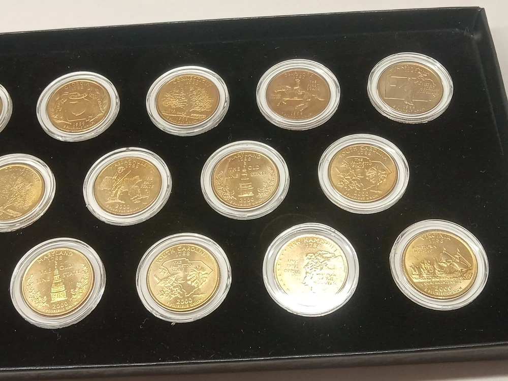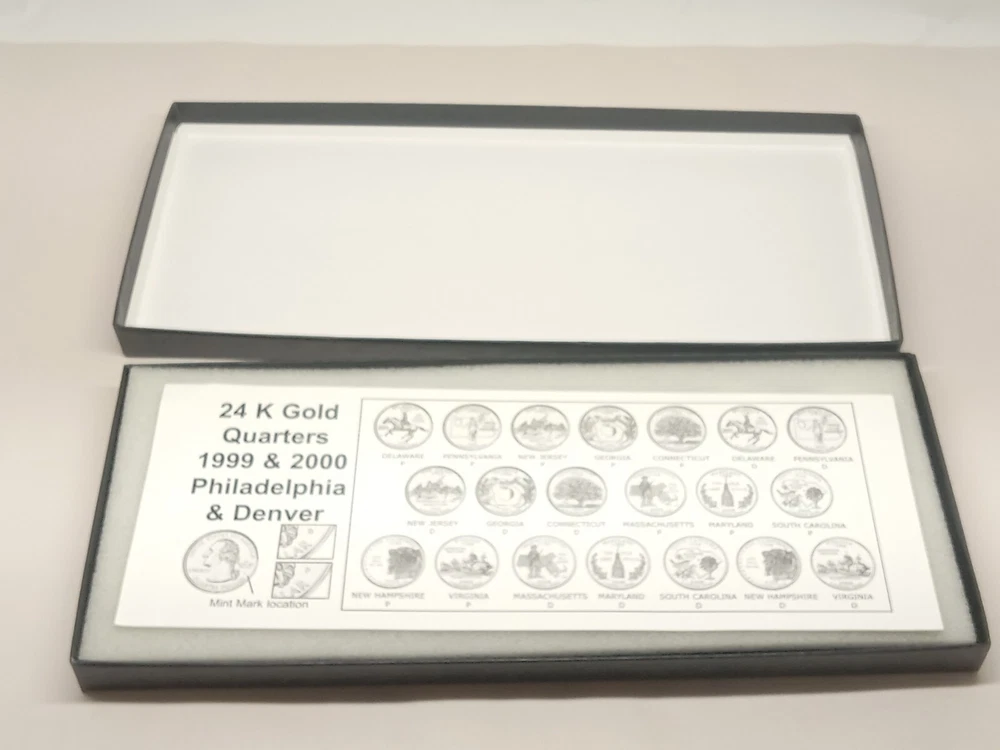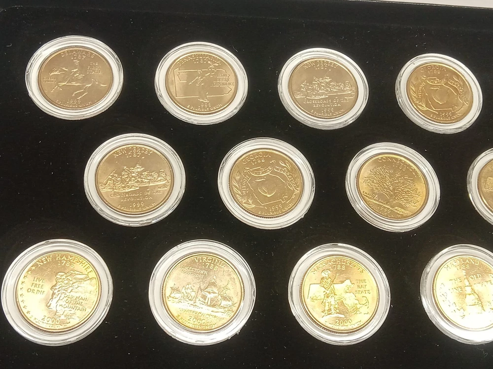 Add some shine to your coin collection with this stunning "24K gold quarters from 1999 and 2000 Philadelphiaand Denver" set. These uncirculated coins feature the Philadelphia and Denver state designs and are perfect for adding to your collection or gifting to a fellow coin enthusiast. The coins are ungraded and uncertified, making them a unique addition to any collection. The denomination of these coins is 25C and they were struck as business strikes with a golden finish. Don't miss out on the opportunity to own a piece of United States history with these beautiful state quarters. This is the first set of 20 Quarters. All Philadelphia and all Denver State Quarters for the years of 1999 and 2000. These awesome coins are perfect for an investment piece. Great designs and with the gold coloring instead of the normal color they really stand out in a wishing well. 24 K gold (they are not solid 24 K .999 Gold) They do have the original paper and case with holder for all coins in this 20 Coin set.