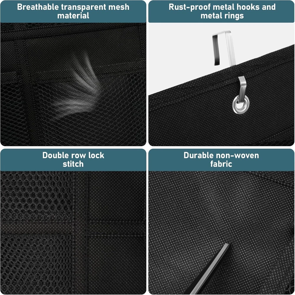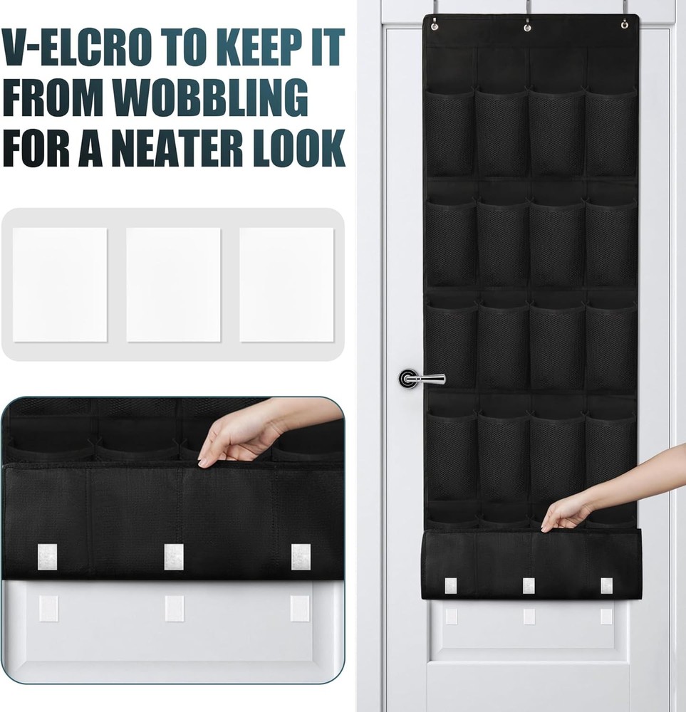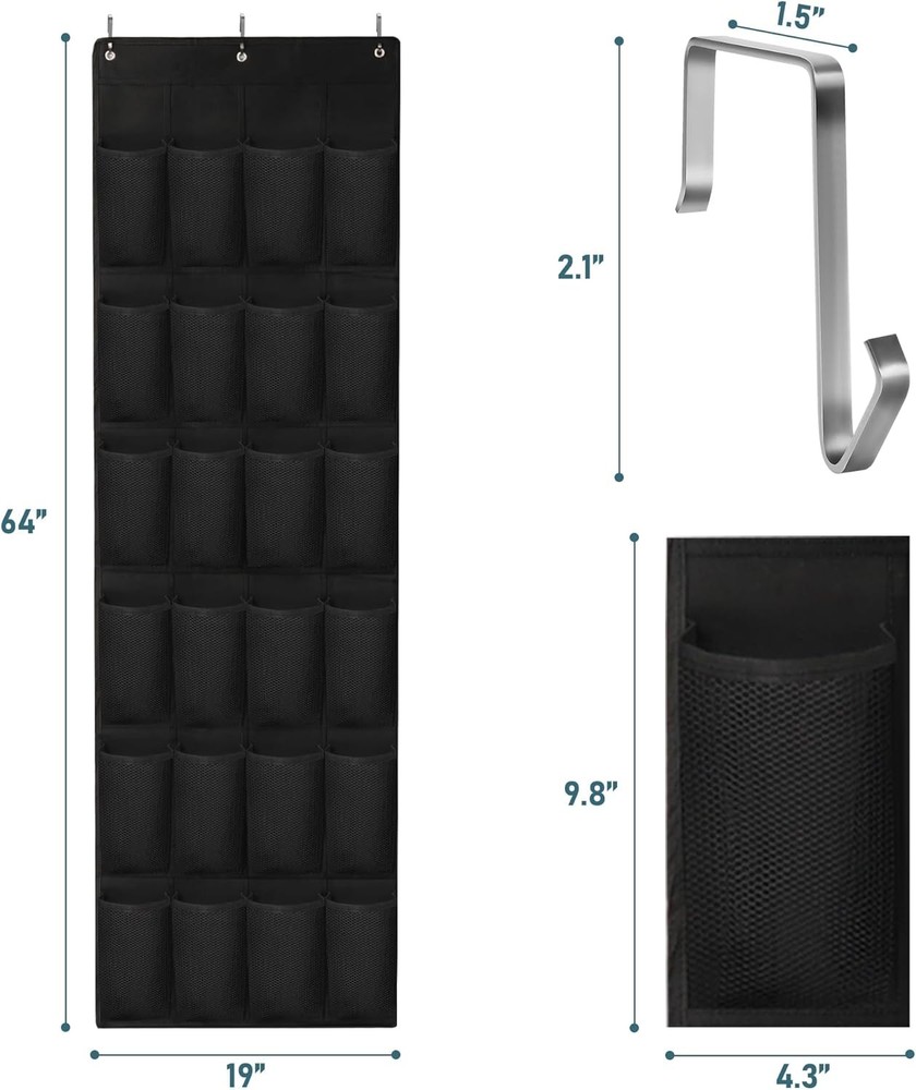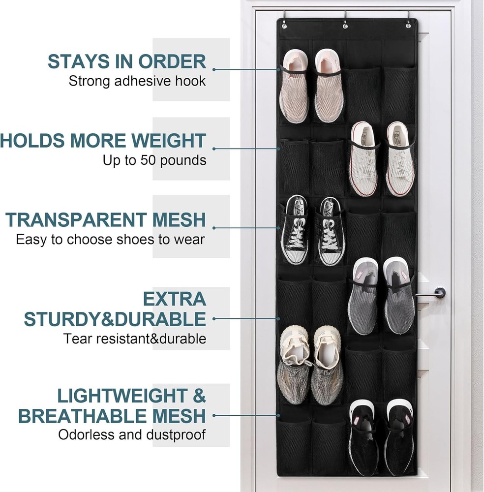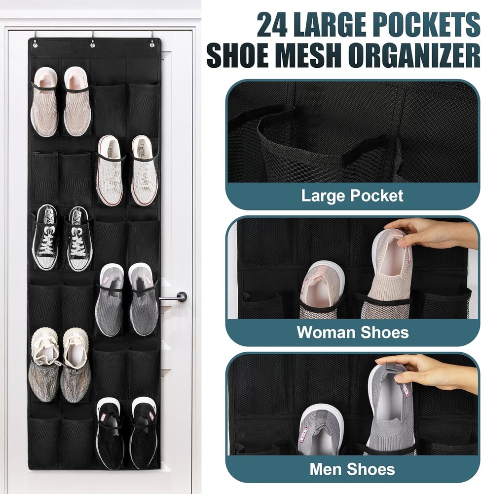 24 Large Pockets Upgraded Over the Door Shoe Organizer, Enhanced Black Product Details Specific Uses For Product: Shoes Material: Non-Woven Mesh Special Feature: Portable, Moistureproof, Abrasion Resistant, Foldable Color: Black Brand: HARBULE Product Dimensions: 62"D x 4.5"W x 19"H Shape: Rectangular Capacity: 4E+1 Pounds Unit Count: 1.0 Count Number of Items: 1 Maximum Weight Recommendation: 40 Pounds Manufacturer: HARBULE Part Number: over the door shoe organizer Item Weight: 0.317 ounces Country of Origin: China Item model number: Triple Hook 24 Compartment Hanging Bag Item Package Quantity: 1 Special Features: Portable, Moistureproof, Abrasion Resistant, Foldable Included Components: Hooks Batteries Included?: No Batteries Required?: No Specific Uses For Product: Shoes Material: Non-Woven Mesh Special Feature: Portable, Moistureproof, Abrasion Resistant, Foldable Color: Black Brand: HARBULE Product Dimensions: 62"D x 4.5"W x 19"H Shape: Rectangular Capacity: 4E+1 Pounds Unit Count: 1.0 Count Number of Items: 1 Mounting TypeNumber of Compartments: Hanging Mount24 DIFFERENT FROM OTHERS: This door hanging shoe storage box has 24 pockets and can hold up to 40 pounds of items. Contains three V-elcro stickers to prevent shaking, made of durable non-woven fabric with thick stitching and tear resistance. Durable and able to accommodate all your shoes. HIGH QUALITY BREATHABLE MATERIAL: This hanging shoe rack for door has high breathability, and the mesh pocket promotes air circulation, allowing the shoes to dry quickly. In addition, the transparent mesh fabric makes it easy to quickly find each pair of shoes. NOT JUST FOR SHOES: Measures 62 by 19 inches with each pocket measuring 7.8 by 4.3 inches,over the door shoe rack superior choice for storing nearly anything.Easily store crafting supplies, pantry items, beauty items, or household cleaning supplies in a highly organized and efficient manner. NO HARDWARE SETUP REQUIRED: Organizers can easily hang this hanging shoe rack for closeton most doors, including closets, mud rooms, bathrooms, garages, and other places. Say goodbye to bulky storage boxes that consume valuable space. Eazy to fold, and convenient to store when not in use. YOU WILL GET: 1* shoe rack for front door entrance Pocket, 3* Over the Door Hooks, 3* Double Sided Tape. Each pocket is 9-1/2“ high and 4-1/3” Warm tips adult shoes in a bag to put a shoe more convenient to take and put.If you have any questions, please feel free to contact us, we will reply you within 24 hours.