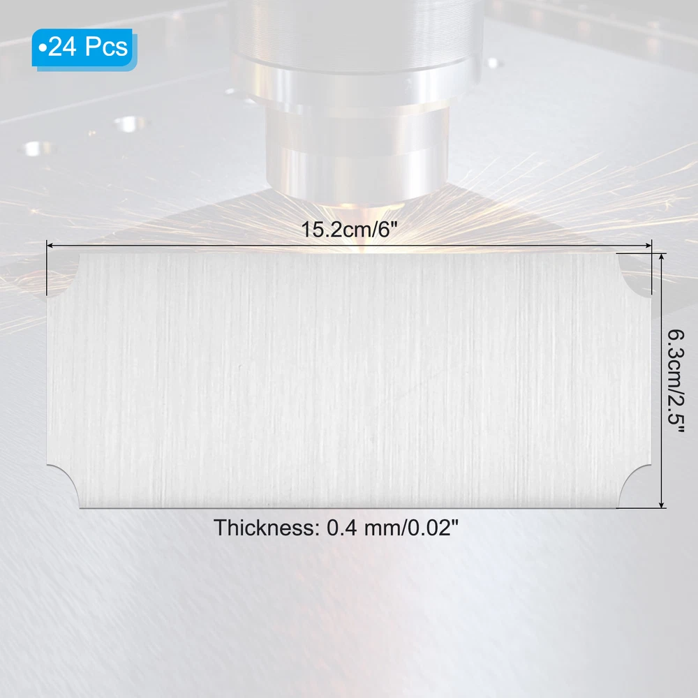 Document Our engraved nameplates are perfect for mounting on plaques, picture frames, sweaters, trophies, bags, display boxes, flag cases, and anything else.SpecificationMaterial: Stainless SteelColor: Silver ToneSize: 15.2 x 6.3 cm/6 x 2.5 Inch(L*W)Thickness: 0.4 mm/0.02 InchPacking List: 24 Pcs x Engraved NameplateAdvantageOur engraved nameplates are made of brushed stainless steel which is durable, stable, not easy to fade, rust, or break, and can be used for a long time. With a smooth surface, it will not scratch your skin.The right thickness makes the plate stronger and allows for deeper engraving. These elegant nameplates have a beautiful luster and a simple design. Suitable for various crafts to add brilliance.The protective film design can effectively prevent scratches. The adhesive backing design allows you to stick this nameplate anywhere without any tools and it can be firmly on the objects.InstructionPlace a metal workbench block underneath the blank stamping tags for better stamping.NOTE:1. There may be light scratches and blemishes due to shipping, but they can be polished.2. Only for laser engraving, not suitable for mechanical engraving.3. Please remove the protective film before use. 24 Pcs 6" x 2.5" Engraved Name Plate Picture Frame Label Art Tag, SiLver Tone Our engraved nameplates are perfect for mounting on plaques, picture frames, sweaters, trophies, bags, display boxes, flag cases, and anything else. Specification Material: Stainless Steel Color: Silver Tone Size: 15.2 x 6.3 cm/6 x 2.5 Inch(L*W) Thickness: 0.4 mm/0.02 Inch Packing List: 24 Pcs x Engraved Nameplate Advantage Our engraved nameplates are made of brushed stainless steel which is durable, stable, not easy to fade, rust, or break, and can be used for a long time. With a smooth surface, it will not scratch your skin. The right thickness makes the plate stronger and allows for deeper engraving. These elegant nameplates have a beautiful luster and a simple design. Suitable for various crafts to add brilliance. The protective film design can effectively prevent scratches. The adhesive backing design allows you to stick this nameplate anywhere without any tools and it can be firmly on the objects. Instruction Place a metal workbench block underneath the blank stamping tags for better stamping. NOTE: 1. There may be light scratches and blemishes due to shipping, but they can be polished. 2. Only for laser engraving, not suitable for mechanical engraving. 3. Please remove the protective film before use. Hot Item Payment 1.We accept eBay payment . 2.Payment must be received within 7 business days of auction closing. Shipping 1.We ship to your eBay or Paypal address. Please make sure your eBay and Paypal address is correct before you pay. 2.Items will be shipped within 1-3 business day when we received payment. 3.Delivery time depends on destination and other factors. Description Policy 24 Pcs 6" x 2.5" Engraved Name Plate Picture Frame Label Art Tag, SiLver Tone Our engraved nameplates are perfect for mounting on plaques, picture frames, sweaters, trophies, bags, display boxes, flag cases, and anything else. Specification Material: Stainless Steel Color: Silver Tone Size: 15.2 x 6.3 cm/6 x 2.5 Inch(L*W) Thickness: 0.4 mm/0.02 Inch Packing List: 24 Pcs x Engraved Nameplate Advantage Our engraved nameplates are made of brushed stainless steel which is durable, stable, not easy to fade, rust, or break, and can be used for a long time. With a smooth surface, it will not scratch your skin. The right thickness makes the plate stronger and allows for deeper engraving. These elegant nameplates have a beautiful luster and a simple design. Suitable for various crafts to add brilliance. The protective film design can effectively prevent scratches. The adhesive backing design allows you to stick this nameplate anywhere without any tools and it can be firmly on the objects. Instruction Place a metal workbench block underneath the blank stamping tags for better stamping. NOTE: 1. There may be light scratches and blemishes due to shipping, but they can be polished. 2. Only for laser engraving, not suitable for mechanical engraving. 3. Please remove the protective film before use. Hot Item Payment 1.We accept eBay payment . 2.Payment must be received within 7 business days of auction closing. Shipping 1.We ship to your eBay or Paypal address. Please make sure your eBay and Paypal address is correct before you pay. 2.Items will be shipped within 1-3 business day when we received payment. 3.Delivery time depends on destination and other factors.