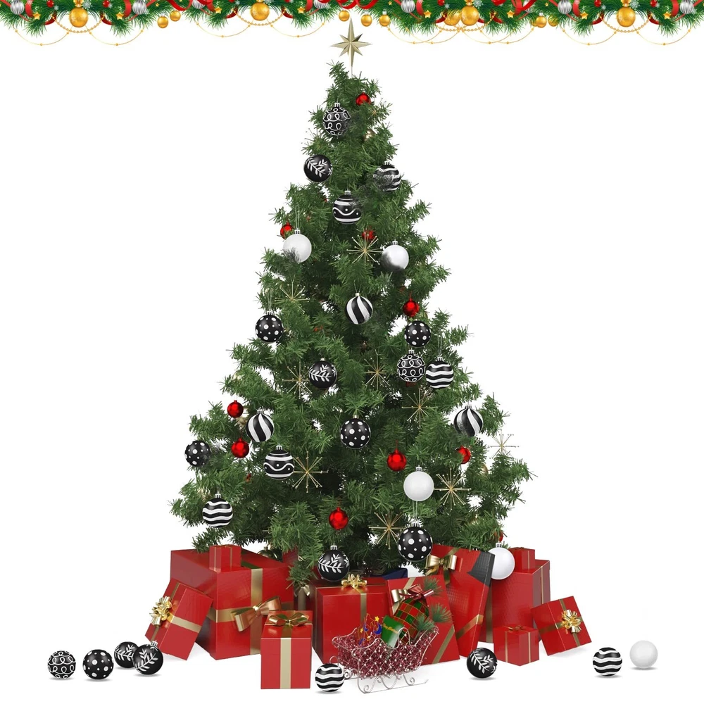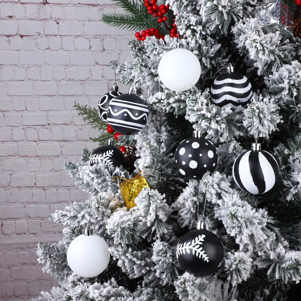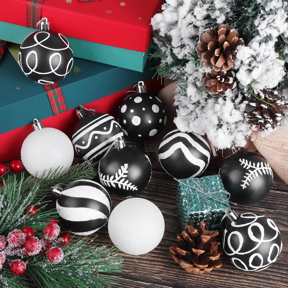 Specification: Material: plastic Color: as shown in the pictures Size: 2.36 inches / 6 cm in diameter Quantity: 24 Package includes: 18 x colored balls 3 x shiny balls 3 x glitter powder balls Warm note: Please allow slight difference on size due to manual measurement. Package includes: you will receive 24 Christmas balls in 8 styles, namely, 6 kinds of colored balls, 1 shiny ball, 1 glitter powder ball, 3 pieces for each style, with rich styles and quantities, Christmas ball ornaments can meet your Christmas decoration needs Shatterproof Christmas ball: the colored decoration baubles are made of durable and environment-friendly plastic with an excellent shatterproof property; the surface of the Christmas balls is decorated with glitter powder, the Christmas hanging ornaments are practical and decorative, ideal for home decoration Decorating your Christmas: we provide you with a variety of styles of Christmas balls, bringing joy and romance to your Christmas, you can enjoy the joy of decorating the Christmas tree with your family members, giving you a memorable and happy Christmas Wide uses: the Christmas ball ornaments can not only be used to decorate the Christmas tree, but also can be used to DIY wreaths to decorate living rooms and hallways, making your home attractive; the shatterproof decorative balls can also be used as ideal gifts for your family members and friends Color and size: the Christmas hanging ornaments are in black and white, the size of them is 2.36 inches / 6 cm in diameter; please note that there will be some glitter powder falling during transportation, you don't need to worry about affecting the appearance and use