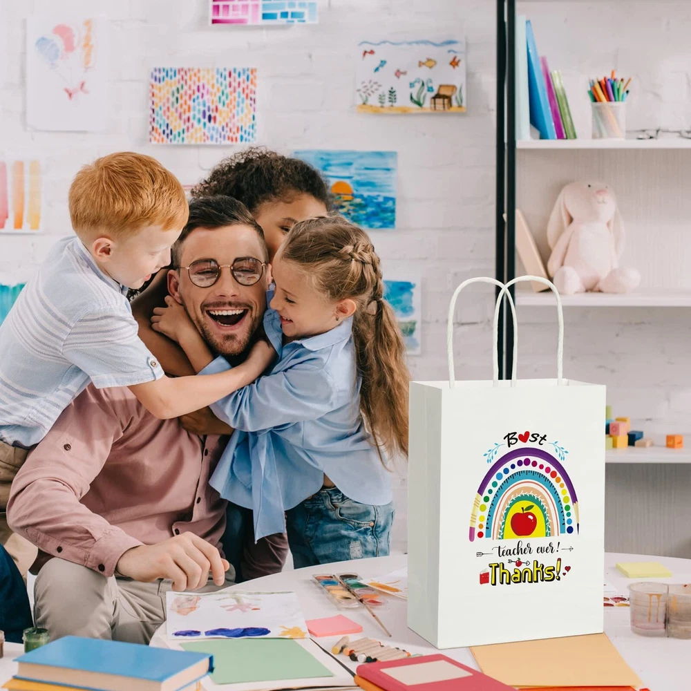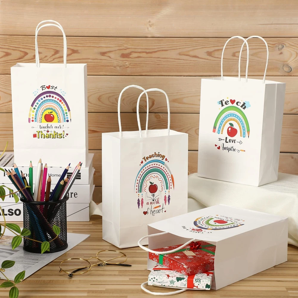 Features: Joyful atmosphere: These cute and funny designed paper party favor bags can put you in a better mood, you can use them to wrap gifts and make the person who receives them happier and feel the sincere thought Easy matching: bags design is simple and easy to match with various gifts, the colors are coordinated and will not stand out, not only as teachers appreciation day gift for teachers, but also for birthday gift packaging, candy bags, shopping bags, etc. Specifications: Material: kraft paper Color: as shown in the picture Size: approx. 15 x 8 x 21 cm/ 5.9 x 3.15 x 8.3 inch Package includes: 24 x Paper bags Notes: Manual measurement, please allow slight errors on size. The color may exist a slight difference due to different screen displays. The words printed on the product are not as trademark or brands, just for decoration. What You Will Receive: you will receive 4 styles, 6 of each style, a total of 24 teacher gift bags; Enough quantity and a variety of styles to meet most of your usage needs; The interesting design on the paper bag can make your mood happy and add fun to your life Size and Material Information: the size of each gifts bags is approx. 15 x 8 x 21 cm/ 5.9 x 3.15 x 8.3 inch; And we apply high impact kraft paper material to make our beautiful bags, the surface is very smooth, better aesthetics, very suitable as a teacher's appreciation day gifts to show sincere thanks and gratitude Reusable and Reliable: our teacher graduation gifts bags are made of high impact kraft paper, which is safe to use; Our products are also suitable for many occasions and can meet most of the daily storage and packaging of small items Gift Bags for Teachers: end of the year gifts for teachers bag printed with the words “T takes a big heart to help shape little minds, Teach Love Inspire, Teaching is a work of heart, Best teacher ever! Thanks!”, which are suitable for teachers of all subjects; You can give them to your male teachers, female teachers, Chinese teachers, English teachers, math teachers, etc Practical and Wide Application: teacher appreciation gift bag with thin paper are accessible for wrapping teacher appreciation day gifts such as flowers, chocolates, scarves, books, clothing, jewelry, home accessories or a range of small items; You can apply this teacher gift bag to wrap or package your gift to make your gift interesting