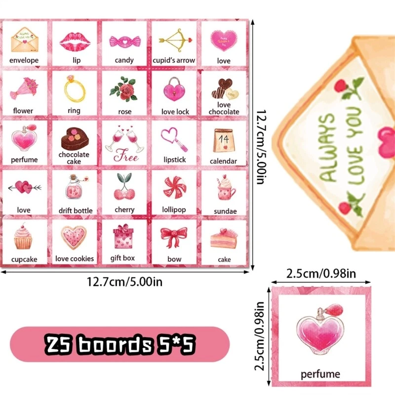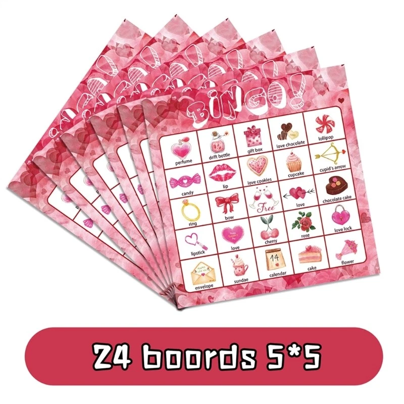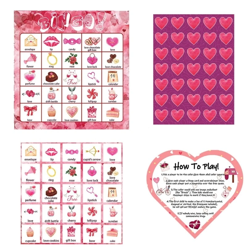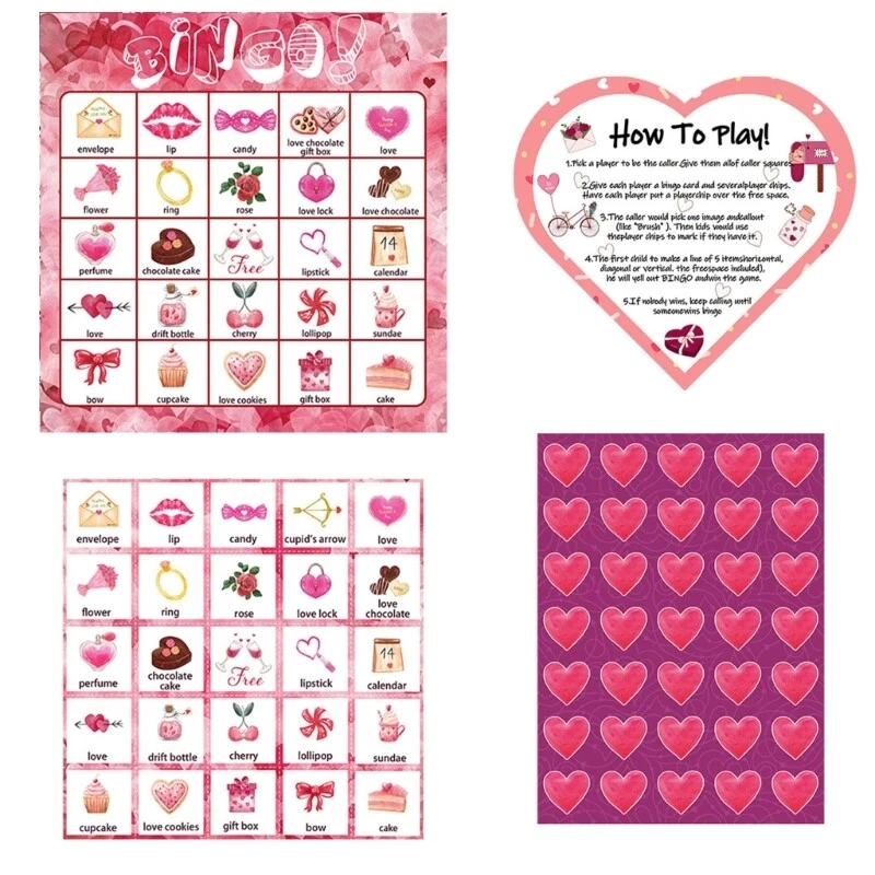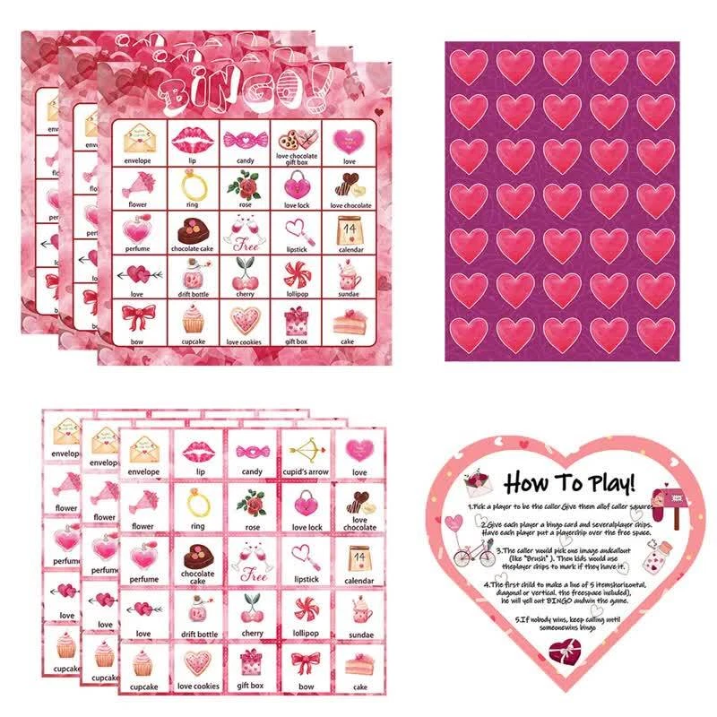 Features: Valentine bingo card party game includes 24 bingo player boards with 12sheet stickers, and 25 caller chips die cut bingo markers with through window. Reusable,quality material durable. easy to use.create hours of fun. Perfect for valentine children entertainment,excitement builds,valentines presents,valentine goodies and toy,party supplies,novelty gift toy,goodies bag fillers,valentines treats for kids,school classroom games, valentine party card games,classroom game,and family home activity. Wonderful gift,sweet warm gift for friend family and yourself. Safe to kids. Specifications: Material;Paper Package Includes: 1Set Valentines Day Bingo Game Cards note: Please allow 1-2cm errors due to manual measurement. Due to the differences betweeen different monitors,the picture may not reflect the actual color of the item.