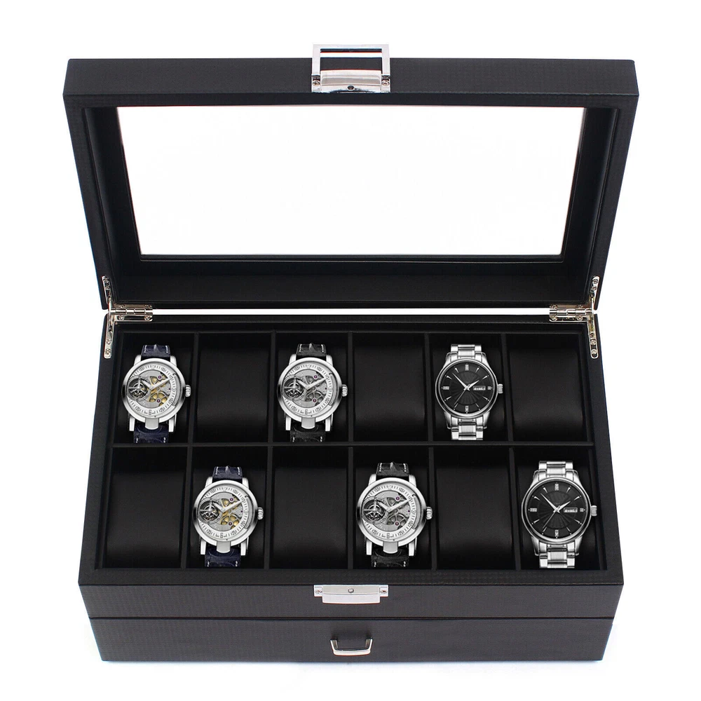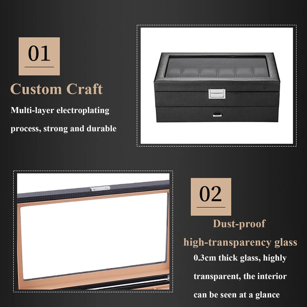 💖High Quality & Fast Shipping💖 24 Slots Men Watch Storage Box Large Jewelry Display Case Organizer Holder Black Description The watch box is made of high-quality wood, carbon fiber, glass, plastic, and zinc alloy, which is strong, durable, and not easy to deform. It has two layers with a total of 24 compartments and a lot of storage space, which can meet your daily storage needs. Specification Color: Black Material: Wood, Carbon Fiber, Glass, Zinc Alloy Pillow Inner Material: Plastic Number of Compartments: 24 Shape: Rectangular Mounting Type: Freestanding Closure Type: Electroplated Latch Number of Drawers: 1 Net Weight: 3.4kg/7.5lbs Package Weight: 3.7kg/8.1lbs Product Size: 34*21*14.8cm/13.4*8.3*5.8inch Package Size: 34.5*23.5*17.5cm/13.5*9.2*6.8inch Package Included 1* Watch Box Details Exquisite Workmanship: This is a carefully crafted watch box. The premium carbon fiber grain and fine workmanship give it a luxurious texture. Dust-proof Design: The top lid and drawer can prevent dust from entering, which can keep the interior clean to save you a lot of cleaning time. High Light-transmitting Glass: The high light-transmitting glass at the top of the watch box provides a clear view of the watch's storage position and also allows for a better display of your watches. So you can easily find the watch you want. Good Materials: The watch box is made of high-quality wood, carbon fiber, glass, plastic, and zinc alloy, which is strong, durable, and not easy to deform. Good materials can extend its service life. Delicate Designed Pillow: The surface of the pillow is made of soft carbon fiber, which is anti-slipe and comfortable to touch so that the watch is better cared for. Compartment Design: This watch box has 2 layers of compartments for classified storage. This can make the space neater. You can easily find the watch, bracelet, necklace, earring, ring, and brooch you want. Large Storage Space: This product has two layers with a total of 24 compartments and a lot of storage space, which can meet your daily storage needs. Versatile: This product can be used to store not only watches in the first layer but also other items inside the second one. It is versatile and can meet your daily needs. Beautiful Appearance: The luxurious black casing with silver locking clasp gives the box a stylish, classic look. The black lining shows off the luster of your watch even better. A Good Gift: This watch box is an ideal gift for your mom, wife, husband, daughter, or girlfriend. It will be a practical and memorable gift. Key Features A Handle: There is a handle on the outside of the drawer for easier opening and closing. Electroplated Latch: The electroplated latch can prevent corrosion and rust, so it's durable. You can use it for a longer time. Guaranteed Customer Service: We aim to provide quality products and services. If you have problems, please feel free to contact us. We will reply and solve the problem for you as soon as possible. Application: It can be used to store watches, bracelets, necklaces, earrings, rings, brooches, and other accessories . It is also a great gift for your mom, wife, husband, daughter, or girlfriend. Notes Please allow the slight color difference caused by the shooting light and 1-3cm error due to manual measurement, and make sure you do not mind before ordering. Payment Delivery details Terms of sales About us Contact us Payment We accept ebay payment 。 Fees such as import duties, taxes are not included in the item price or shipping costs. These charges are the buyer's responsibility. Delivery details Shipping: 2-9 working days to: USA Terms of sales We maintain high standards of excellence and strive for hundred percent customer satisfaction. Feedback is very important to us. We hope that you contact us immediately before you give neutral or negative feedback, so that we can address your concerns. It is impossible to address issues if we do not know about them! About us Your satis faction is our ultimate goal. We work hard to earn your trust and future business. Our certified technicians have tested each item before shipping. The unit comes with 1 year limited warranty on all manufacturing defects. a) If you receive a defective item, you may return it or ask for a discount. Please contact us within 14 days after you receive the package. b) What you returned must be intact and in its original packaging as re? u. Customer is responsible for shipping costs of the returned item. c) We will cover the cost of shipping back t with the shipping rate indicated in the registration page. We will send you a new unit or refund the full payment you paid. Thank you. Contact us Business Hour Business Hour: Monday To Friday: 8:30 AM to 5:00 PM (Beijing China time) Due to time zones, our reply to your questions may not be immediately. But within above working time, we will reply your email within 24 hours. If it's non-workdays, please kindly be patient and wait till Monday. Please contact us with ebay message. Please feel free to contact us if you have any questions. Monday To Friday: 8:30 AM to 5:00 PM (Beijing China time) Due to time zones, our reply to your questions may not be immediately. But within above working time, we will reply your email within 24 hours. If it's non-workdays, please kindly be patient and wait till Monday. Please contact us with ebay message. Please feel free to contact us if you have any questions.