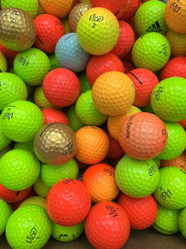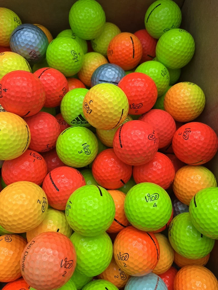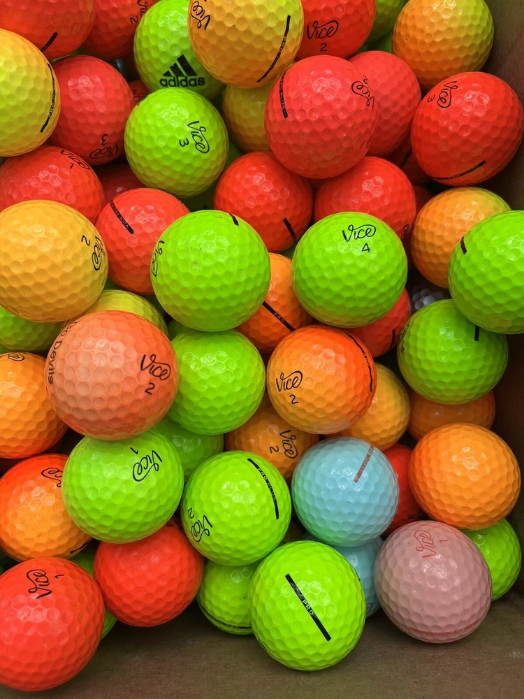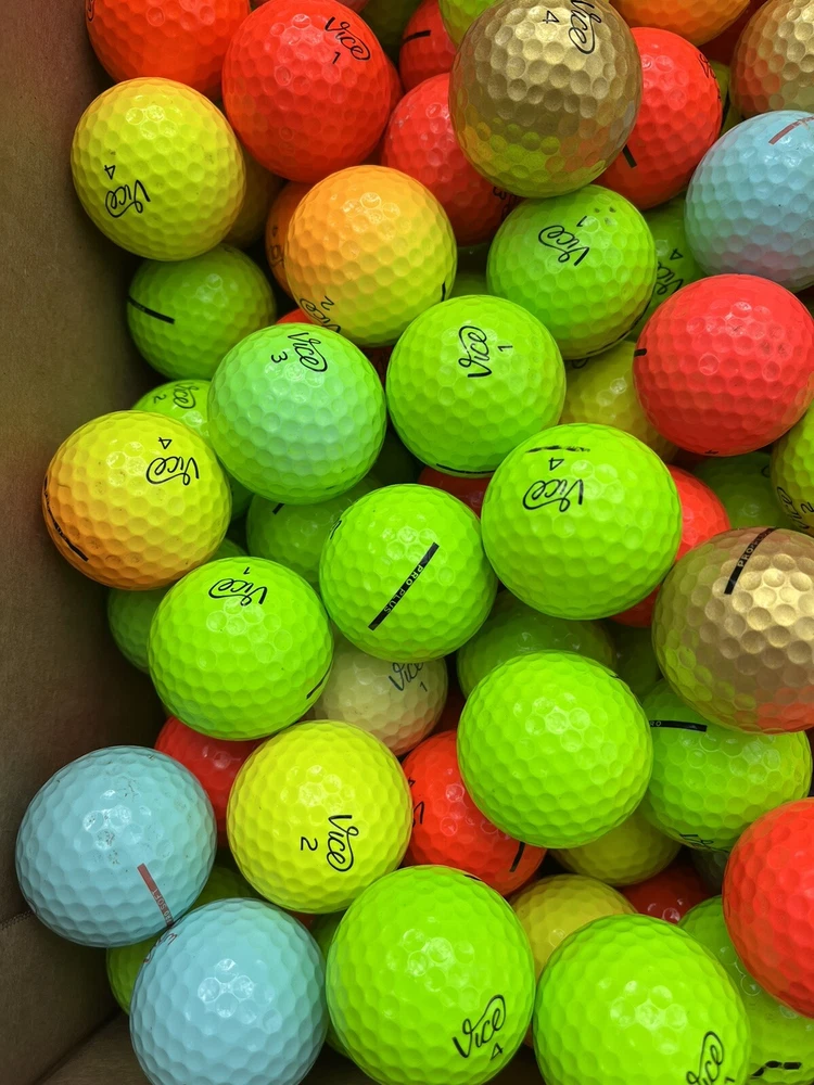 Elevate your golf game with this awesome set of 24 Vice Colored golf balls. These balls will be a mix of all different models and colors from Vice. There are some really neat ones like gold and light blue that could be in your box! 5A/4A condition: All balls are playable on the course. Some will look brand new, while others might have a small scuffs, pen marks, slight dirt/discoloration, etc. Overall, I am confident you will be happy with the product you receive! Thank you for supporting my business.