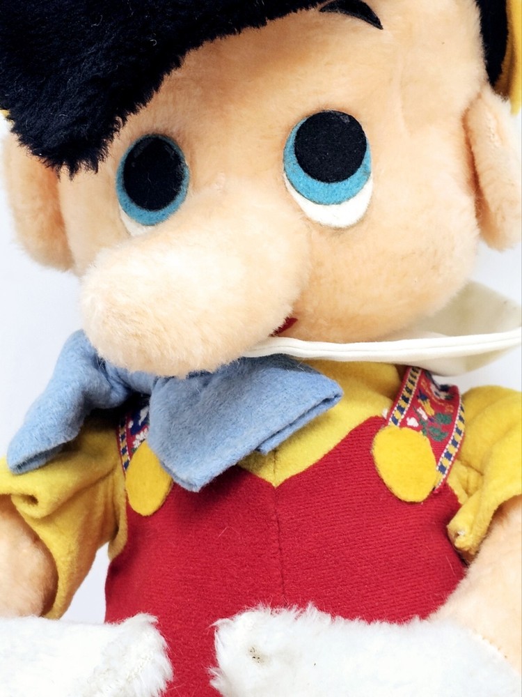 Large plush, shows some wear from the age. Eyes have some issues and small hole on right knee. Not sure about the back of head, but similar plush have the same thing. Please review pictures before purchasing to better understand the condition of the item. This is a 24" plush toy of the classic Disney character, Pinocchio. It features a cute and cuddly design that is perfect for Disney fans of all ages. The toy is made from high-quality materials and is based on the 1970s Disney movie, Pinocchio. It is a great addition to any collection of Disney memorabilia and is sure to bring joy and happiness to those who see it.