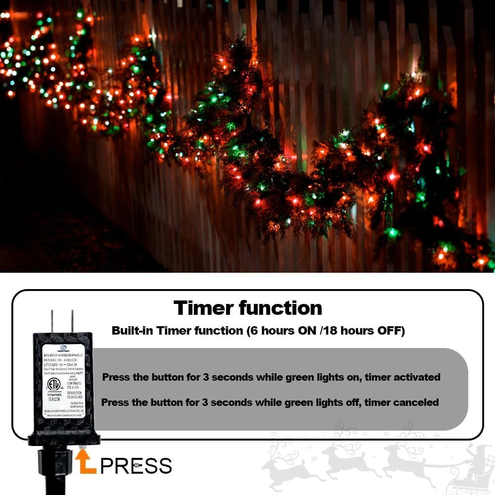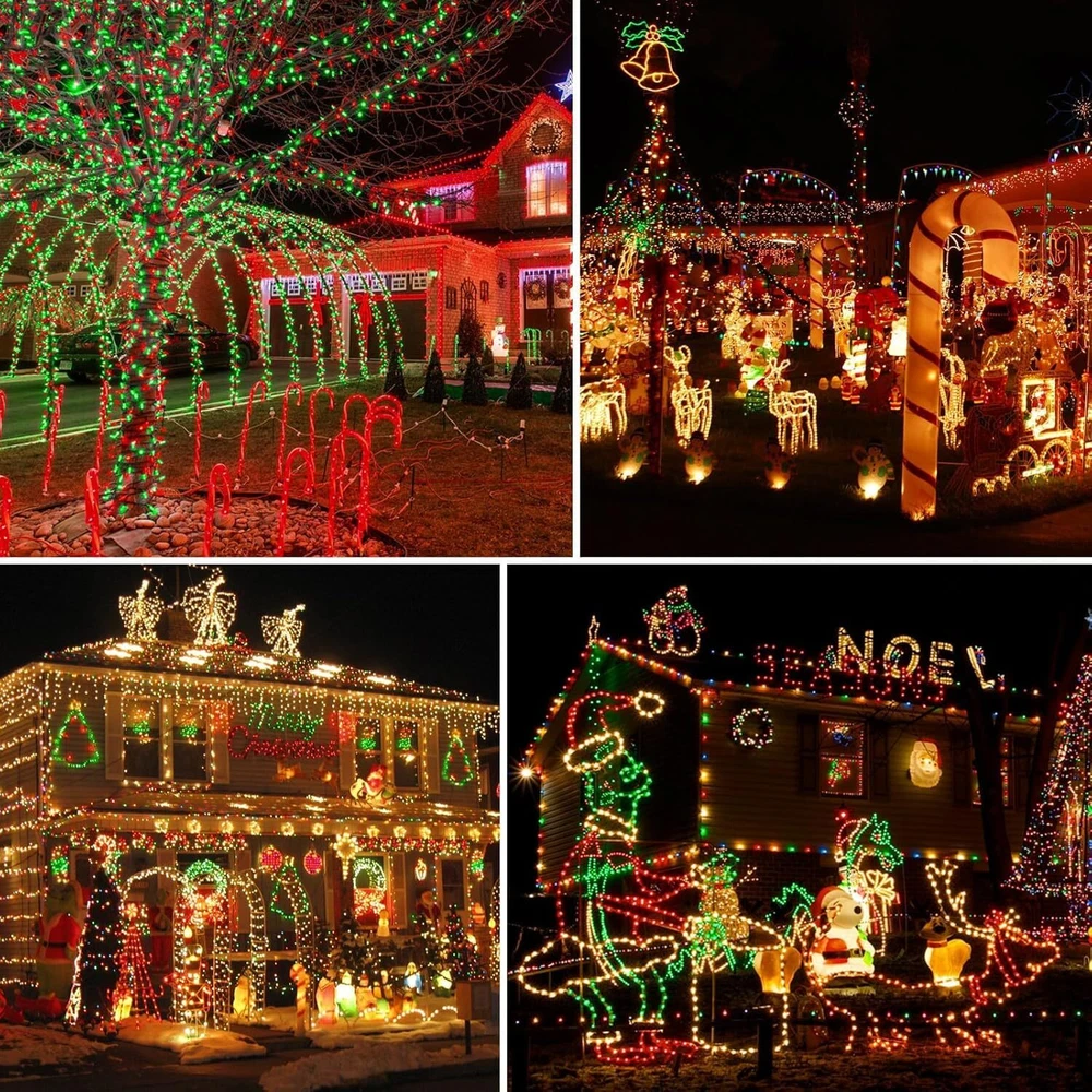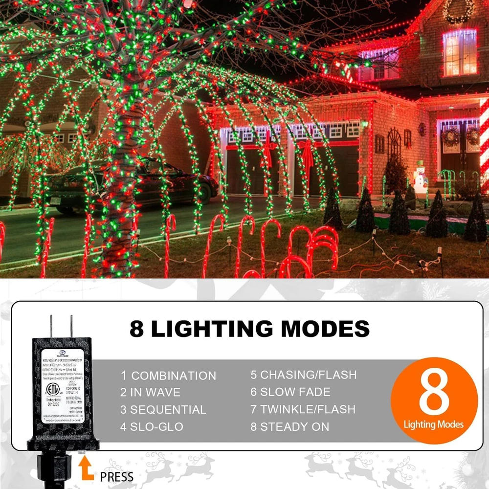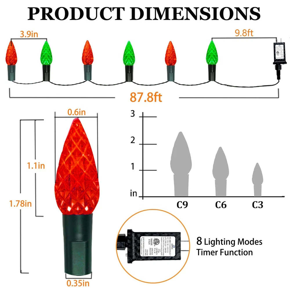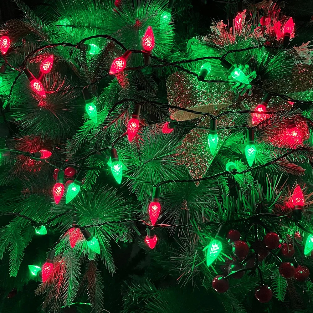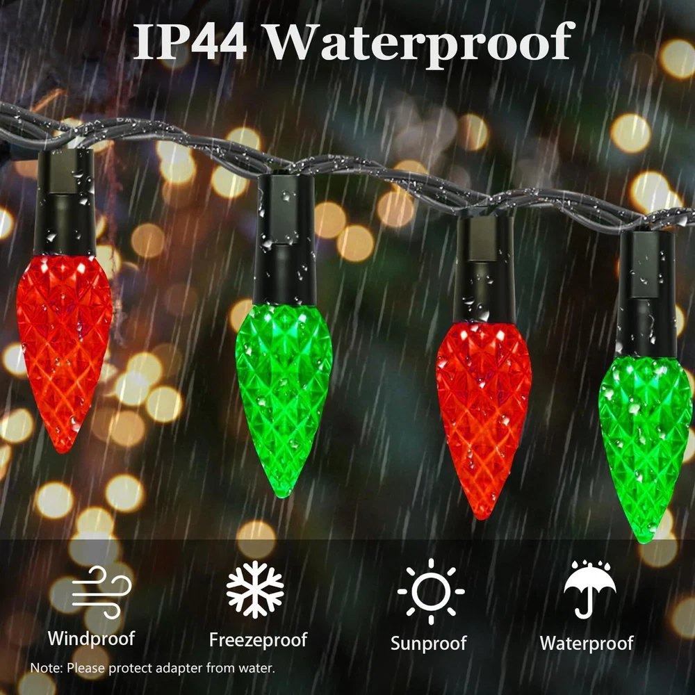 240 LED 78FT C6 Christmas String Lights, Super Long and Bright Fairy Twinkle Lights Plug in with 8 Modes & Timer, Waterproof Red and Green Lights for Indoor Outdoor Xmas Tree Holiday Party Decoration Upgraded Super Long C6 String Lights: Our C6 Christmas string lights are designed with 240pcs high quality plastic strawberry shaped C6 LED bulbs, which is not only visually appealing but also durable. The fairy lights total length of 87.8ft, 78ft lights wire and 9.8ft leading wire. This super long fairy string lights will easily cover a larger area, such as your home, yard, or garden, creating a magical atmosphere for your Christmas celebration 8 Lighting Modes and Timer Function: The twinkle string lights for outside have a mode button. You can select 8 different modes to satisfy your diverse needs, including combination, in waves, sequential, slow glow, chasing, slow fade, twinkle, Steady on. With built-in timer, long press the button of the adapter to green, the timer function acitivated and it will be on for 6 hours and off for 18 hours repeatedly everday. To cancel the timer, simply press the button of the adaptor for 3 seconds to turn off the green indicator UL Certified Adapter and Safe for Use: The adapter of C6 string lights is UL certified and meets all safety standards. 29V low voltage, keep at a low temperature state after lighting up for hours, ensure the safety. Our Christmas string lights feature a convenient plug-in design, simply plug in and enjoy the enchanting glow Waterproof and Indoor Outdoor Use: With IP44 waterproof design, our red and green twinkle lights are durable enough to withstand most of weather conditions, such as rain, snow and sleet. You can easily use the Christmas string lights both indoor and outdoor, wherever you want to create a magical atmosphere. Please protect the plug from being immersed in water Perfect Christmas Decorations: The pinecone C6 string lights plug in is perfect for indoor and outdoor decoration, such as Christmas trees, roofs, fireplaces, bars, gardens, courtyards, balconies, or any place you want to decorate. These decorative lights are particularly suitable for Christmas, Halloween, parties, weddings, Thanksgiving, festivals, or any holiday and ceremony. Whether it's for indoor parties or outdoor gatherings, these lights will enhance the atmosphere and bring joy to any occasion