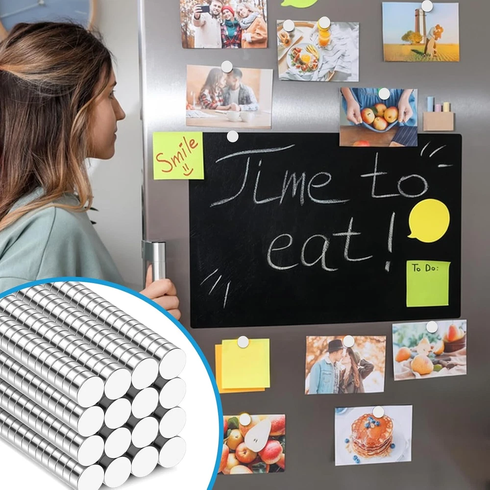 These tiny magnets are surprisingly strong! I use them for everything from fridge notes to craft projects. The brushed nickel finish looks clean and they haven't rusted at all. Perfect size and the large quantity is a fantastic value.
