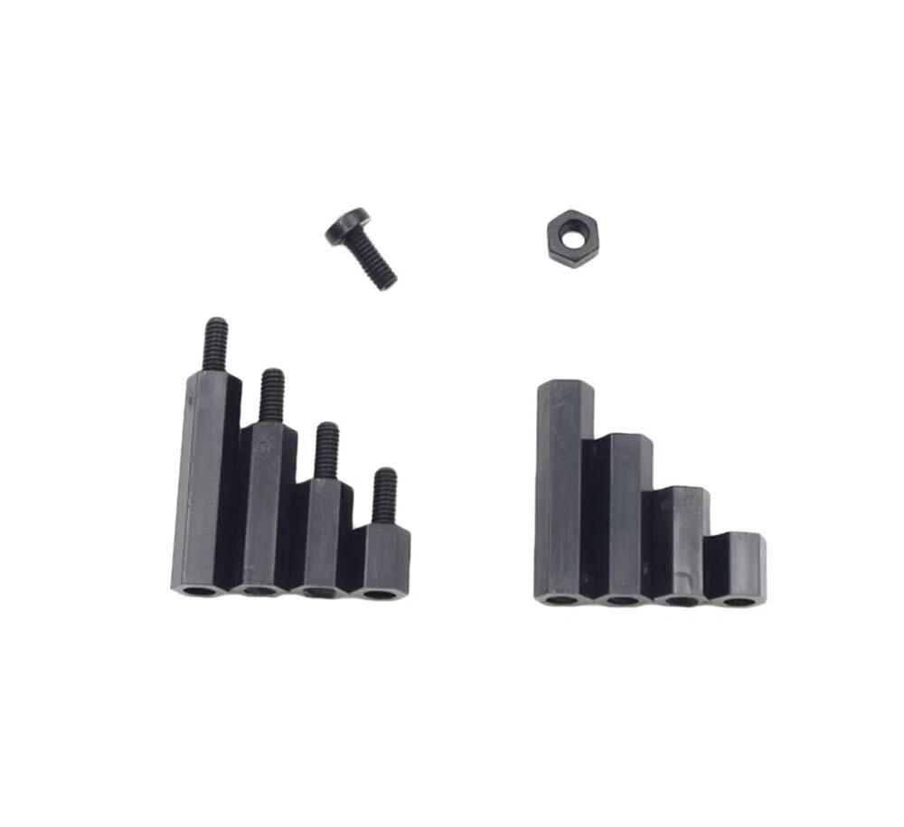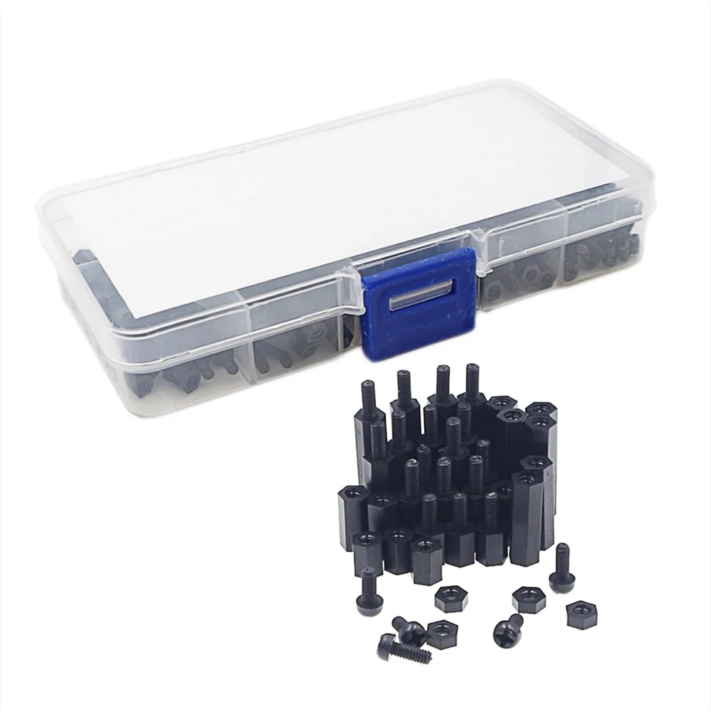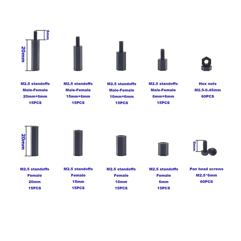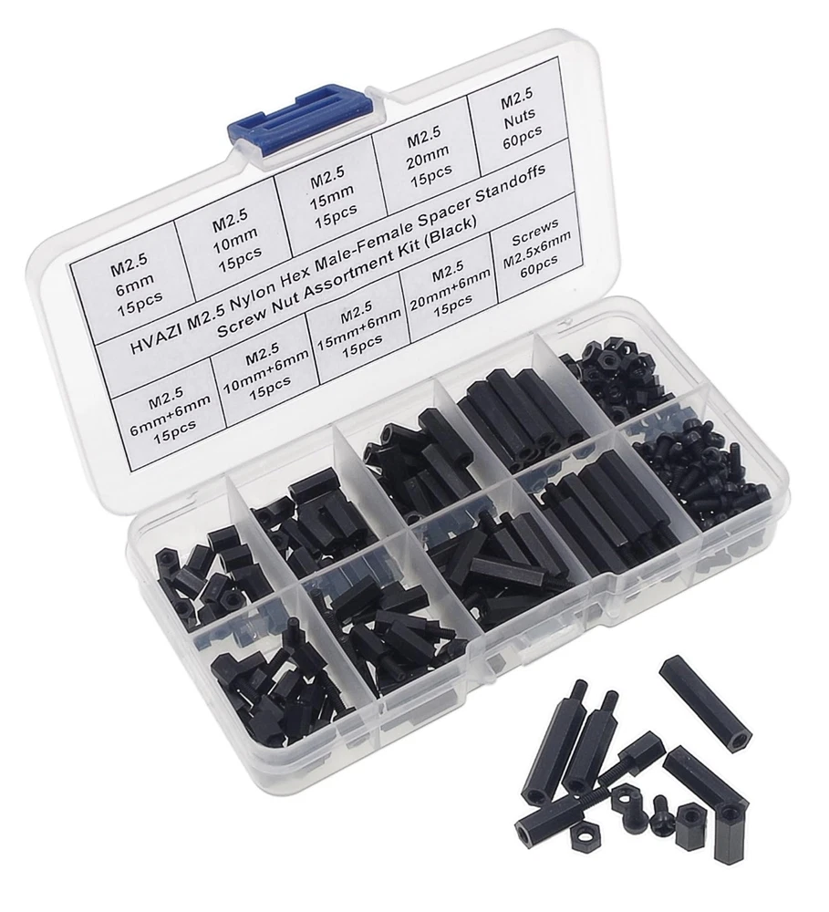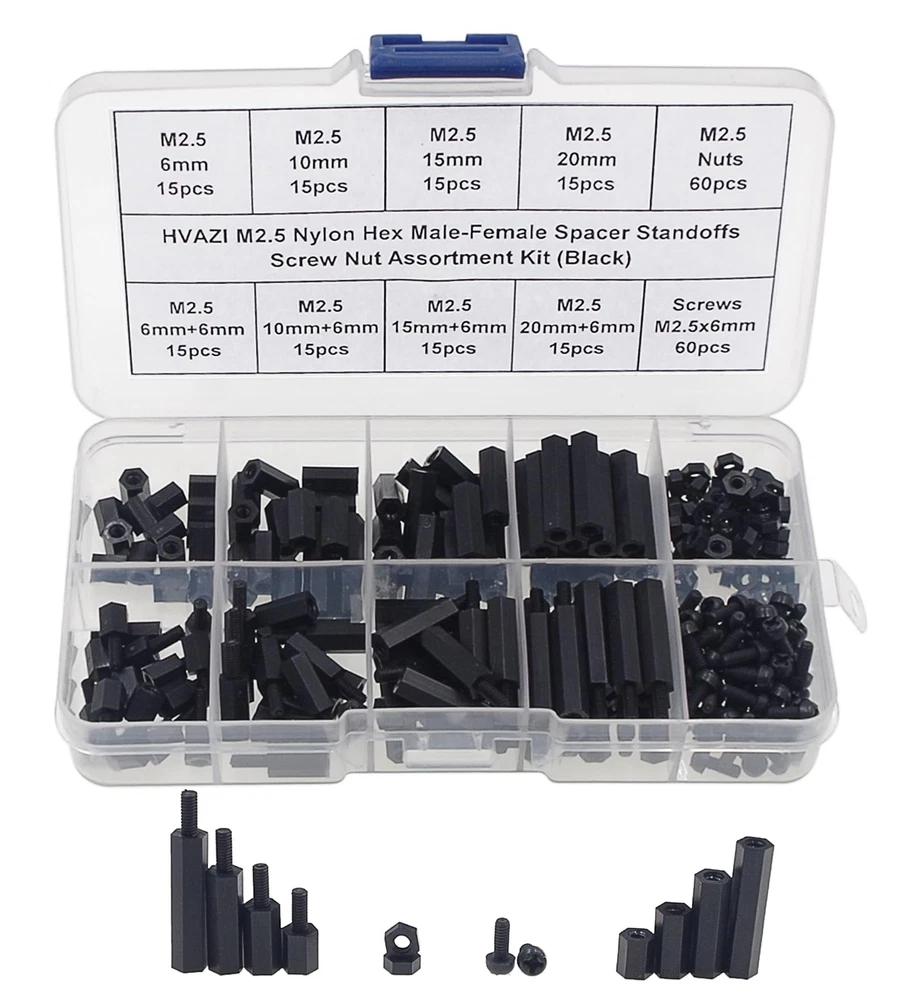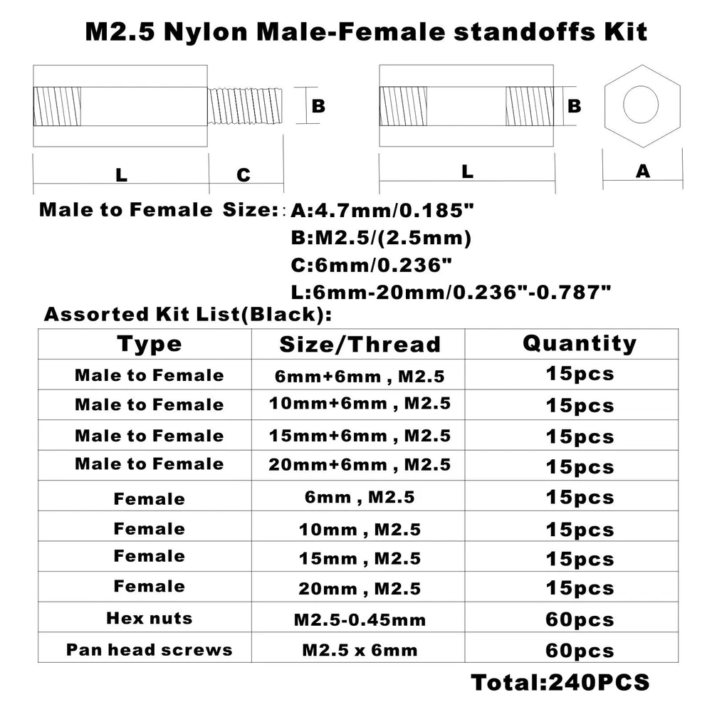 Product description: M2.5 Threaded Hex Male-Female Standoff Spacer Screw Nut Assortment Kit. Material: Nylon. 100% new, RoHS compliant. Package include: M2.5 Hex Male-Female Standoff Spacer Screw Nut total 240 pieces. Come with the plastic box: List(Type,Length / Thread,Quantity): Male to Female 6mm+6mm, M2.5 15pcs Male to Female 10mm+6mm, M2.5 15pcs Male to Female 15mm+6mm, M2.5 15pcs Male to Female 20mm+6mm, M2.5 15pcs Female to Female 6mm, M2.5 15pcs Female to Female 10mm, M2.5 15pcs Female to Female 15mm, M2.5 15pcs Female to Female 20mm, M2.5 15pcs Nylon Nuts M2.5 60pcs Nylon Screw M2.5x6mm 60pcs Packing contents: 240pcs M2.5 Nylon Hex Standoffs Screws Nuts Packed in a plastic box. M2.5 Black Nylon Hex Spacers Standoffs/ Screws/ Nuts Assorted Kit;Total 240 Pieces Come With the Plastic Box Screw Thread: M2.5/(2.5mm), Thread Pitch: 0.45mm;The Male-Female Standoffs Different length:6mm+6mm(15pcs);6mm(15pcs);10mm+6mm(15pcs);10mm(15pcs);15mm+6mm(15pcs);15mm(15pcs);20mm+6mm(15pcs);20mm(15pcs).and Nylon Screws(60pcs)/Nuts(60pcs); The Nylon Standoffs Kit For FPV Quadcopter Building,Arduino,Raspberry-Pi or other projects All Products are Made of Nylon, Strong, anticorrosive. Good Quality.Easy to install