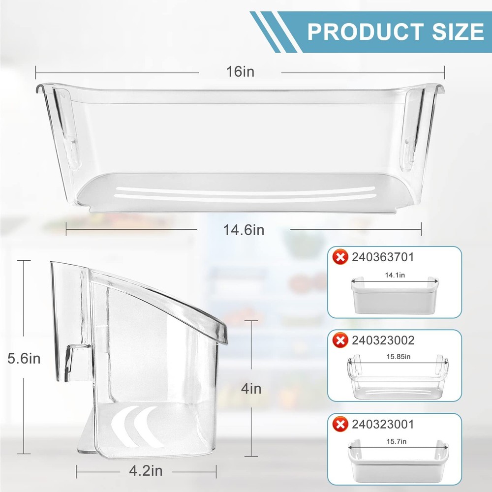 Part Information: 242126602 Refrigerator Door Bin Part(Side Shelf Rack) 242126602 Refrigerator Door Bin specifications: Material: Premium Resin Quantity: Pack of 2 242126602 Refrigerator Door Bin> Connection Method: Straight connection Fixes the following symptoms: ❶Prevent breakage ❷Anti-aging ❸Corrosion resistance ... Please Note: This is intended as a guideline only, as other items can cause the same symptoms Worry-free installation: You don't need a professional repairman to fix refrigerator. Even the homeowner can perform the installation process easily and quickly. If you are not sure how to install, watch the related video to help you Apply to: with Frigidaire Refrigerators: DGHX2655TF (0, 5, 6, 8, 9, A, B, C) FFSS2615TD (0, 1, 2, 3, 4) FFSS2615TE (0, 1, 2, 3, 4) FFSS2615TP (0, 1, 2, 3, 4) FFSS2615TS (0, 1, 2, 3, 5) FFSS2625TE (0, 1, 2, 3) FFSS2625TP (0, 1, 2, 3) FFSS2625TS (0, 1, 2, 3, 5, 6) FGSS2635TD (4, 5, 6, 7, 8, 9) FGSS2635TE (4, 5, 6, 7, 8) FGSS2635TF (0, 1, 5, 6, 7, 8, A, B) FGSS2635TP (4, 5, 6, 7, 8) LFSS2612TD (0, 1) LFSS2612TE (0, 1, 2, 3, 4) LFSS2612TF (0, 1, 2, 3, 4) LFSS2612TP (0, 1, 2, 3) LGHX2636TD (0, 8, 9) LGHX2636TF (0, 4, 5, 7, 8, 9, A, B) CRSE263T (B0, D0, S0, W0) FGHS2631PF5A NOTE: The above brand names are only used to prove compatibility 【Model Reference】Fits Frigi.daire Side-By-Side Refrigerator: FFSS2625TS0, LFSS2612TF0, LGHX2636TF, LGHX2636TD, LFSS2612TP, LFSS2612TF, LFSS2612TE, LFSS2612TD, FGSS2635TP, FGSS2635TF, FGSS2635TE, FGSS2635TD, FFSS2625TS, FFSS2625TP, FFSS2625TE, FFSS2615TS, FFSS2615TP, FFSS2615TE, FFSS2615TD, DGHX2655TF, CRSE263TW0, CRSE263TS0, CRSE263TD0, CRSE263TB0, FGHS2631PF5A etc. To save your time and avoid making a purchase mistake, make sure the model before you buy 【Part Number】242126602 Refrigerator door shelf replace 2421266, 4547407, AP6278233, PS12364199, EAP12364199, PS2421266 etc. Only for side-by-side refrigerator models with 2 shelves on the bottom side of the refrigerator (Door Shelf Bin Lower) 【Notice】Suitability and durability are your first choice when you are concerned about refrigerator shelf bin parts. We use rigorous testing to ensure the suitability of our products for buyers' refrigerator shelves. Maximum Length: 16", Front Height: 5 3/4", Depth: 4". If the measurement is off by 1/8", then this will not fit your model 【Material Structure】Our 242126602 refrigerator shelf is completely designed with non-polluting, safe, hygienic and highly eco-friendly materials. Refrigerator door shelf is made of Premium resin. Upgraded the material to increase durability while maintaining safety. Easy to install, saving time and money. Guaranteed to exceed OEM specifications 【After Sale】100% Quality of Service - All refrigerator shelves are 100% safety tested to ensure consistent quality you can trust. The quality of the refrigerator side shelf has been certified at home and abroad. We serve you sincerely. For whatever reason you are not satisfied, you can request a . If you are not satisfied with the frigi.daire shelf parts, us! will show you our sincere attitude and satisfactory solution
