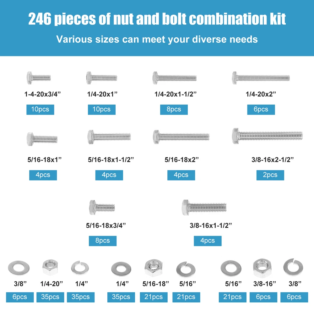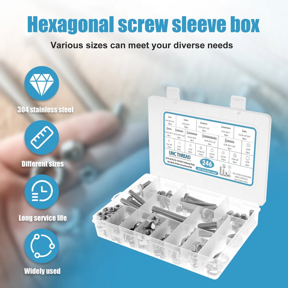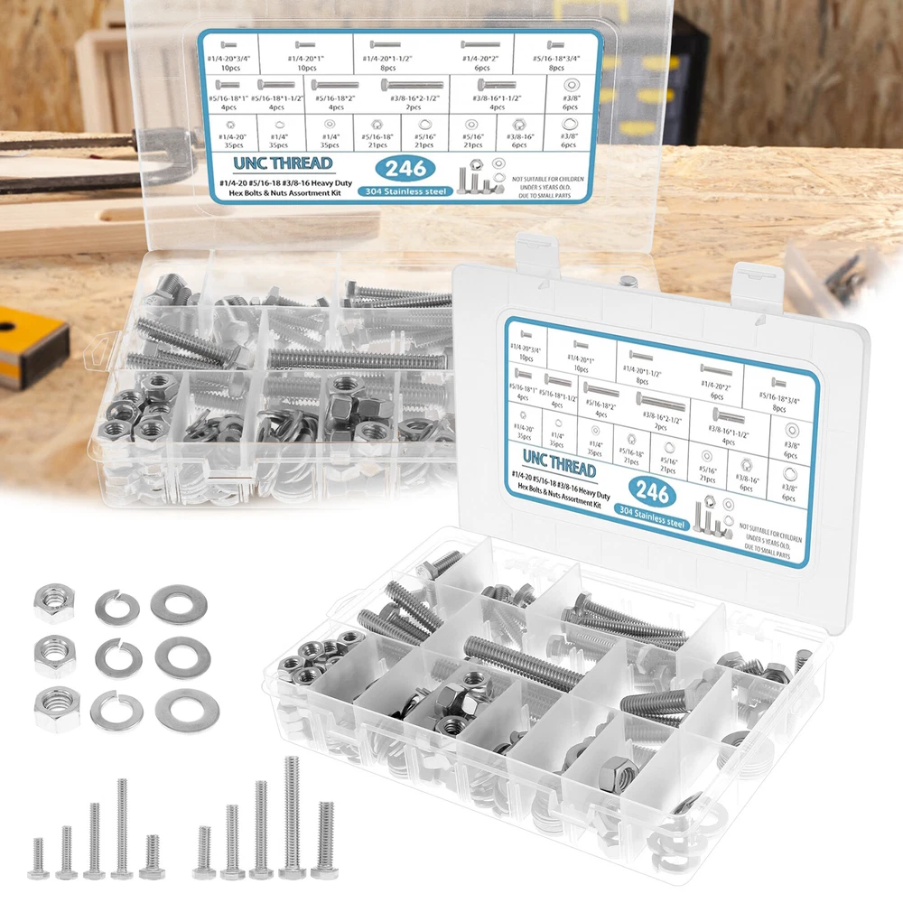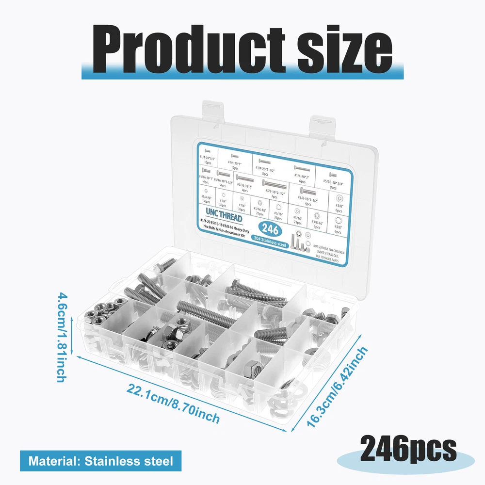 [---Welcome TO Our Store! Happy Shopping! Happy Life---] Highlight description: Set Contents: This set contains a 246-piece nuts and bolts kit in 10 sizes, which includes various sizes of 1/4“-20, 5/16”-18, 3/8"-16 nuts and bolts, flat washers and spring washers. A full range of accessories and different sizes to meet your usage needs Quality Stainless Steel: The nuts, bolts and washers in the kit are made of stainless steel, high hardness, strong and enduring, rustproof and wear resistant, suitable for long term use and storage Bolt and Nut Set: The bolt and nut set includes 1/4“-20 x 3/4”, 1/4“-20 x 1-1/2”, 1/4“-20 x 1”, 1/ 4“-20 x 2”, 5/16“-18 x 3/4”, 5/16“-18 x 1”, 5/16"-18 x 1- 1/2“, 5/16”-18 x 2“, 3/8”-16 x 2-1/2“and 3/8”-16 x 1-1/2”. These include most of the sizes you need for everyday use and the hexagonal threads are clear, smooth and burr free Includes Storage Box: The package comes with a clear storage box with clear labels printed on it, the bolts and nuts are stored in separate compartments to keep the different sizes of bolts, nuts and washers organized and easy to carry and store on a daily basis Wide Application: The bolts and nuts set is an ideal tool for home repairs, suitable for repairing household electronics, locks, lamps, some precision machinery and classified instruments, and so on Detailed description: Description: This bolt and nut kit contains many different sizes of nuts and bolts, basically it can meet the daily repair of home electronics, locks or lamps, etc., very practical Key Feature: Enduring: The nuts, bolts and washers in this kit are made of stainless steel, which is hard, sturdy, rust resistant and wear resistant, suitable for long term use and storage. It also comes with an organizer box, which can easily store a variety of nuts or bolts Specification: Product Name: Hex Head Nuts and Bolts Assortment Kit Style: Style 1 Material: Stainless Steel Size: 22.1 x 16.3 x 4.6 cm / 8.7 x 6.4 x 1.81 inches Screw 1/4“-20 x 3/4”、1/4“-20 x 1-1/2”、1/4“-20 x 1”、1/4“-20 x 2”、5/16“-18 x 3/4”、5/16“-18 x 1”、 5/16“-18 x 1-1/2”、5/16“-18 x 2”、3/8“-16 x 2-1/2 ”和 3/8“-16 x 1-1/2” Note: 1.There may be slight differences between the picture and the actual color of the commodity. We will try our best to show you the exact color. 2.Please allow slight dimension differences due to manual measurement. Parts List: 1 × Hex Head Nuts and Bolts Assortment Kit (246Pcs) We accept Payoneer/Mastercard/VISA/Google Pay/American Express etc. Immediate payment is needed, so that we can finish your orders, then dispatch and post them in time. We really appreciate your business with us, and hope to keep it lasting. Orders will be processed and dispatched within 1-5 working daysafter payment received from Monday to Friday. Saturday and Sunday orders will be posted in the following Monday. when items are in peak period, the time will be prolonged according to certain situations, which may beyond our control, but we are always ready to help you track the delivery info. Returns: 1.Defective goods must be returned within 30 days from the delivery date. The buyer is responsible for the return shipping fee. We will not reimburse the return shipping fee unless when we have shipped the wrong item. 2.We reserve the right to refuse any returns for our reasons. Contact Us: 1) We are committed to provide you with great service. If you are in any way dissatisfied with your purchase: Please DO NOT open eBay case immediately. Please DO NOT open PayPal Dispute immediately. Please DO NOT leave us a low score for DSR immediately. Please DO NOT leave us a neutral/negative feedback immediately. Always communicate first. Please contact us via eBay message. We will work with you to resolve any problem. 2) We always reply messages within 2 business days, please check your Spam Inbox or eBay Message Box if you do not receive a response within 2 business days. We are always making efforts to providing better products and service. if you feel satisfied with us, please leave us a 5-Star on the Detailed Seller Ratings.