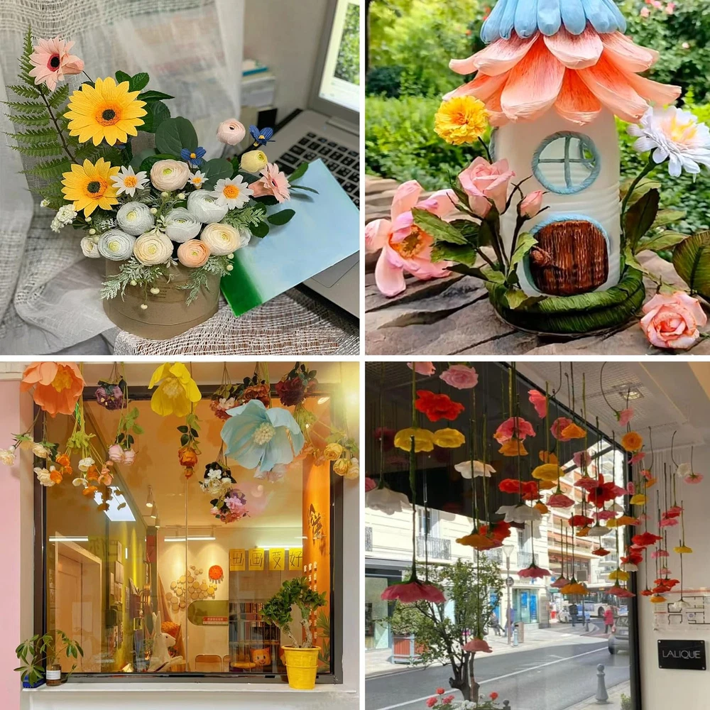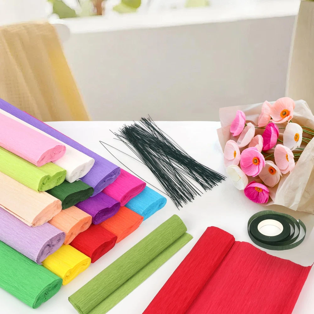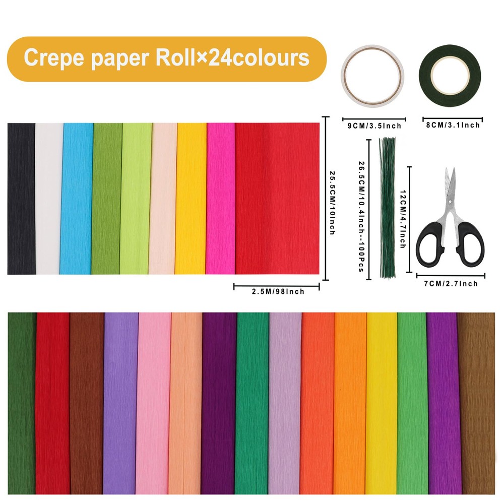 Our 24 color crepe paper is colorful, colorless, clear and tough, comes with scissors, floral tape, double sided tape, wire and other accessories, perfect for handmade origami flowers and other DIY crafts. 24 COLORS CREPE PAPER: You will receive 24 rolls of crepe paper rolls in 24 different colors, each 10 x 98 Inch 100 pieces of floral wire stems and 1 roll of green floral tape. There's also a pair of scissors and a roll of double-sided tape perfect combination matching is enough to meet your various decoration needs, so you can share them with friends and have a great time HIGH QUALITY MATERIAL: Our crepe paper is made of high quality paper pulp, not easy to wrinkle; fade and break; the green wire is soft and flexible, can be easily bent into various shapes INTERESTING DIY: You can share the colorful crepe paper sheets with your children; friends; family; or anyone who likes handicrafts, work on handicraft projects with your family and friends, establish warm relationships, and friendships, and help alleviate stress VIBRANT COLORS: We offer 24-color crepe paper rolls for you to use, and these colored papers can create long-lasting and beautiful bouquets WIDELY USED: Our crepe paper is suitable for various occasions, such as weddings; birthday parties; singles parties; anniversaries; and other important occasions; so you can use it to decorate the place you need