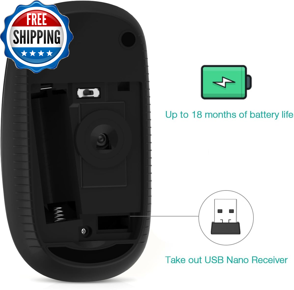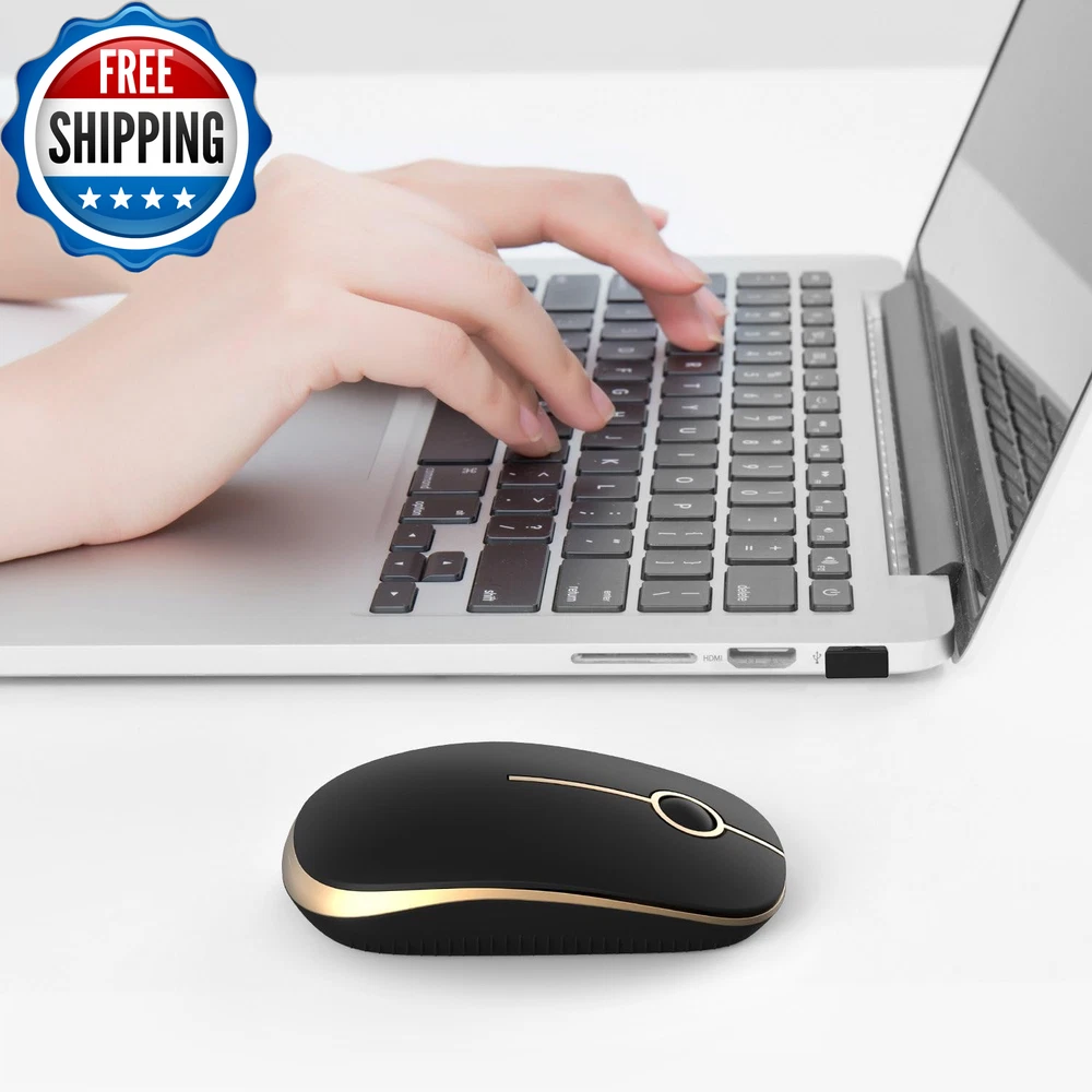 Wireless Mouse - 2.4G Slim Portable Computer Mouse with Nano Receiver, Less Noise Mobile Optical Mice for Notebook, PC, Laptop, Computer, Mac (Black and Gold) 2.4GHz Stable Wireless Connection - A tiny wireless receiver (stored in back of the mouse) provides stronger anti-interference ability, faster transmission speed and more reliable connection up to 15m (49 feet), without any hassle of additional wire and driver. Just plug and play. Portable and Noiseless - Stow the USB receiver inside the wireless mouse when not in use. Take it to anywhere like home, office, coffee shop, etc. Responsive buttons provide soft click with less noise. Ergonomic Shape & Smooth Hand Feeling - Slim ergonomic design and smooth surface for an incredible user experience. Black and gold color perfect for office use, and can match any color device. Enduring Quality & Power Saving - High DPI Movement resolution allows the mouse to track on nearly any surface. Rated to 5 million comfortable clicks. Turn into sleep mode in 8 minutes of inactivity for energy saving, easily activated by clicking any button. 1 AA Battery (NOT Included) is needed for this mouse. Wide Compatibility - Work with Windows XP, Windows Vista, Windows 7, Mac OS X 10.4 etc. NOTE: This product is connected by USB receiver, and is NOT compatible with Macbook pro or other laptops which only come with type C port. Product Description Lightweight & Slim Multi-stage power saving mode, less power consumption. The wireless mouse turn to sleep mode in 10mins of inactivity for energy saving, and can be activated by clicking any buttons. Quiet Clicking Quiet clicking takes the worry out of disturbing others, the advanced sensor silent design provides noiseless clicking. Enduring Wireless Mouse The USB receiver is located on the back of the mouse. Only 1 AA battery (not included) is required to operate this mouse and the battery life can be up to 18 months. Color Black and Gold Product Dimensions 4.7 x 2.6 x 0.04 inches Country of Origin China Item Weight 2.4 ounces Connectivity Technology USB Movement Detection Technology Optical Special Feature quiet Shipping Fast shipping is very important for us. Our standard US shipping service is FREE. Your order will be shipped within 2-3 business days upon full payment received. Your order will be delivered within 2-3 business days after the handling time. We only ship to the confirmed PayPal address. We reserve the right to cancel any order for any reason at any time. We are not responsible for undeliverable addresses. Returns and payment We offer a 30 days return policy from checkout winning date. We allow only PayPal as payment method FeedBack Your feedback very important to us, after you get your package and you are satisfied with our service please leave us positive feedback If you have any problem with your order / any questions please before leave any type of feedback Please visit our eBay store to check out other items for sale! Thank you for shopping at our store.