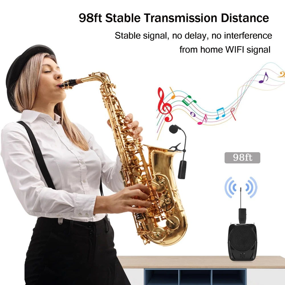 【2.4G Wireless Microphone】2.4G latest wireless technology, stable signal, no delay, no interference from home WIFI signal.The professional microphone is designed for Orchestra Trumpet Saxophone and other similar musical instruments, with better quality, bring your excellent experience. 【High-sensitivity Pickup Sound】Built-in highly sensitive condenser microphone,perfectly capture the soundtrack of the instrument,make the sound more clear and realistic. 【Detachable Clip & Handheld Design】: The Clip is detachable, you can fix the mic on the cloth or instruments, what's more, it is handheld, you can use mic in your hand freely, and it is made of special material, stable and enduable. 【Wide Application】The wireless mic with voice amplifier, speaker system etc.Apply for concerts, band performances, personal exercises, band exercises.Wind music wireless microphone,suitable for all kinds of brass instruments such as trumpet, large, horn, trombone.Included a 3.5mm(1/8") to 6.35mm(1/4") Adapter. 【Super Battery Life】built-in 450mAh rechargeable lithium-ion battery, 2 hours charge, 10 hours available, red light on when charging, red light off when fully charged.