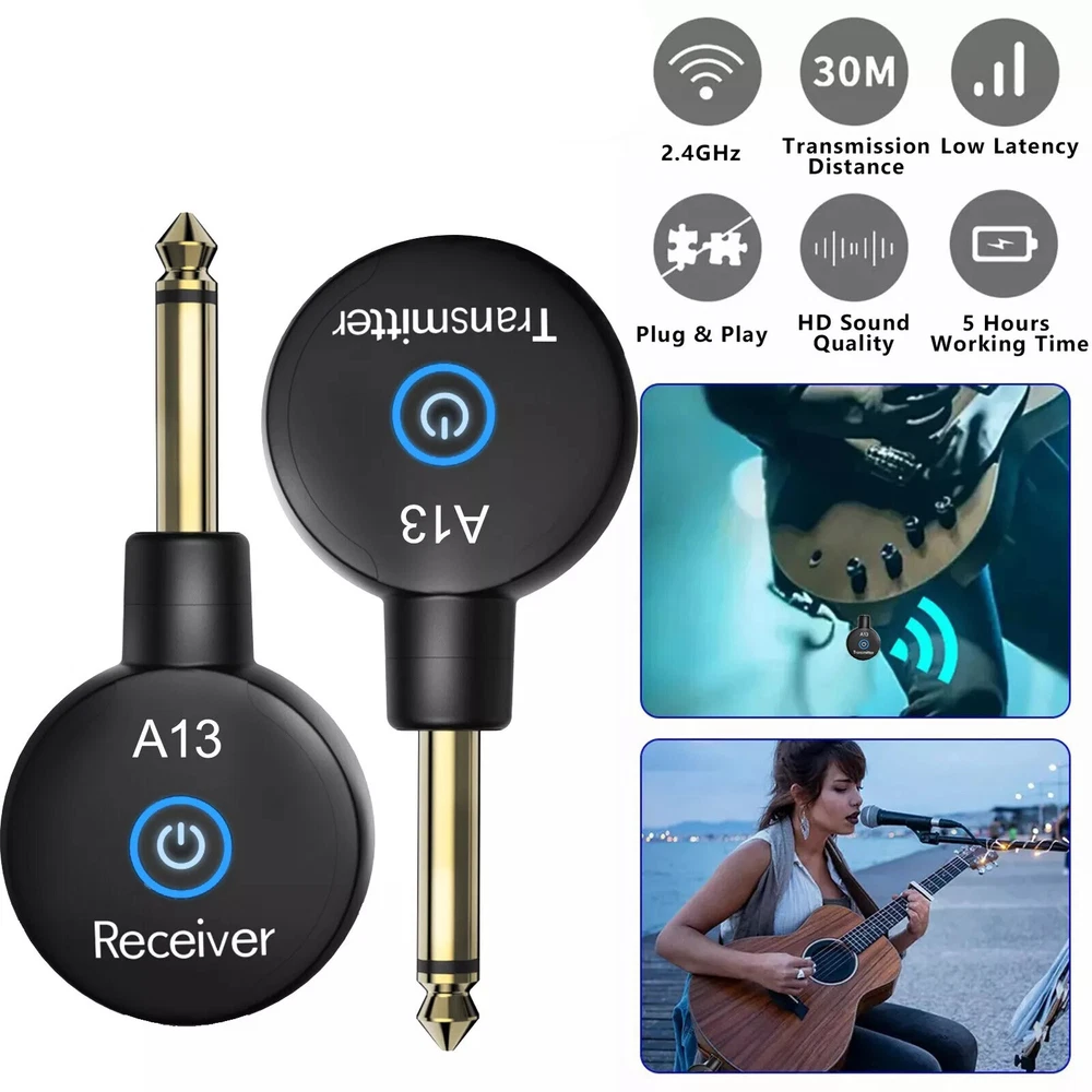 Product Description 2.4GHz Wireless Guitar System Adapter Transmitter Receiver For Guitar Bass Features: 2.4GHz digital wireless signal transmission with 24-bit/48KHz uncompressed conversion. High frequency which less than 4ms latency, no lag or no signal loss. effective range is about 100 feet. High quality restore the original guitar sound. Built-in rechargeable lithium battery, working time is up to 5 hours after fully charged, and comes with a Dual-ended Type-C Charging Cable for convenient recharging, which ensures good performance for your every show. This wireless transmitter and receiver system is compatible with all devices that have a 6.35mm (1/4") jack, including electric guitars, violins, basses, effect pedals, keyboards, and electronic instruments like the electric saxophone. A13 wireless guitar system is designed for wireless connection to electronic instruments.This wireless guitar transmitter receiver has the characteristics of low delay, low noise, low interference, fast charging, long working time and high transmission. A13 wireless guitar system in order to meet your requirements for perfect sound quality and best use experience, we have been working hard, so our guitar wireless transmitter receiver mission is to provide you with better stage performance, so that you can enjoy the best music experience! Wireless guitar makes strumming easy and happy, the wire winding pull, make playing the mood is not good.Wireless guitar transmitter receiver will be a best gift, throw away the cable, embrace the freedom of music, let yourself surrounded by 30 meters of surprise! Specifications: Material: ABS Plug: Gold-plated copper Transmission frequency: 2.4GHz Frequency bandwidth: 20Hz-20KHz Battery capacity: 200mHA Voltage: 3.7V Charging port: USB-C Charging time: 1.5 hours Battery life: 5 hours Transmission distance: 30 meters Package includes: 1* Receiver 1* Transmitter 1* Dual-ended Type-C Cable If you have any questions, please feel free to contact us via ebay. We usually respond within 24 hours. Payment Shipping Returns Contact Us We accept all verified payments from ebay. Orders will be shipped after receiving cleared payment. Payment due within 7 days after auction ends and for buy it now listings. We ship most of our orders within 24 hours, and may up to 48 hours for. If you want faster shipping way. Please contact us before making payment. Sometimes due to problems with our transportation company system, your shipping information may be delayed to update. We recommend that you try again after 3-4 days. If you still haven't checked the shipping information, you can contact us by ebay message. Always believe we can figure things out with communication, if it comes to return, the pacakge must be intact and the same as you receive. If you have any questions, please feel free to email our service specialists 24 Hours a Day, 7 Days a Week. We will reply you ASAP. Return/refund is accepted within 30 days after the buyer receives the item. NO exchange will be accepted after 30 days from the date when the item is received. Please contact us first before returning your product!!! If you have any questions, our Customer Service staffs welcome you to email us. We strive to answer all questions and resolve any problems as quickly as possible. You can contact us 7*24, we will reply at the first time, and we will surely solve your problems. Note: 1.We try our best to reply to your emails as soon as possible, however, due to high volume of daily incoming emails and time zone difference, we may not be able to reply your emails immediately. Please allow 1 business days for us to response. If you do not receive any reply from us, please check your email ensuring your mailbox has not reached full size. 2.Due to some ISP SPAM filter settings, you may not be able to receive our replies; if you have problems receiving our emails, you may need to use a different email account to contact us. 3.Please give us the opportunity to resolve any problem. We understand the concerns and frustrations you might have, and will try our best to resolve the issues. Please email us before leaving any negative feedback or open any dispute on PayPal. 4.We care about our valued customers, and will always try to help you. So if you have any problems, please e-mail us immediately. Payment We accept all verified payments from ebay. Orders will be shipped after receiving cleared payment. Payment due within 7 days after auction ends and for buy it now listings. Shipping We ship most of our orders within 24 hours, and may up to 48 hours for. If you want faster shipping way. Please contact us before making payment. Sometimes due to problems with our transportation company system, your shipping information may be delayed to update. We recommend that you try again after 3-4 days. If you still haven't checked the shipping information, you can contact us by ebay message. Returns Always believe we can figure things out with communication, if it comes to return, the pacakge must be intact and the same as you receive. If you have any questions, please feel free to email our service specialists 24 Hours a Day, 7 Days a Week. We will reply you ASAP. Return/refund is accepted within 30 days after the buyer receives the item. NO exchange will be accepted after 30 days from the date when the item is received. Please contact us first before returning your product!!! Contact Us If you have any questions, our Customer Service staffs welcome you to email us. We strive to answer all questions and resolve any problems as quickly as possible. You can contact us 7*24, we will reply at the first time, and we will surely solve your problems. Note: 1.We try our best to reply to your emails as soon as possible, however, due to high volume of daily incoming emails and time zone difference, we may not be able to reply your emails immediately. Please allow 1 business days for us to response. If you do not receive any reply from us, please check you