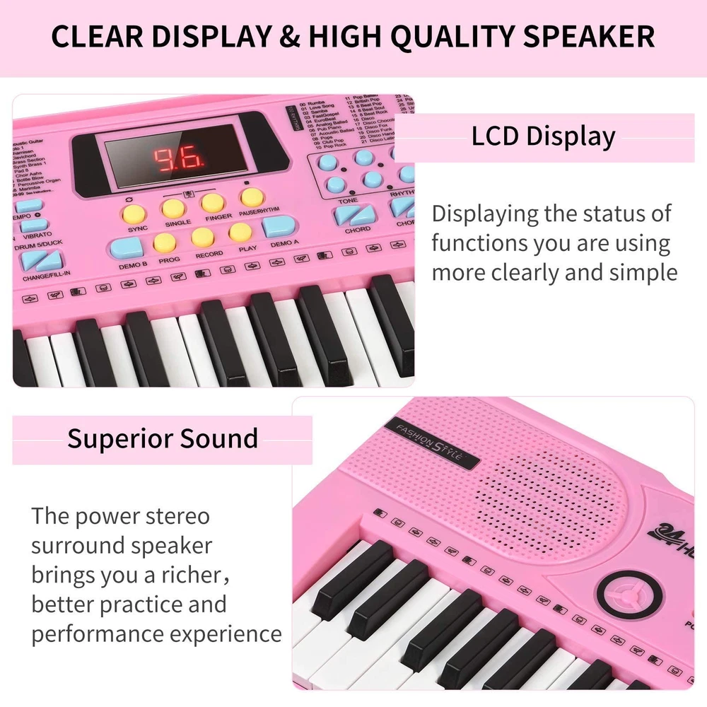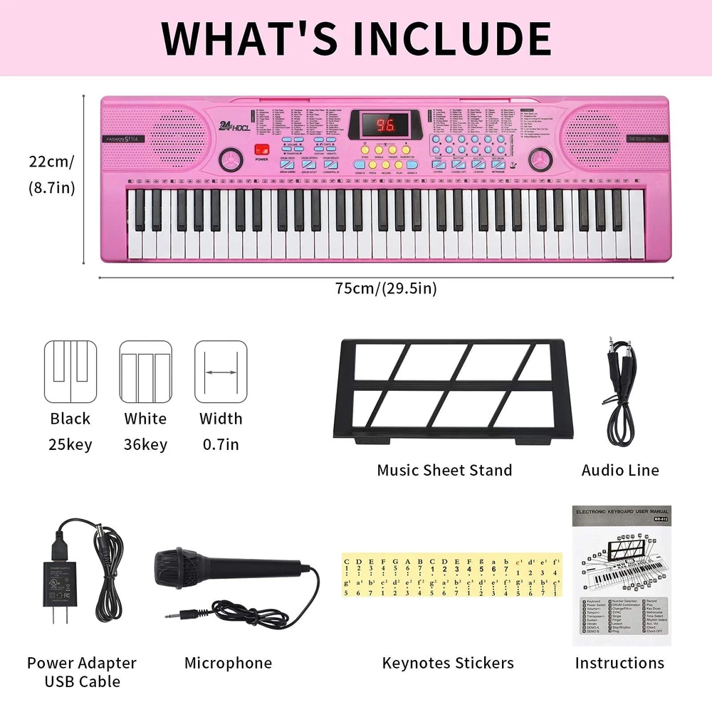 ๐ถ ๐น๐น MULTIFUNCTION ELECTRIC PIANO KEYBOARD: The 61-key electronic keyboard has built-in dual speakers can provides 100 tones, 100 rhythms, 10 demo songs, teaching mode, recording, programming, sustain tremolo, dual speakers, LCD display and other functions, allowing you to get endless fun playing. Use the optional 5 percussion instruments and drum sound kits to help maintain the rhythm. Enjoy more favorite music or create songs with 24HOCL Music Piano. ๐ ๐ค ๐ถ QUALITY SOUND & LCD DISPLAY: Perform a recital with built-in speakers, headphones, a rhythm programmer, and music player function that help to find the perfect sound and re-create classic music piece. The large-size digital display is clearer, and you can have a professional concert-like shocking experience at home. ๐ถ ๐ถ MORE EXPANSION: electronic keyboard piano has an audio input/output/microphone jack(without USB port). The audio input can be connected to your other electronic devices (phone/ipad/MP3) to simulate the sound of a variety of musical instruments. The audio output is connected to an external speaker, and the microphone can sing. Let your kids enjoy her/his own music concert wherever. ๐ถ ๐ถ 3 WAYS POWER SUPPLY: Portable 61 keyboard piano can be powered by either USB cable/UL Adapter/4 AA batteries(NOT INCLUDED), and the accessories are on one ends of the white foam, in the embedded position. Very convenient to use when going out for practice or performance, it is your music partner with you.