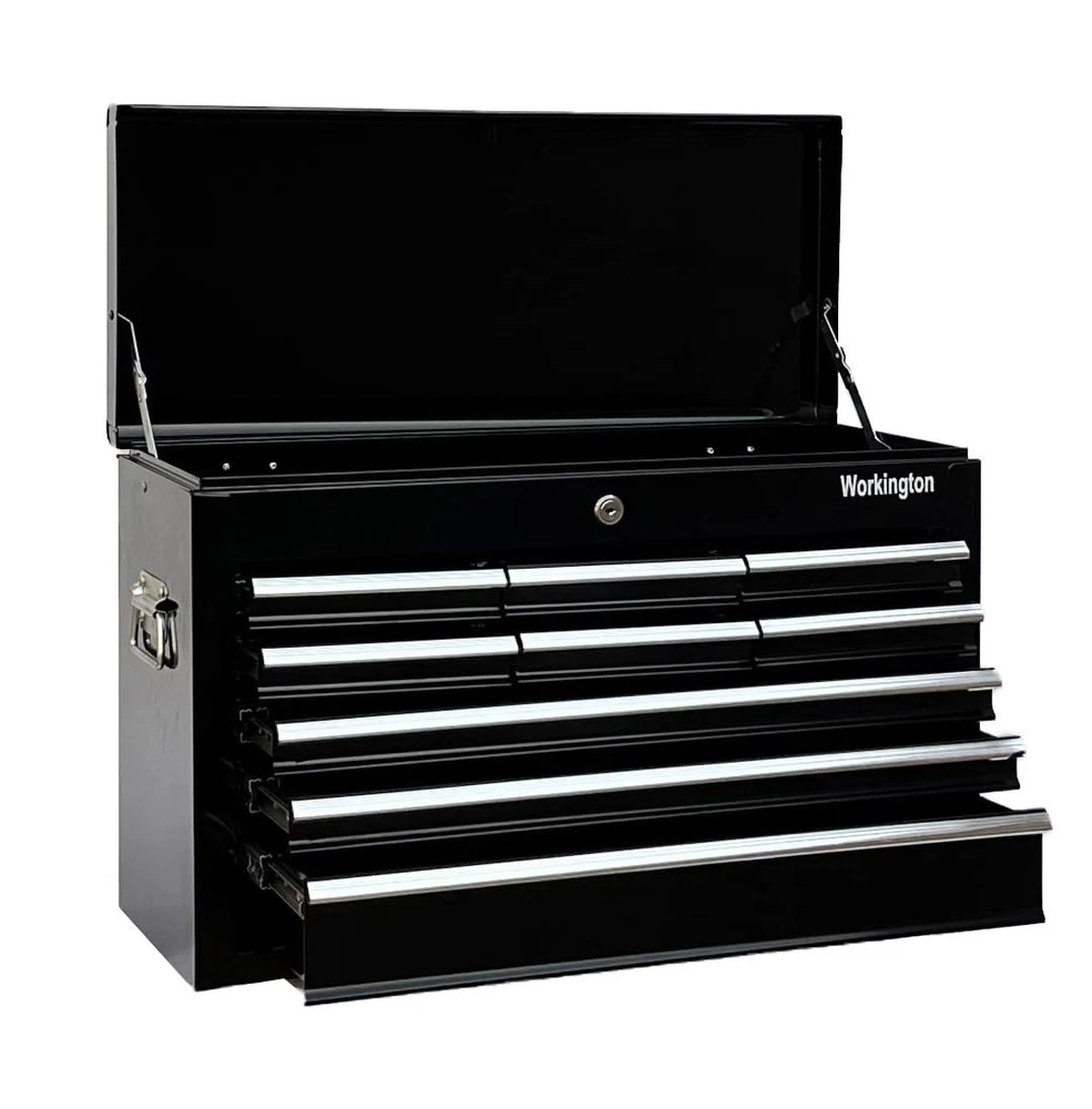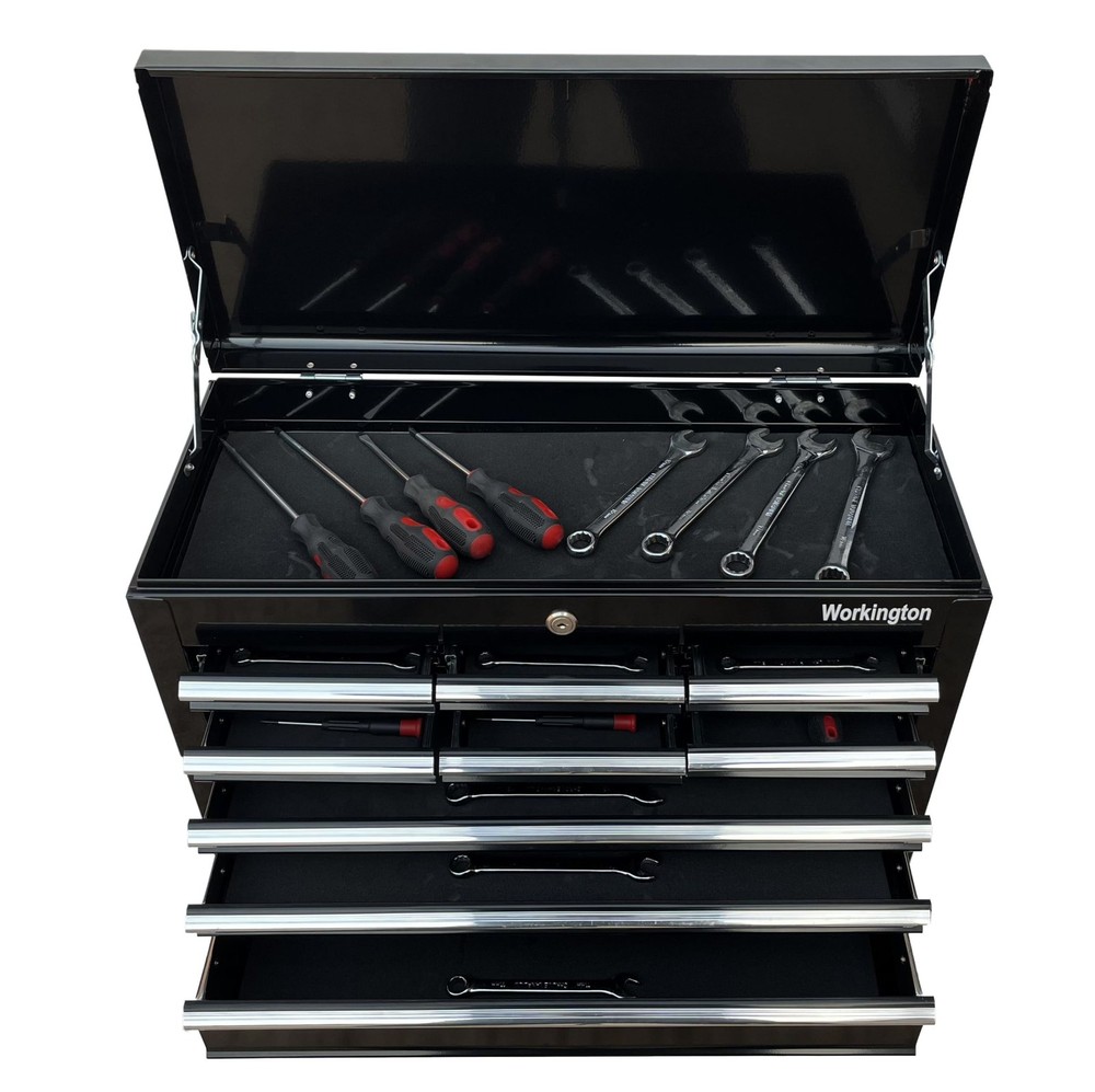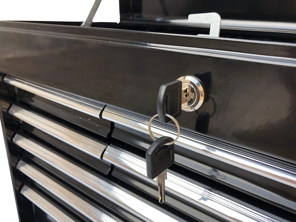 Portable Metal Tool Chest with 9 Drawers, 24" 9-Drawer Tool Chest Cabinet with Ball Bearing Drawer Slides, Steel Tool Storage Box Organizer portable metal tool chest is designed idealy for all purpose tool storage use. Stable and Sturdy The tool box is made of 22 guage steel metal for being durable and sturdy Comfortable Grip Side Handle Comfortable grip side handle for being portable Central Cam Lock Mechanism System Central cam lock mechanism system for extra security Non-slip Drawer Liners Non-slip drawer liners to prevent the tools from rolling when opening the drawer Meet Your Tool Storage Need Plenty of storage space for the 6 drawers and top compartment Specifications Top 6 drawer dimension: 6(W) x 8-7/8(D) x 1-5/8(H) inch Middle 2 drawer dimension: 20-1/8(W) x 8-7/8(D) x 1-5/8(H) inch Bottom 1 drawer dimension: 20-1/8(W) x 8-7/8(D) x 3-3/8(H) inch Product dimension: 23-5/8(W) x 10-1/4(D) x 15-1/8(H) inch 9 drawers portable storage tool chest with two comfortable side handles and full-length piano hinge Central cam lock mechanism system for extra security All ball bearing drawer slides for smooth and efforless open-to-close of the drawers Non-slip drawer liners to prevent the tools from rolling when opening the drawer Product Dimension: 23-5/8"(Width) x 10-1/4"(Depth) x 15-1/8"(Height)
