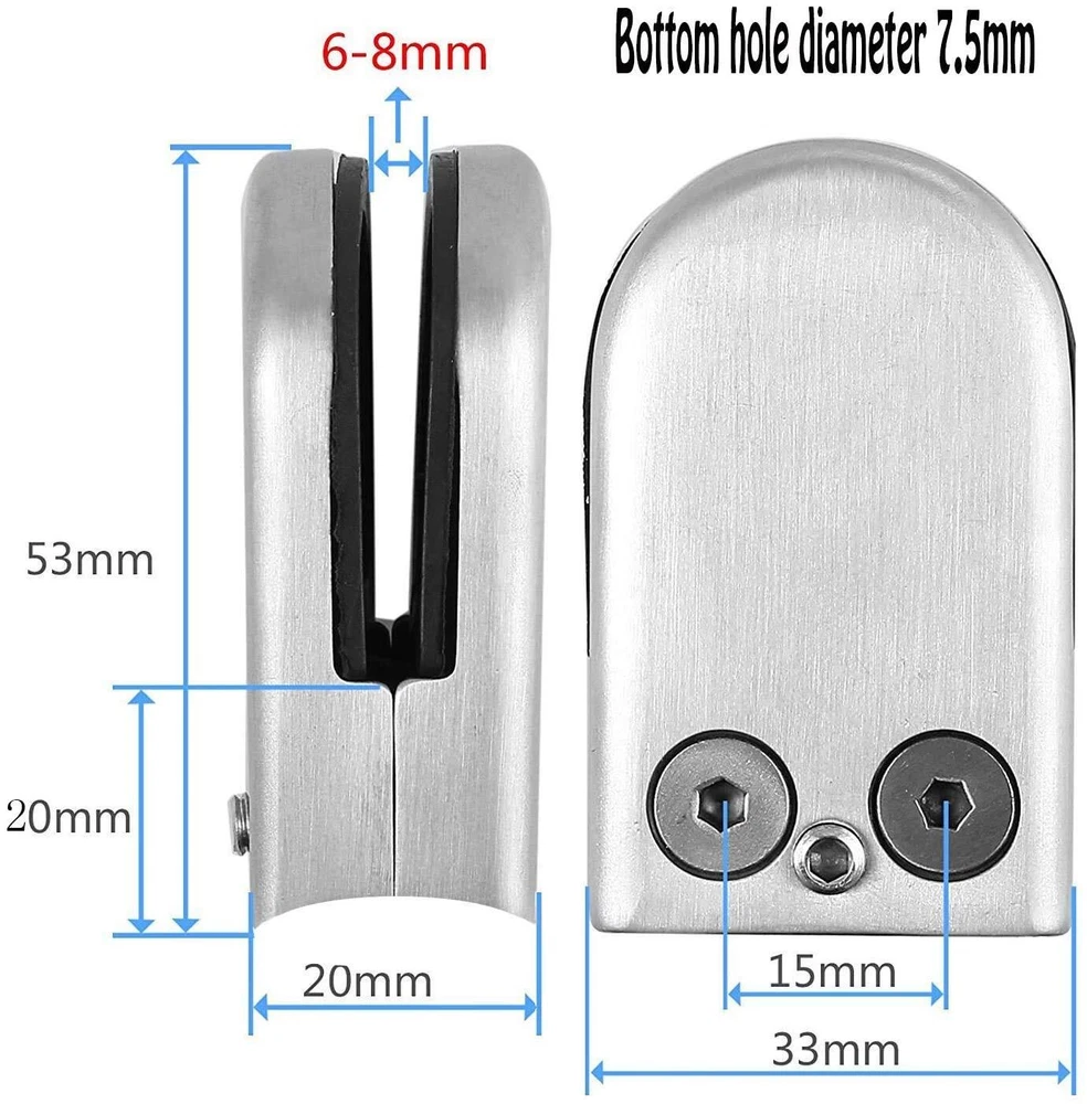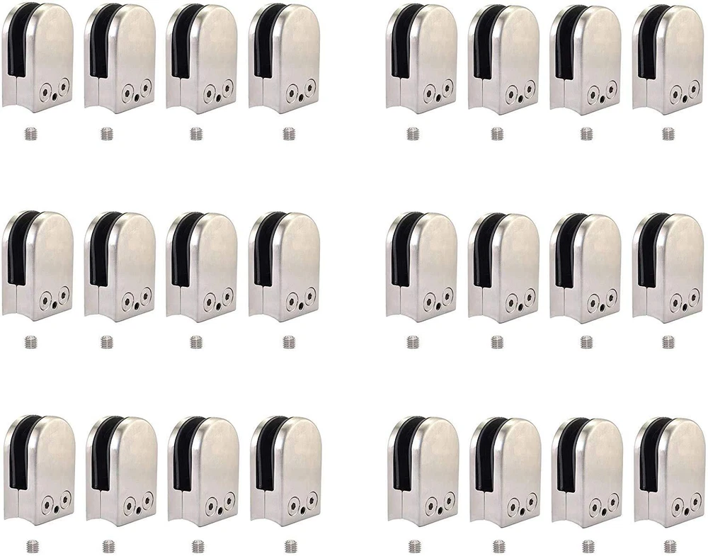 GLASS CLAMPS - 24PCS of Glass Clamps, Size 52*33*20 mm (H x L x T/D), Suitable for 6-8mm Glass. HEAVY-DUTY MATERIAL - Made of high-quality 304 stainless steel, our stainless steel glass clamp is heat-resistant and corrosion-resistant, with high hardness, not easy to bend and deform, and strong endurance, ADJUSTABLE RANGE - Suitable for 6-8mm Glass. EASY TO INSTALL - With a black non-slip rubber layer, it can prevent your glass from being scratched or crushed. At the same time, adjustable glass clamps are also built-in fine-tuning screws that allows you to use a hexagonal screwdriver to easily loosen or tighten the screw. SECURE APPLICATIONS - Our round glass clamp can be stably and safely fixed to the glass, which is very suitable for fixing the glass of balustrade, railings, stairs, handrails, windows, shelf brackets, shower rack brackets or floor support brackets.