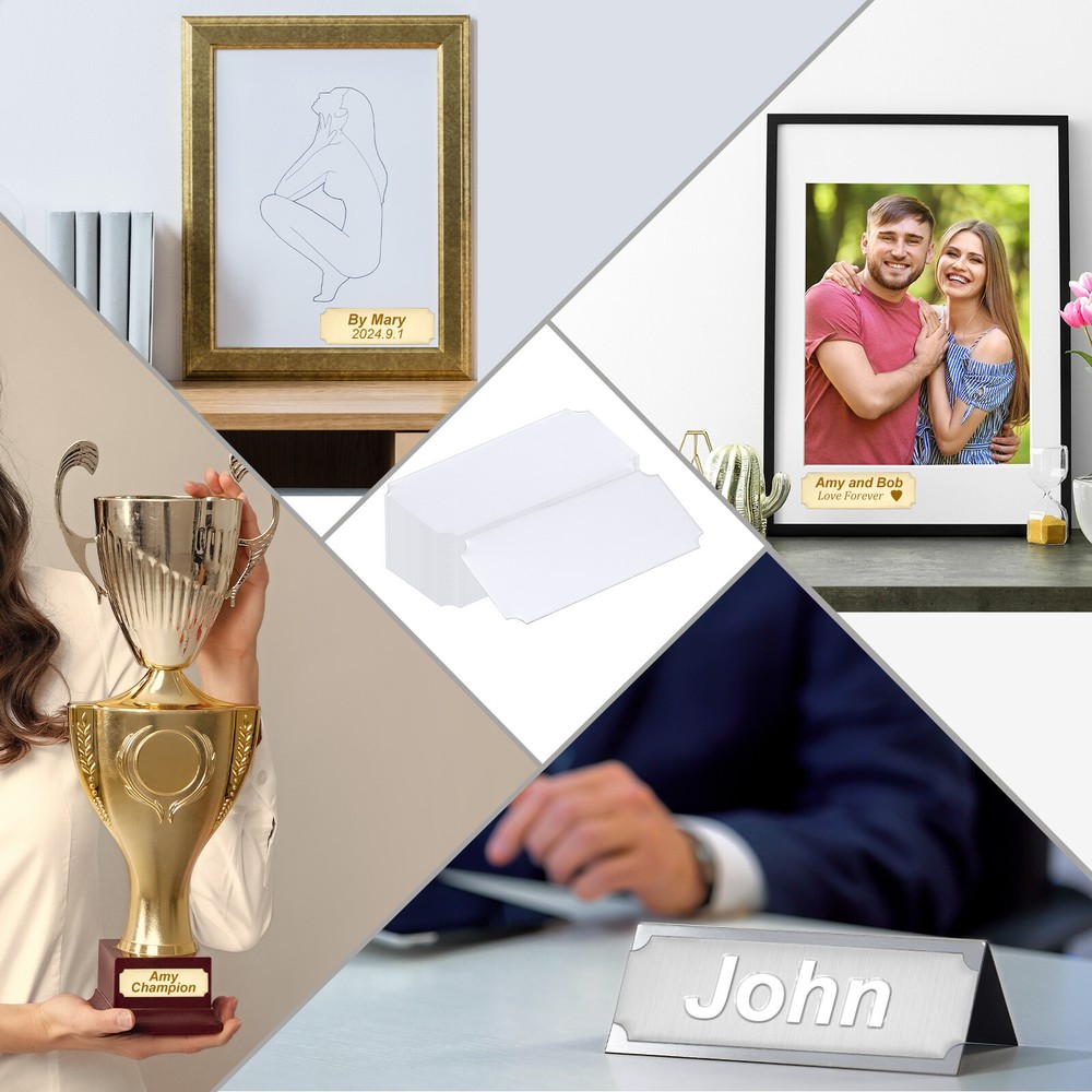 Document Our engraved nameplates are perfect for mounting on plaques, picture frames, sweaters, trophies, bags, display boxes, flag cases, and anything else.SpecificationMaterial: Stainless SteelColor: WhiteSize: 15.2 x 6.3 cm/6 x 2.5 Inch(L*W)Thickness: 0.4 mm/0.02 InchPacking List: 24 Pcs x Engraved NameplateAdvantageOur engraved nameplates are made of brushed stainless steel which is durable, stable, not easy to fade, rust, or break, and can be used for a long time. With a smooth surface, it will not scratch your skin.The right thickness makes the plate stronger and allows for deeper engraving. These elegant nameplates have a beautiful luster and a simple design. Suitable for various crafts to add brilliance.The protective film design can effectively prevent scratches. The adhesive backing design allows you to stick this nameplate anywhere without any tools and it can be firmly on the objects.InstructionPlace a metal workbench block underneath the blank stamping tags for better stamping.NOTE:1. There may be light scratches and blemishes due to shipping, but they can be polished.2. Only for laser engraving, not suitable for mechanical engraving.3. Please remove the protective film before use. 24 Pcs 6" x 2.5" Engraved Name Plate Picture Frame Label Art Tag, White Our engraved nameplates are perfect for mounting on plaques, picture frames, sweaters, trophies, bags, display boxes, flag cases, and anything else. Specification Material: Stainless Steel Color: White Size: 15.2 x 6.3 cm/6 x 2.5 Inch(L*W) Thickness: 0.4 mm/0.02 Inch Packing List: 24 Pcs x Engraved Nameplate Advantage Our engraved nameplates are made of brushed stainless steel which is durable, stable, not easy to fade, rust, or break, and can be used for a long time. With a smooth surface, it will not scratch your skin. The right thickness makes the plate stronger and allows for deeper engraving. These elegant nameplates have a beautiful luster and a simple design. Suitable for various crafts to add brilliance. The protective film design can effectively prevent scratches. The adhesive backing design allows you to stick this nameplate anywhere without any tools and it can be firmly on the objects. Instruction Place a metal workbench block underneath the blank stamping tags for better stamping. NOTE: 1. There may be light scratches and blemishes due to shipping, but they can be polished. 2. Only for laser engraving, not suitable for mechanical engraving. 3. Please remove the protective film before use. Hot Item Payment 1.We accept eBay payment . 2.Payment must be received within 7 business days of auction closing. Shipping 1.We ship to your eBay or Paypal address. Please make sure your eBay and Paypal address is correct before you pay. 2.Items will be shipped within 1-3 business day when we received payment. 3.Delivery time depends on destination and other factors. Description Policy 24 Pcs 6" x 2.5" Engraved Name Plate Picture Frame Label Art Tag, White Our engraved nameplates are perfect for mounting on plaques, picture frames, sweaters, trophies, bags, display boxes, flag cases, and anything else. Specification Material: Stainless Steel Color: White Size: 15.2 x 6.3 cm/6 x 2.5 Inch(L*W) Thickness: 0.4 mm/0.02 Inch Packing List: 24 Pcs x Engraved Nameplate Advantage Our engraved nameplates are made of brushed stainless steel which is durable, stable, not easy to fade, rust, or break, and can be used for a long time. With a smooth surface, it will not scratch your skin. The right thickness makes the plate stronger and allows for deeper engraving. These elegant nameplates have a beautiful luster and a simple design. Suitable for various crafts to add brilliance. The protective film design can effectively prevent scratches. The adhesive backing design allows you to stick this nameplate anywhere without any tools and it can be firmly on the objects. Instruction Place a metal workbench block underneath the blank stamping tags for better stamping. NOTE: 1. There may be light scratches and blemishes due to shipping, but they can be polished. 2. Only for laser engraving, not suitable for mechanical engraving. 3. Please remove the protective film before use. Hot Item Payment 1.We accept eBay payment . 2.Payment must be received within 7 business days of auction closing. Shipping 1.We ship to your eBay or Paypal address. Please make sure your eBay and Paypal address is correct before you pay. 2.Items will be shipped within 1-3 business day when we received payment. 3.Delivery time depends on destination and other factors.