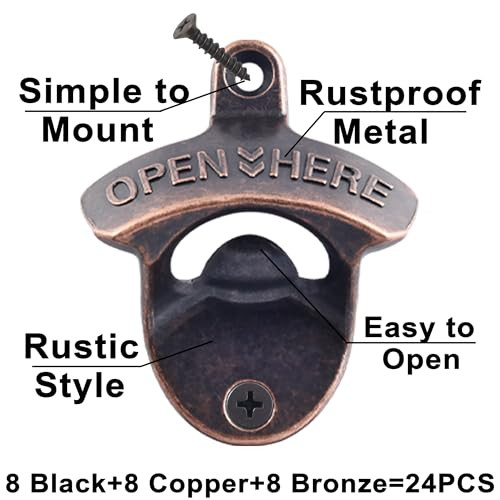 Menu 1. We require immediate payment. 2. We currently accept payment via eBay managed payments only. 3. Once payment is cleared, we will dispatch your shipment within 1-3 business days. Please refer to the "Shipping" tab for more information regarding shipping speed to your destination. 24 Packs Wall Mounted Beer Bottle Opener Bulk, Stainless Screw in Bottle Cap Opener for DIY Wood Post Product description Super Value: the product contains 8 PCS black, 8 PCS antique bronze and 8 PCS antique copper bottle opener (bottle opener size is: 3.15x2.56x1.14 inches)wall mount and 24 pairs of stainless mounting screws in the same color as bottle opener Durable and Rust-free: The embossed wooden post mount beer cap opener is made of high-quality stainless materials, durable and safe, and can be used outdoors for many years without rusting Simple to Mount: the "OPEN HRER" stianless screw in wall soda opener come with mounting screws, You can install a mountable beer opener in a few minutes Convenient wall mounted design: No need to worry about finding a bottle opener anymore. 's wall mounted beer top opener is always t when you need to open the bottle cap Widely Used: This mountable drink cap opener can be installed on wooden caddy, cooler, post, table, shelf, bench, as well as indoor and outdoor scenes such as garages, cabins, man cave, backyard kitchens PLEASE MESSAGE US IF YOU HAVE ANY OTHER QUESTIONS, AND MANY THANKS FOR READING ALL OF THIS. Copyright ©#. All Rights Reserved.