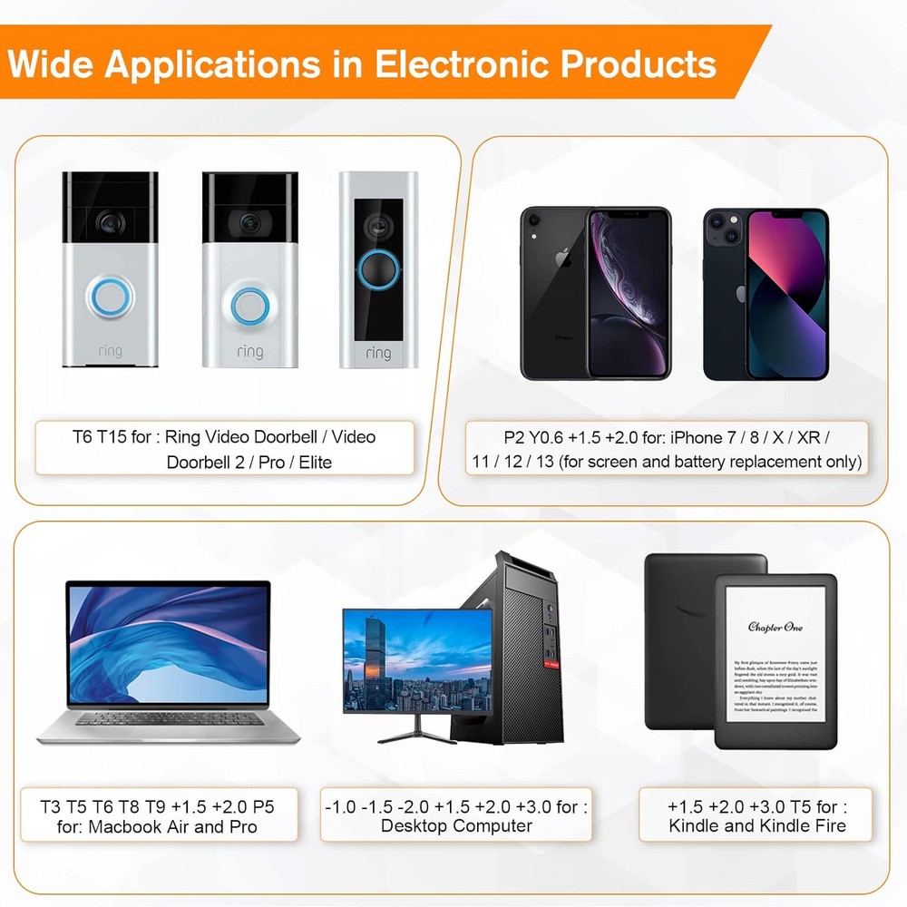 JOREST 24Pcs Small Precision Screwdriver Set with Torx T5 T6 T8 T9, Colorful Product Details Brand: Jorest Number of Items: 24 Head Style: Torx Material: Chrome Vanadium Steel Aci Color: Colorful Special Feature: Magnetic Tip Model Name: Precision Screwdriver Manufacturer: JOREST Part Number: AJJOJM0301ORDDER1S Item Weight: 3.2 ounces Package Dimensions: 7.95 x 4.92 x 0.71 inches Country of Origin: China Item model number: AJJOJM0301ORDJPR1S Style: 24 in 1 Special Features: Magnetic Tip Batteries Included?: No Batteries Required?: No Brand: Jorest Number of Items: 24 Head Style: Torx Material: Chrome Vanadium Steel Aci Color: Colorful 【Precision screwdriver set】-- 24Pcs precision screwdriver set includes 20Pcs CRV screwdriver bits which are phillips +1.5(PH000) +2.0(PH00) +3.0(PH0), flathead -1.0 -1.5 -2.0, torx T1 T2 T3 T4 T5, torx security TR6 TR8 TR9 TR10 TR15, triwing Y0.6(Y000) Y1.5(Y00), pentalobe 0.8(P2) 1.2 (P5), with a screwdriver handle, a double-ended spudger, a triangle spudger, and a SIM card thimble. 【Wide application】-- P2 Y0.6 +1.5 +2.0 are used for iPhone 7/8/X/XR/11/12/13, for their screens and batteries replacement only. T8 +1.5 +2.0 +3.0 are used for PS3/PS4/PS5. T6 T8 T10 are used for Xbox 360/Series S&X. Y1.5 +1.5 +2.0 are used for Switch/Joy-Con/Wii. T6 T15 are used for Ring Video Doorbell/Video Doorbell 2/Pro/Elite. T8 is suitable for Folding knife. T3 T5 T6 T8 +1.5 +2.0 P5 are used for Macbook Air and Pro. -1.0 -2.0 +1.5 +2.0 +3.0 are used for Computer/ Watch/Glasses. 【Slip-resistant rotatable handle】-- The screwdriver handle is made of TPR and PP materials, with a special non-slip design, offering a sense of comfortable. The top of the handle is rotatable design which makes it more convenient to remove the screws; the handle head has magnetic adsorption which can quickly replace the screw head. 【CR-V screwdriver bits】-- All our screwdriver bits are made of high quality CR-V chrome vanadium steel. CR-V screwdriver bits do not rust easily and are not prone to be worn out. 【Portable gadgets】-- The triangular spudger is more suitable for opening the screen of the mobile phone.The double-ended spudger is more suitable for opening the back cover of game devices. The SIM card thimble can be used to replace the SIM card of the mobile phone.