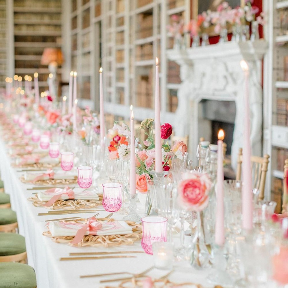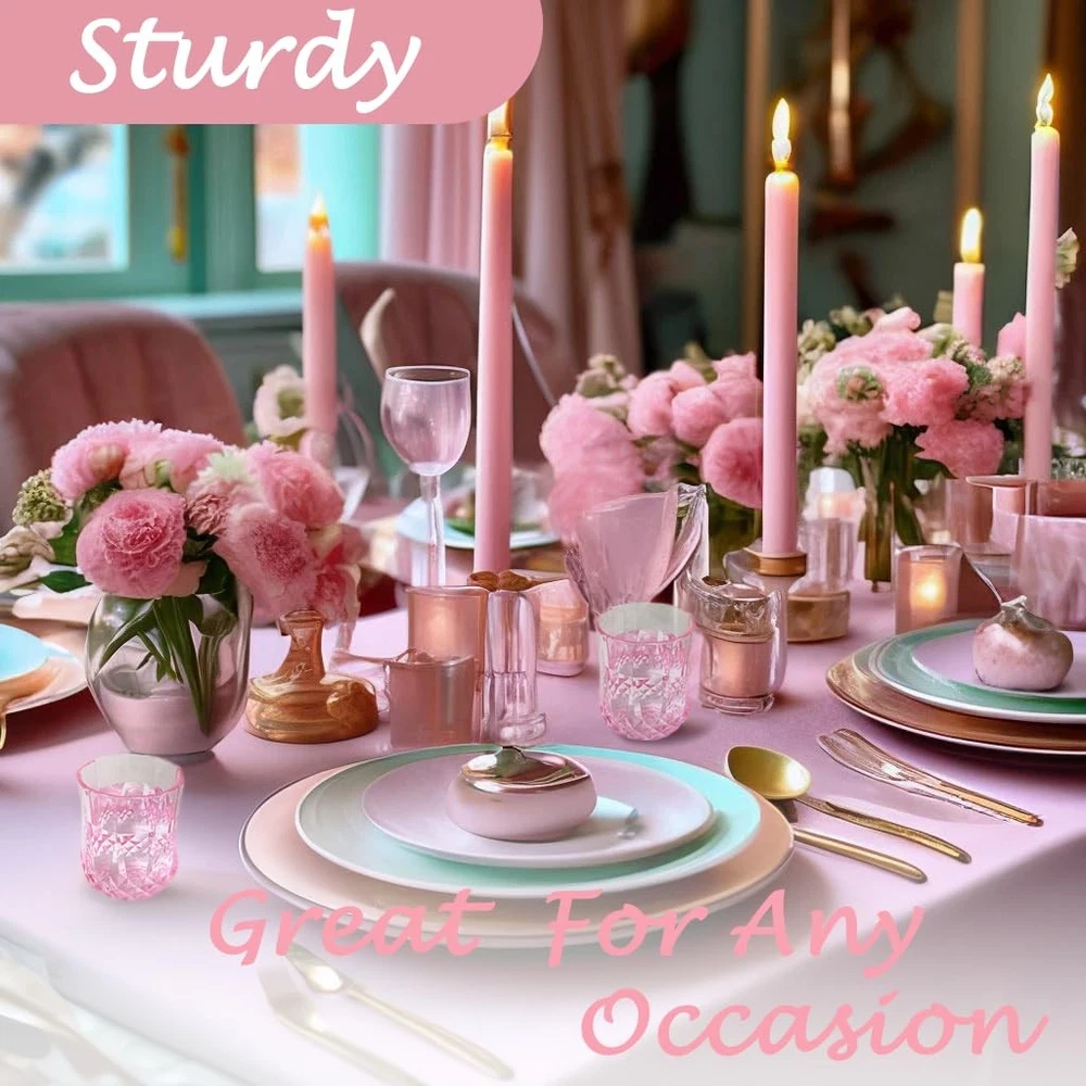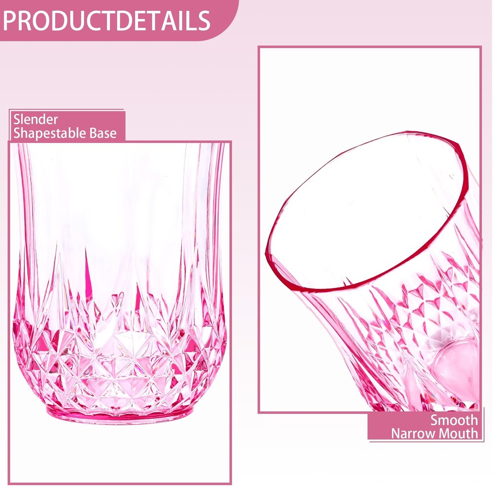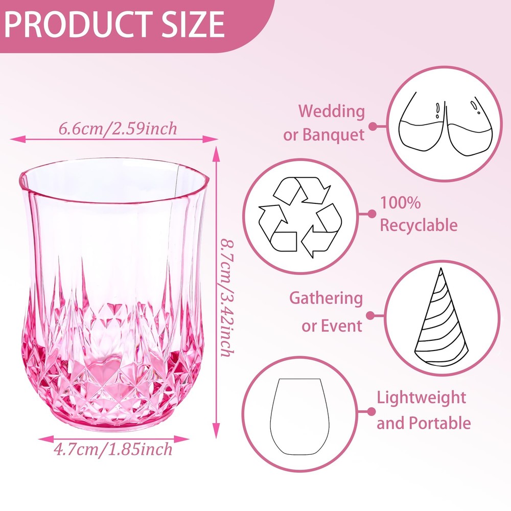 Stemless Wine Glasses 🍷🍷🍷 Package Includes: 24 elegant and exquisite stemless cups. Each stemless wine glass is meticulously crafted with retro patterns. The abundant quantity can meet the needs of your wedding, party or other large-scale events. The stemless cups add a touch of refinement to any table decoration 🍷🍷🍷Excellent Material: Stemless wine glasses are made of plastic, which not only have the aesthetic appeal of pink plastic cups but are also not easily broken and can be reused. Their unique design and cup wall pattern design add an elegant touch without sacrificing durability 🍷🍷🍷Suitable Size: The exquisite plastic drinking glasses have a diameter of approximately 2.59 inches and a height of about 3.42 inches, with a capacity of 9 ounces. The mouth is smooth and won't damage your lips. Pink wine glasses are suitable for various beverages such as wine, champagne, whisky, holiday cocktails, etc. The handleless cup adds a touch of fashion to your party and leaves a deep impression on your guests 🍷🍷🍷Widely Used: Pink glasses are suitable for many occasions such as weddings, anniversaries, birthday parties, Joe's wedding banquets, New Year's Day, family gatherings, Christmas parties, Thanksgiving parties, Halloween parties, etc. This retro stemless wine glass and tableware set is an ideal choice for both indoor and outdoor gatherings 🍷🍷🍷Easy to Clean: Stemless wine cup only needs to be rinsed with warm water. Even after a long period of cleaning, it can still maintain a diamond-like luster under the light. The wine shines brightly in the cup, making stemless wine glasses suitable for creating unforgettable moments at wine tasting, dinner parties or special events