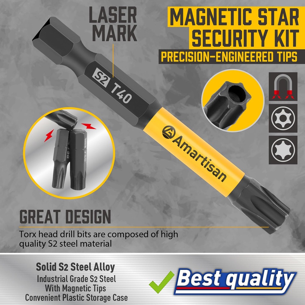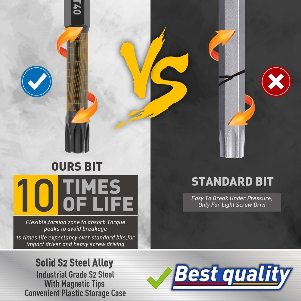 S2 Material Forging:The drill bit is made of high quality S2 alloy steel ,with sturdy hardened & tempered construction. S2 Material Forging:The drill bit is made of high quality S2 alloy steel ,with sturdy hardened & tempered construction. 1 Inch: 12 Pack Tamper Resistant star bits T-5, T-6, T-7, T-8, T-9, T-10, T-15, T-20, T-25, T-27, T-30, T-40 (T5 and T6 are not tamper proof security bits).. 2.3 Inch: 12 Pack Tamper Resistant star bits T-5, T-6, T-7, T-8, T-9, T-10, T-15, T-20, T-25, T-27, T-30, T-40(T5 and T6 are not tamper proof security bits). Wide Range of Uses: Used in automobiles, repairs, trucks, automobiles, engines, motorcycles, interiors, dashboards, computers, cable boxes, toys, appliances and consumer electronics, drill bits can also be used in many other protected parts. General tools: The 1/4" hex handle can be used with electric screwdrivers, hand screwdrivers, electric drills, combination general purpose tools and any standard drill.
