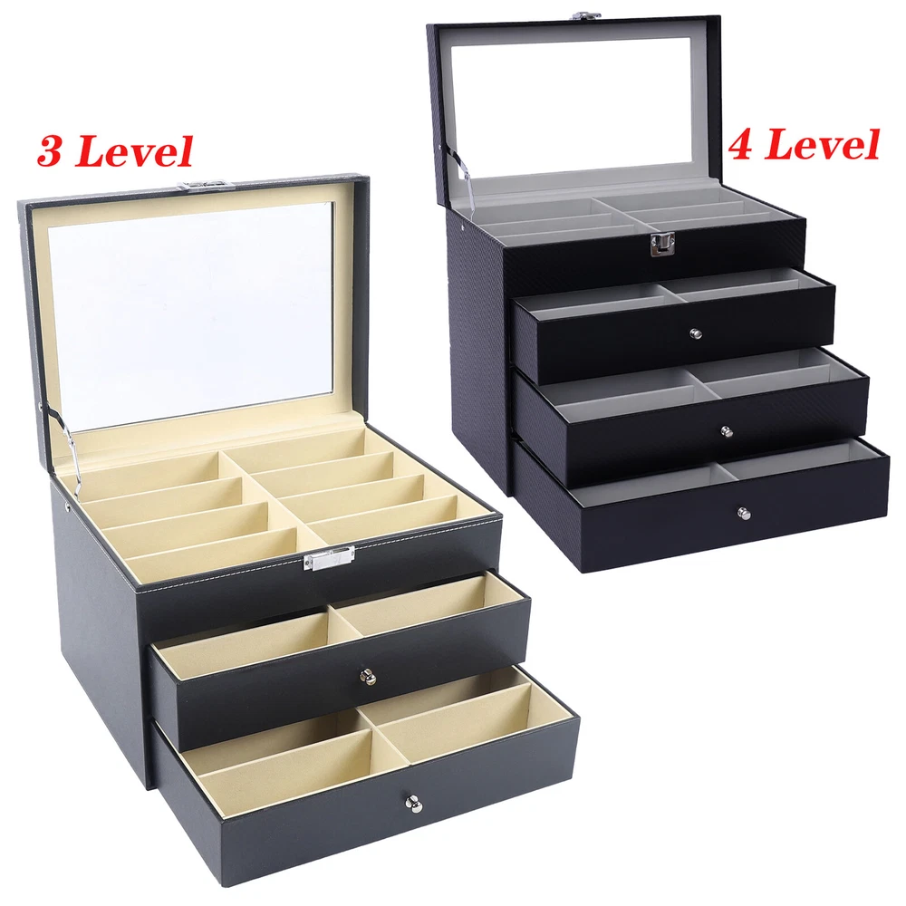 24Slot Sunglasses Glasses Eyeglass Organizer Display Case Storage Box,3/4 layers Welcome to my store :) Glasses Display Case Suits for storing glasses,jewelry,cuff links,spare links,rings,earrings,necklaces,etc Product Features: - High quality PU leather jewelry box with attractive appearance,simple structure,fine workmanship and sturdy construction - 24 sunglasses storage box for men and women. Eliminate the clutter in your home or office, and avoid the headache of all those misplaced glasses. -Four/Three level case with convenient drawers for optimization of space - It's divided into plenty of unit space which are easy to clean and maintain,It will keep your eyeglasses & sunglasses securely - This elegant storage case allows you to show your glasses and other jewelry while protecting them away from dust,fingerprints,scratches and thieves - Clear glass top gives you a open view and you can find your favorite sunglasses in seconds with this unique sunglasses box.Perfect for home and business use,and a wonderful gift idea. Product Specification: - Material: High Grade PU Leather,Medium Density Fiberboard - Window: Glass - Color: Black 1# - Product Dimensions (L x W x H): 33.5*19.2*29.7cm/13.18 x 7.55 x 11.69inch 2# - Product Dimensions (L x W x H): 34*25*22.3cm/13.38 x 9.84 x 8.77inch -Weight:2.8kg Packaging List: - 1 x sunglasses Display box Payment Delivery details Terms of sales About us Contact us Payment We accept ebay payment 。 Fees such as import duties, taxes are not included in the item price or shipping costs. These charges are the buyer's responsibility. Delivery details Shipping: 2-9 working days to: USA Terms of sales We maintain high standards of excellence and strive for hundred percent customer satisfaction. Feedback is very important to us. We hope that you contact us immediately before you give neutral or negative feedback, so that we can address your concerns. It is impossible to address issues if we do not know about them! About us Your satis faction is our ultimate goal. We work hard to earn your trust and future business. Our certified technicians have tested each item before shipping. The unit comes with 1 year limited warranty on all manufacturing defects. a) If you receive a defective item, you may return it or ask for a discount. Please contact us within 14 days after you receive the package. b) What you returned must be intact and in its original packaging as re? u. Customer is responsible for shipping costs of the returned item. c) We will cover the cost of shipping back t with the shipping rate indicated in the registration page. We will send you a new unit or refund the full payment you paid. Thank you. Contact us Business Hour Business Hour: Monday To Friday: 8:30 AM to 5:00 PM (Beijing China time) Due to time zones, our reply to your questions may not be immediately. But within above working time, we will reply your email within 24 hours. If it's non-workdays, please kindly be patient and wait till Monday. Please contact us with ebay message. Please feel free to contact us if you have any questions. Monday To Friday: 8:30 AM to 5:00 PM (Beijing China time) Due to time zones, our reply to your questions may not be immediately. But within above working time, we will reply your email within 24 hours. If it's non-workdays, please kindly be patient and wait till Monday. Please contact us with ebay message. Please feel free to contact us if you have any questions.