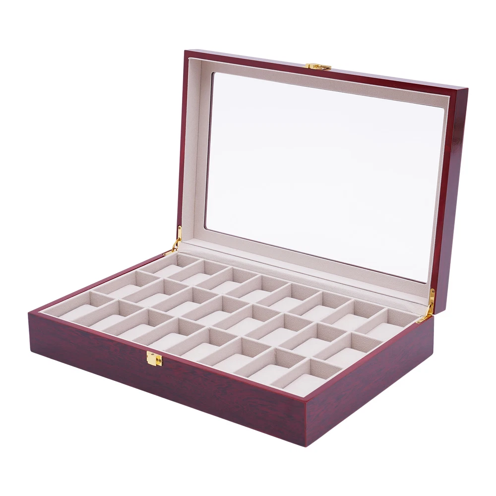 Love this watch box! The sleek wooden design with glass top looks elegant on my dresser. Fits all 24 of my watches securely with soft flannelette lining—no scratches! The lock keeps them safe, and the quality feels premium. Super fast shipping too—highly recommend for any watch collector!