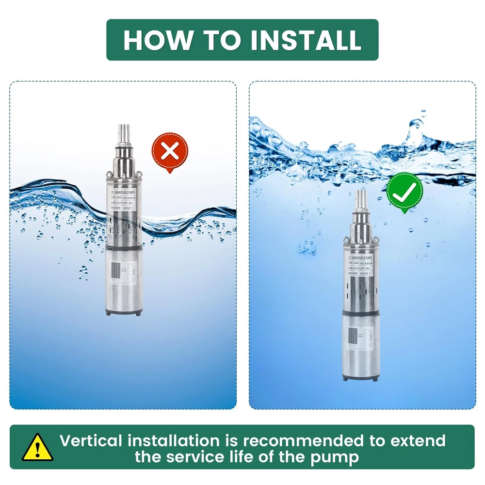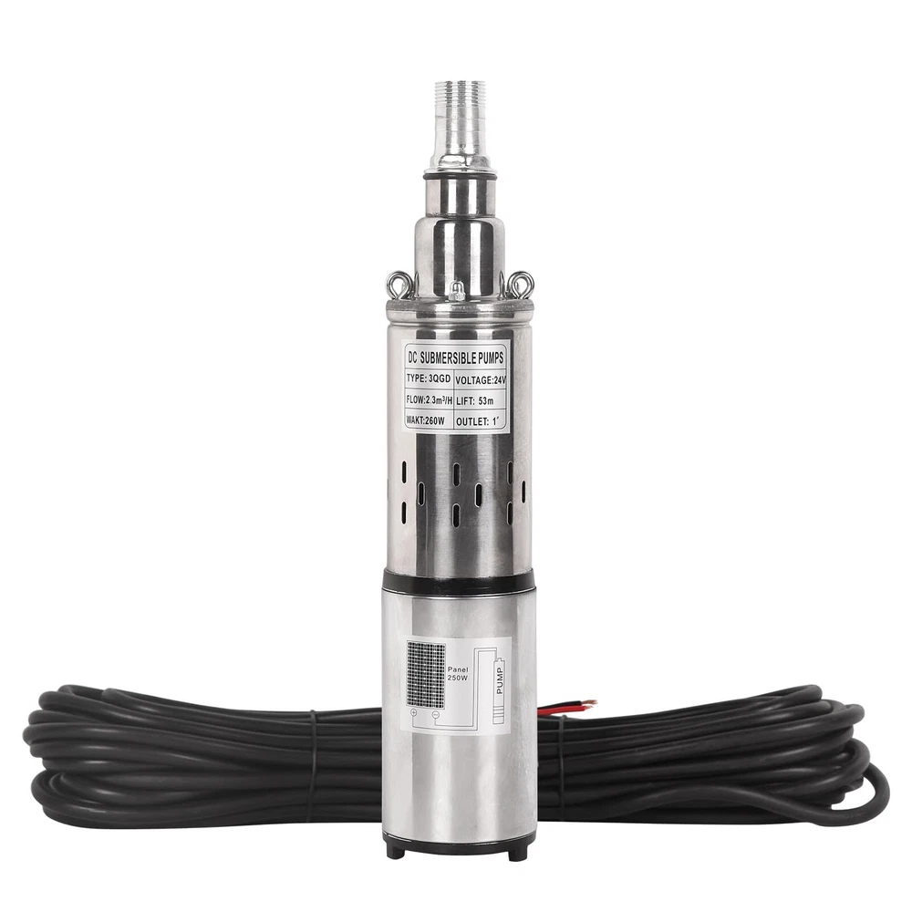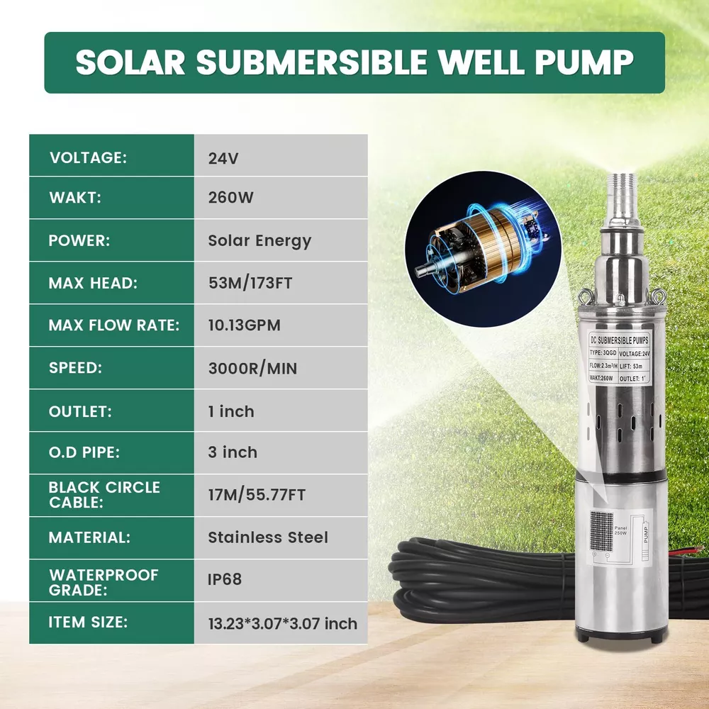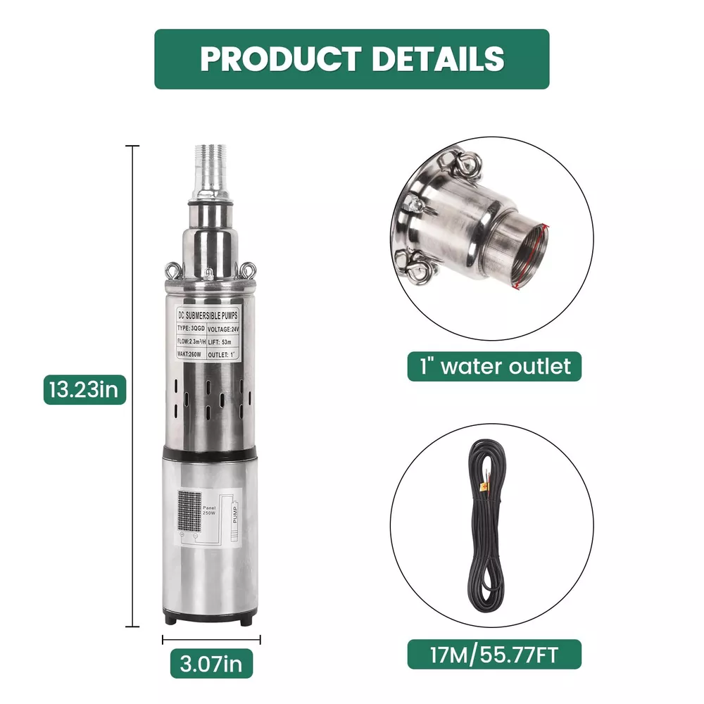 24V 260W Solar Water Pump Deep Well Solar Submersible Pump head 173ft stainless Details: About this item 【Product Introduction】: [Voltage]:24V/260W, [Flow]: 10.13GPM(2300L/H), [Outlet size]: 1 inch(25mm), [Max Head]: 53m (173ft), [Diameter]:3inch/75mm, [Weight]: 4.13kg/9.11lb, [Package size]: 13.2*3.07*3.07 inch. 【Solar Power Supply】: Environmentally Friendly. This submersible water pump is powered by solar energy, making it an eco-friendly, safety, economy and cost-effective option for pumping water. (NOTE: Please confirm whether the voltage and frequency compatible with your local standards before you order and it is prohibited to use with no water.) 【High Quality Material】: The solar well pump is made with durable stainless steel, this pump is corrosion-resistant and built to last, ensuring long-term reliability and performance. 【Stable Performance】: Less power cost, larger flow ,high pressure and great anti-corrosion ability. The compact size and lightweight design of this water pump 24v make it easy to install and transport. Additionally, the stainless steel construction makes it easy to clean and maintain. 【Versatility】: The industrial grade heavy-duty screw submersible well pump is very suitable for household and public utility applications. Suitable for rural areas, homes, farms, wilderness, camping water supplies, fishing boats, fish ponds, agricultural irrigation, etc. PRODUCT SPECIFICATION Voltage: 24V Power: 260W Solar Energy Max. head: 173ft / 53m Max. flow rate: 10.13GPM Speed: 3000r/min Outlet: 1 inch OD Pipe: 3 inch Black Circle Cable: 55.77ft / 17m Material: Stainless Steel Waterproof Grade: IP68 Stable Performance Solar Power Supply Stainless Steel Material Stable Performance Package Include: 1 x Solar Submersible Well Pump 1 x Electric Cord 1 x User Manual 24V Solar Submersible Deep Well Pump The industrial grade heavy-duty solar submersible pump is less power cost, larger flow ,high pressure and great anti-corrosion ability. The compact size and lightweight design of this pump make it easy to install and transport. Additionally, the stainless steel construction makes it easy to clean and maintain. Product Dimensions: 13.23 × 3.07 × 3.07 inch Product Weight: 8.97 lbs Package Dimensions: 16.14 × 3.74 × 6.69 inch Package Weight: 9.44 lbs Solar Power Supply This solar submersible water pump is powered by solar energy and is a safe, economical, and cost-effective pumping option. Premium Quality The solar submersible well pump is made with durable stainless steel, this pump is corrosion-resistant and built to last, ensuring long-term reliability and performance. Multiple Filtration Mesh It can effectively filter the stones and larger particles in the well water, and at the same time, protect the internal parts of the pump and prolong its service life. FAST SHIPPING WARRANTY EASY RETURNS CONTACT US FAST SHIPPING We only ship to US mainland 48 states and worldwide via ebay international shipping program. We don't offer direct international shipping. Consult us if you live in Hawaii, Alaska or Virgin Islands. Also we don't ship to any APO/FPO/PO BOX address. We offer FedEx Ground or Home delivery in optional which can make it faster, charge additional shipping fee. Delivery is any day from 1-5 business days (Monday through Friday, excluding weekends and holidays) WARRANTY This item is covered by our 12 months unlimited mileage warranty. Any customer may use the same outlets to facilitate a return or warranty claim. Any item must be returned within 30 days of the original purchase for refund; item(s) retaining a warranty may be returned beyond 30 days but within the remaining warranty period. Returns that are not subject to warranty may accrue a restocking fee and should be returned at the customers cost. We reserves the right to request proof of purchase and mechanical failure in the event of any warranty claim; any returns or claims that violate Ebay's Online Return policies will be reported. We holds no responsibility or liability for additional repairs, damages (punitive or non-punitive), loss of time, or any other extraneous circumstances created by a purchase made from said party. EASY RETURNS We understand that sometimes you need to make a return or an exchange. All we ask is you send it back in the same condition it was received - new and un-used. If the product you receive is not the one you ordered, please take photos of any visible of visual reference and contact us directly; photos must be CLEAR and VISIBLE. Logistical claims must be filed within 30 days of received the product; exchanges in these cases will be handled promptly and at?no cost to the customer. In order to process a return or exchange, please call us or send us a message through eBay and we will be happy to assist you immediately. However,any return that is NOT defective or NOT received in error, is the responsibility of the customer. We DO NOT cover any shipping costs and/or additional fees associated with the transaction. CONTACT US We are open Monday to Friday 8am to 5pm Mountain Standard Time, and Saturday 9am to 1pm MST. Our friendly staff are available during these hours. Please feel free to call us, or send us a message via eBay. We aim for complete customer satisfaction and repeat business; we will be more than happy to help you feel 100% comfortable with your purchase.