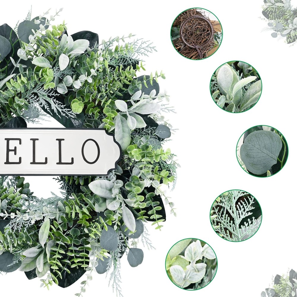 Front Door Wreath. The boxwood wreath works as indoor wreath, outdoor wreath, wedding wreath, welcome wreath, etc. It’s also suitable for sitting room, hotel, wedding scene, window, villa and wall decoration, photography background, etc. This Green wreath will bring an enjoyable ambiance all year round. Handmade Greenery Wreath. This artificial eucalyptus wreath for front door is made by hand. The eucalyptus leaves are made of silk cloth, and the boxwood, cypress, birch, lambs ear leaves are made of plastic. The back of the wreath is a natural grapevine wreath with built-in hook for easy hanging. The hello sign can be removed from the wreath. Spring Summer Wreath Size and Material. The front door wreath is 24'' and made from quality plastic and cloth, waterproof and UV protection, no maintenance, no trimming. Wipe clean with a soft damp cloth if needed. Works once you take it out of the box. You only need to adjust leaves to get a vivid appearance. Maintenance-Free. Artificial green leaves wreath always stays color and shape, and will look great for years to come. You can blow it with a hair dryer to make the wreath as bright as new. Suggest indoor use. If works outdoor, please try to avoid rain and snow. Note. Because the door wreath may be squeezed during transportation, they need to be re-shaped once removed from the box, to achieve their intended appearance and size. It is recommended to use after ventilation. Please don't hesitate to tell us if you have any concerns, and we will slove it in your favor.