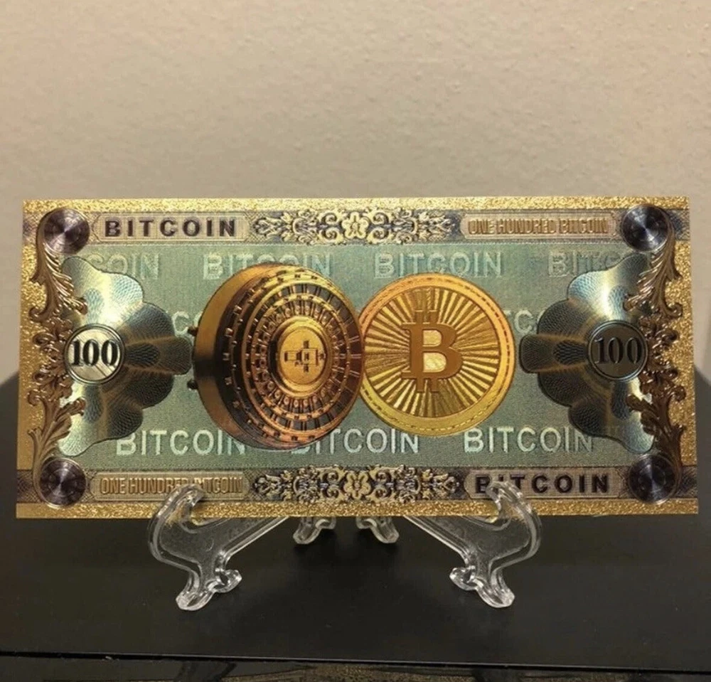 24k Gold Foil Plated 100 Bitcoin (Cryptocurrency) Banknote (Cryptocurrency bundle available) (Many other series/characters available!) (Not real currency) Amazing quality! Pictures do not do these justice, what you see in person is amazing! So much detail and shine in each one. You will be very happy with what you see. Stand not included Great gift for any collector or cryptocurrency fan/investor! Unique gift. Great stocking stuffer. Perfect for birthdays/baby showers/Christmas/Graduation and more! View my page for many more options and tons of characters and styles. Will bundle! Offers welcome. Most orders ship same or next day!