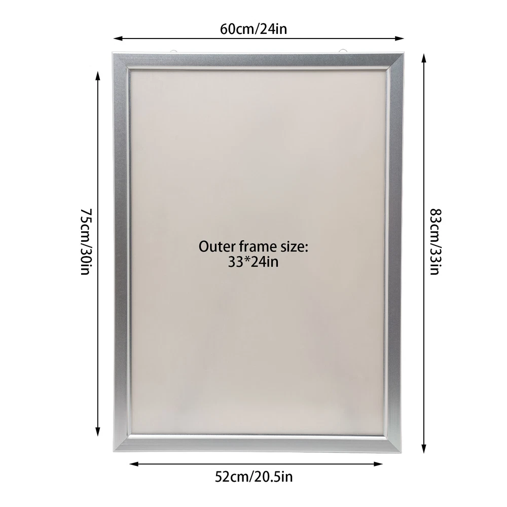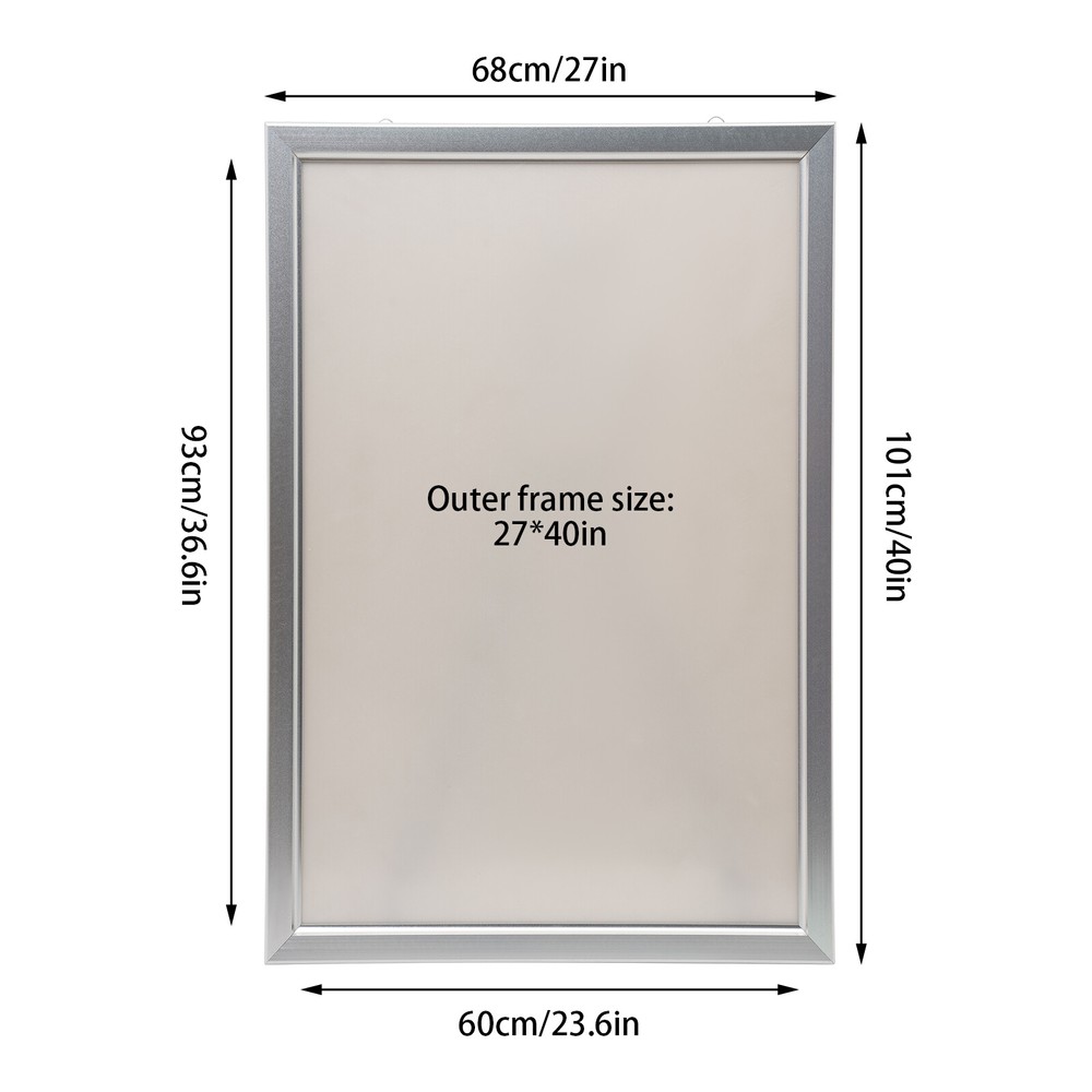 Welcome LED Poster Movie Frame Backlit Light Box Advertising Sign Display Multiple Size 24" x 36" Description: Our photo light box is made of a premium aluminum alloy and acrylic. It’s sturdy and durable. With two sturdy hooks on the back, you can easily hang this product on the wall.LED light source can illuminate your posters and advertisements. This product doesn't need assembly and you can use it directly after plugging it in. The LED light box is suitable for home decoration and commercial areas, such as chain stores, supermarkets, stations, large-scale exhibition projects, etc. Package Included 1* LED Poster Frame Specification Color: Black/Silver Material: Acrylic, Aluminium Alloy Shape: Rectangular Style: Modern Plug Voltage: 110V Power: 20W Power Type: Plug-in Mounting Type: Wall Mount Lumen: 2000lux CRI: >85 Color Temperatur: 9000-10000K Service Time: About 80000h Efficiency: E Plug: American Standard Light Source: LED (Included) Net Weight: 3.5kg/7.7lbs Gross Weight: 4kg/8.8lbs Surface Treatment: Sandblasting Process, Baking Paint Process, Oxidation Process, Cutting Process Product Size: 60.96*3*91.4cm/24*1.2*36inch Package Size: 98*63*4cm/38*24*1inch Key Features Soft Light: This product uses a uniform nano light guide plate and side light guide technology, making the light soft and not harsh to protect your eyes. The LED light has high brightness, fast heat dissipation, which can provide stable performance, extend the service life of the product, and save electricity. Narrow Edge Design: The frame is spliced at 45° and has a width of 1.5 inch, which can maximize the visibility of the visual area (24*36 inches) and play a promotional and display role. Thoughtful Design: The built-in stainless steel shrapnel and the front-opening frame design allow you to gently flip out to open the panel, making it easy to replace the poster Multiple Uses: It can display posters for cinemas, shopping malls, restaurants, etc. to attract customers' attention or be used as a signs board to guide the way for passersby. You can also put it at home for decoration or use it as a display board for art galleries and museums. Details Study Hooks: With two sturdy hooks on the back, you can easily hang this product on the wall. Strong and Durable: The high-quality acrylic panel is dustproof, moisture-proof, and can resist impact and deformation. Meanwhile, the aluminum alloy frame adopts a sandblasting process, baking paint process, and an oxidation process, so it can resist wear, corrosion, rust, and heat. Protective Packaging: The four corners of the product are wrapped with sponges to resist compression and falls, which can prevent product damage in transit. Ready to Use: This product doesn't need assembly and you can use it directly after plugging it in. Application It is suitable for exhibitions, advertisements, signs, and decorations in cinemas, event promotions, retail stores, restaurants, art displays, trade shows, banks, hospitals, libraries, counters, offices, companies, menu boards, jewelry stores, hotels, studios, etc. Installation 1.Place the poster frame on the wall, and mark the location of the nail hole with a pen. 2.Drill 2/4 holes at the marked position and punch nails(not included). 3.Remove the rear protective film and hang the frame on the corresponding nail. 4.Remove the front protective film. Notes 1.The product has protective films on both sides, please tear them off before use. 2.Please allow the slight color difference caused by the shooting light and 1-3cm error due to manual measurement, and make sure you do not mind before ordering. Payment Delivery details Terms of sales About us Contact us Payment We accept ebay payment 。 Fees such as import duties, taxes are not included in the item price or shipping costs. These charges are the buyer's responsibility. Delivery details Shipping: 2-9 working days to: USA Terms of sales We maintain high standards of excellence and strive for hundred percent customer satisfaction. Feedback is very important to us. We hope that you contact us immediately before you give neutral or negative feedback, so that we can address your concerns. It is impossible to address issues if we do not know about them! About us Your satis faction is our ultimate goal. We work hard to earn your trust and future business. Our certified technicians have tested each item before shipping. The unit comes with 1 year limited warranty on all manufacturing defects. a) If you receive a defective item, you may return it or ask for a discount. Please contact us within 14 days after you receive the package. b) What you returned must be intact and in its original packaging as re? u. Customer is responsible for shipping costs of the returned item. c) We will cover the cost of shipping back t with the shipping rate indicated in the registration page. We will send you a new unit or refund the full payment you paid. Thank you. Contact us Business Hour Business Hour: Monday To Friday: 8:30 AM to 5:00 PM (Beijing China time) Due to time zones, our reply to your questions may not be immediately. But within above working time, we will reply your email within 24 hours. If it's non-workdays, please kindly be patient and wait till Monday. Please contact us with ebay message. Please feel free to contact us if you have any questions. Monday To Friday: 8:30 AM to 5:00 PM (Beijing China time) Due to time zones, our reply to your questions may not be immediately. But within above working time, we will reply your email within 24 hours. If it's non-workdays, please kindly be patient and wait till Monday. Please contact us with ebay message. Please feel free to contact us if you have any questions.