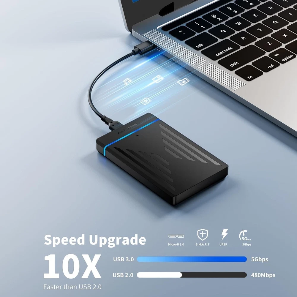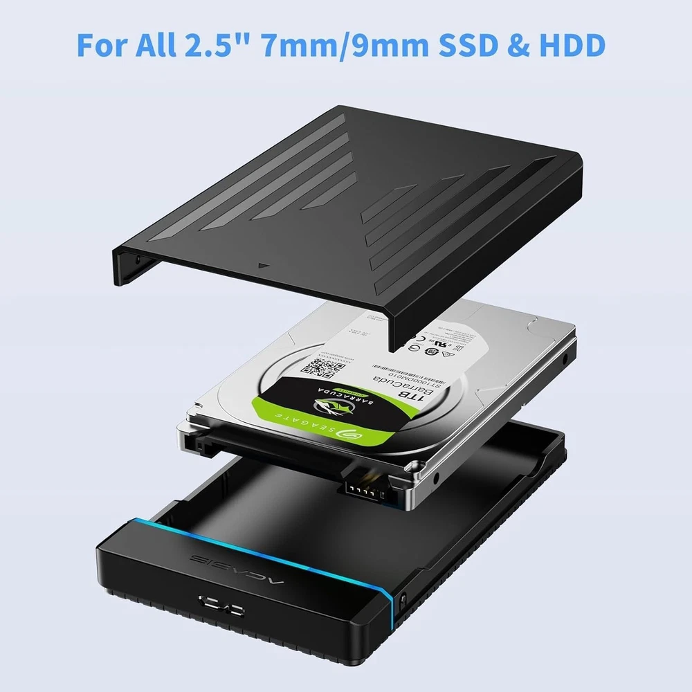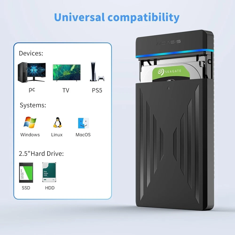 2.5" External Hard Drive Enclosure USB 3.0 to SATA III Adapter for SSD and HDD Product Description : 2.5 External Hard Drive Enclosure: Easily to connect the hard drive to your PC, PS4 and Xbox for backing up files or re-reading video, audio, games, etc. from the hard drive 5Gbps Data Transfer:The transfer rate of sata external hard drive enclosure can be up to 5Gps with the USB 3.0 port.And the maximum speed is up to 6Gbps under UASP protocol. Backward compatible with USB 2.0 or 1.1 ports.This external hard drive case can help you to upload a large number of files in a few seconds, saving your time! RGB Light Strip:displaying different colorful lights according to the working status of the hard drive. Built-in EVA foam pad protects the drive from shocks and vibrations. Detachable 19-inch data cable(SATA III to USB3.0), convenient for you to connect from a distance. MAX 6TB & Universal Compatibility:Plug & Play, no tools or drivers needed. It supports Windows, LINUX, MacOS 8.0, and above. Designed for 2.5'' 7mm /9.5mm SATA HDD & SSD up to 6TB. Compatible with WD, Seagate, Toshiba, Hitachi, Samsung, Crucial, SATA port SSD or HDD, and more. Package content: a 2.5 SATA enclosure, a 19 inch cable, a mounting screw tool, ❤️24h technical customer service❤️just for 100% customer satisfaction. We are committed to your satisfaction. If you are not completely satisfied with our product, we offer a 100% money-back guarantee. Top-Notch USA Seller | S wift USPS/UPS delivery | Shipped within 1 Business Day | Quick Replies | Free Shipping | Prompt Communication Contact us We value open communication with our customers. Our team is committed to providing quick responses to any queries or concerns you may have regarding our products or your order. Please feel free to contact us on eBay's Internal Message System for any questions or concerns you may have. Our dedicated customer service team is committed to providing exceptional support and ensuring your shopping experience with us is nothing short of excellent. Customer Service We strive to offer the best quality products to our customers. Each item listed in our store undergoes rigorous quality checks to ensure customer satisfaction. If you have any problems, we are very glad to help you. Please message us directly through eBay for faster response. Your inquiry is important to us and we'll respond within 24 Hr.