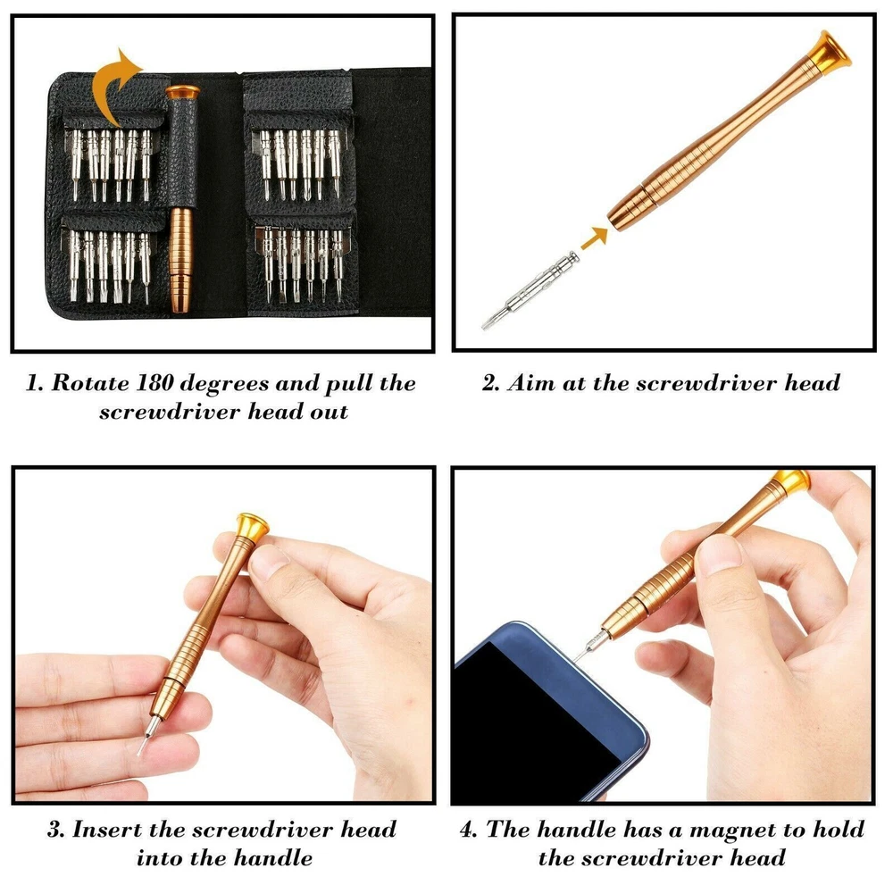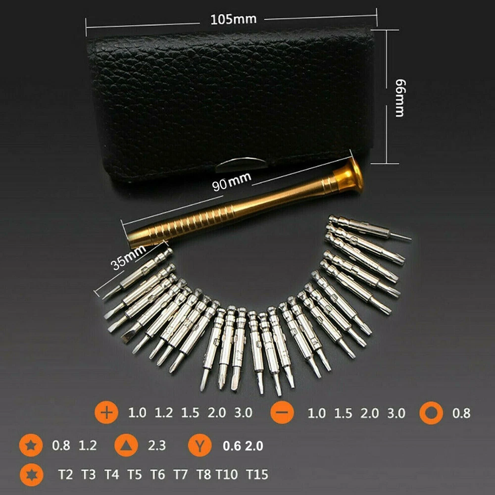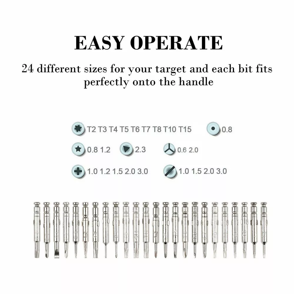 25 In 1 DIY Precision Screwdriver Set Mini Repair Tool For PC Glasses Laptop 25 In 1 DIY Precision Screwdriver Set Mini Repair Tool For PC Glasses Laptop Watch Eyeglasses Computer Electronics Repair Tool Kit This 25-in-1 precision Screwdriver set is an ideal tool set for electronic workshops, watch repair, eyeglass repair and where fine precision is required. You can keep it in a drawer in your home, put it in a backpack or even in your pocket, I think you will love it Feature: ✶ Full set of 24 batch head, complete specifications, can be adapted to work in many different fields. Suitable for most digital products, various types of computer, mobile phone, camera, glasses, watches. ✶ The handle in the aviation alloy material manufacture, light and durable, the tail adopts the precision bearing design, flexible and easy to use. ✶ Wallet type packing, light and portable, internal type batch head bayonet fixed, not easy to scattered, different from the traditional plastic box, easy to crush, scattered. Specification: Material: Steel Tool Color: Silver Holster Color: Black Holster Size(open): 20 X 10.5cm /7.87 x 4.13in(approx) Detailed: Five-star screw driver(2pcs) : 0.8 1.2 Torx screw driver (9pcs): T2 T3 T4 T5 T6 T7 T8 T10 T15 Triangle driver(1pc) : 2.3 Y screw driver(2pcs) : 0.6 2.0 Cross screw driver(5pcs) : 1.0 1.2 1.5 2.0 3.0 Flat screw driver(4pcs) : 1.0 1.5 2.0 3.0 Point screw driver(1pc): 0.8 Package Included: 1 x 25 in 1 Screwdriver Set 1 x Wallet Case 【Service Guarantee】 Welcome to My Store^_^ If you like the product, you can add it into your cart, and you can also add me to favourite seller^_^ IWe try to accurately describe our item to the best of our knowledge, if there is any incorrect, Please contact us via message firstly before leaving neutral or negative feedback or opening return request or case. We will reply to you as soon as possible when we see your email at work. ^_^ Payment Delivery details Terms of sales About us Contact us Payment 1.We only accept PayPal as payment method. 2.The item will be shipped to buyer’s CORRECT and VERIFIED Ebay Address. 3.We are not responsible for the package lost due to incorrect address. 4.Our price do not including any custom or duty, VAT and local tax. 5.Payment must be received within 7 days of winning the auction 6.Please contact us if you need file an extension for any late payment. Delivery details 1.All item are shipped via DHL eCommerce or USPS Frist Class express Service within 2 business days once full payment is settled.If you can't get your items in time,please contact to us first,we will check and solve it for you soon.We will reply your mail within 24 hours normally. Sometimes have a little delay due to the weekend or holiday.If you can't get our mail after 48 hours,please check your spam or contact to us with other mail address or via ebay. 2.We only ship to confirmed Ebay addresses. Your Ebay address MUST MATCH your Shipping address. 3.If you want to change the address please E-mail us right after you pay for the item. 4.SERVICE TRANSIT TIME is provided by the carrier and excludes weekends and holidays. Transit times may vary, particularly during the holiday season. 5.If you have not received your shipment within 30 days from payment, please contact us. We will track the shipment and get back to you as soon as possible with a reply. Our goal is customer satisfaction! Terms of sales 1.Please contact us via eBay Message if you have NOT received item in 30 days , we will check it with post office, and then resend or refund any missing item. 2.i n the unlikely event that your product is faulty in anyway, you must contact us ASAP and then return it within 7 Days of receipt. 3.Return shipping fee should be paid by buyer if wrong item you bought (wrong model or wrong color) and item is defective. We will provide replacement or refund after we received and confirmation. 4.if you need return, please contact and get an address for return from us, then declare your package as “Return”, write your Ebay ID and item number outside About us 1. Dear buyers, we appreciate your business, if you are satisfied with our service, 2. Please leave us a positive feedback and rate the details of the transaction (Detailed Seller Ratings) with a "PERFECT 5 Star. 3. Your recognition will make us more confident to develop business and serve you better. 4. Our goal is to make sure you are a happy buyer and pleasant shopping with us. Please email us before leaving any 1 or 2 ratings, negative feedback or open any dispute. We understand the concerns and frustrations you might have, and will do our endeavor to resolve the issues. Please give us the opportunity to resolve any problem. Contact us 1. We strive for 100% customer satisfaction on every sale we complete. 2. If, for any reason you are not satisfied with your purchase, please contact us before leaving neutral or negative feedback. We will work with you. 3. We are wholesaler and exporter and we have served thousands of customers from all over the world. 4. Our products are direct from factory , there is no middle man, no high markup, so we can provide quality items yet very competitive price. 5. If you have any questions please contact us by email, most emails are responded within 24 business hours. 6. We work 6 days (Mon to Sat) a week. (Note: Bidders who use free email like AOL, Yahoo, the reply email may fall into your junk mail box. 7. Please send email directly or try send email by other account.) The feedback forum is not the place to leave us a message. 8. These email systems are known to occasionally block incoming emails from eBay or eBay sellers. 9. If you never hear from us please go to your "Inbox" under eBay "My Messages" section to look for our messages as we always send our messages directly through eBay to your email account and you can always find our messages there regardless of what email problems you may experience. Brand Unbranded MPN Does not apply Color Silver T