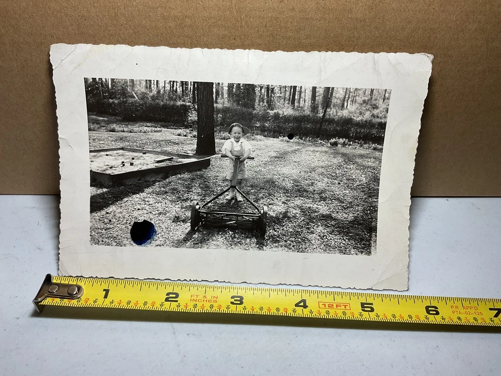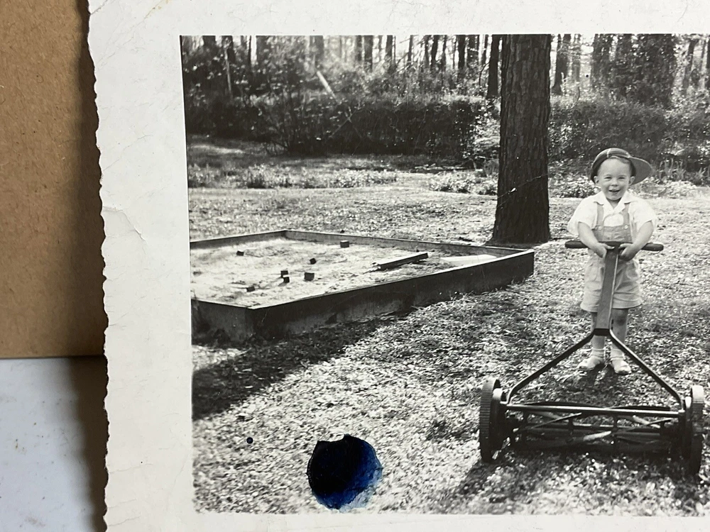25 Mar 1945 Photograph Young Boy Pushing Lawn Mower Hat Sandbox S1324
