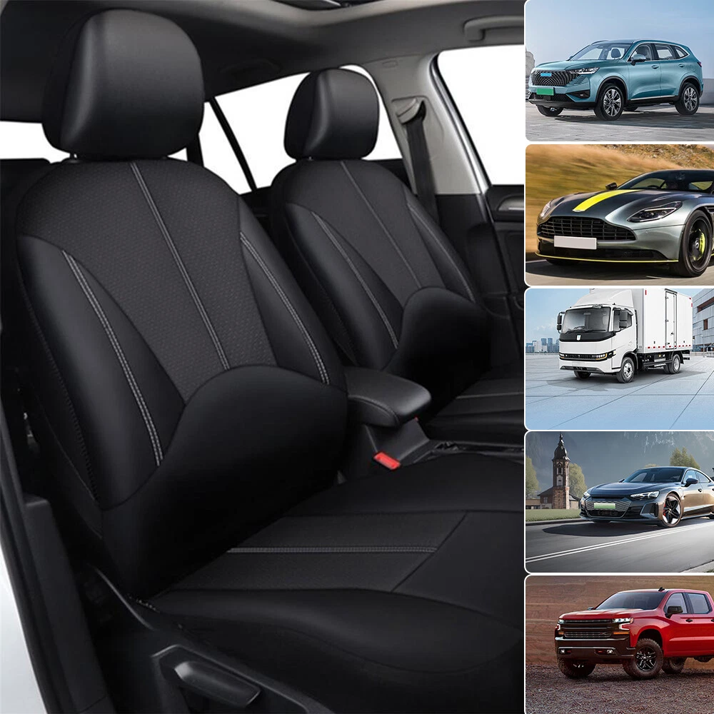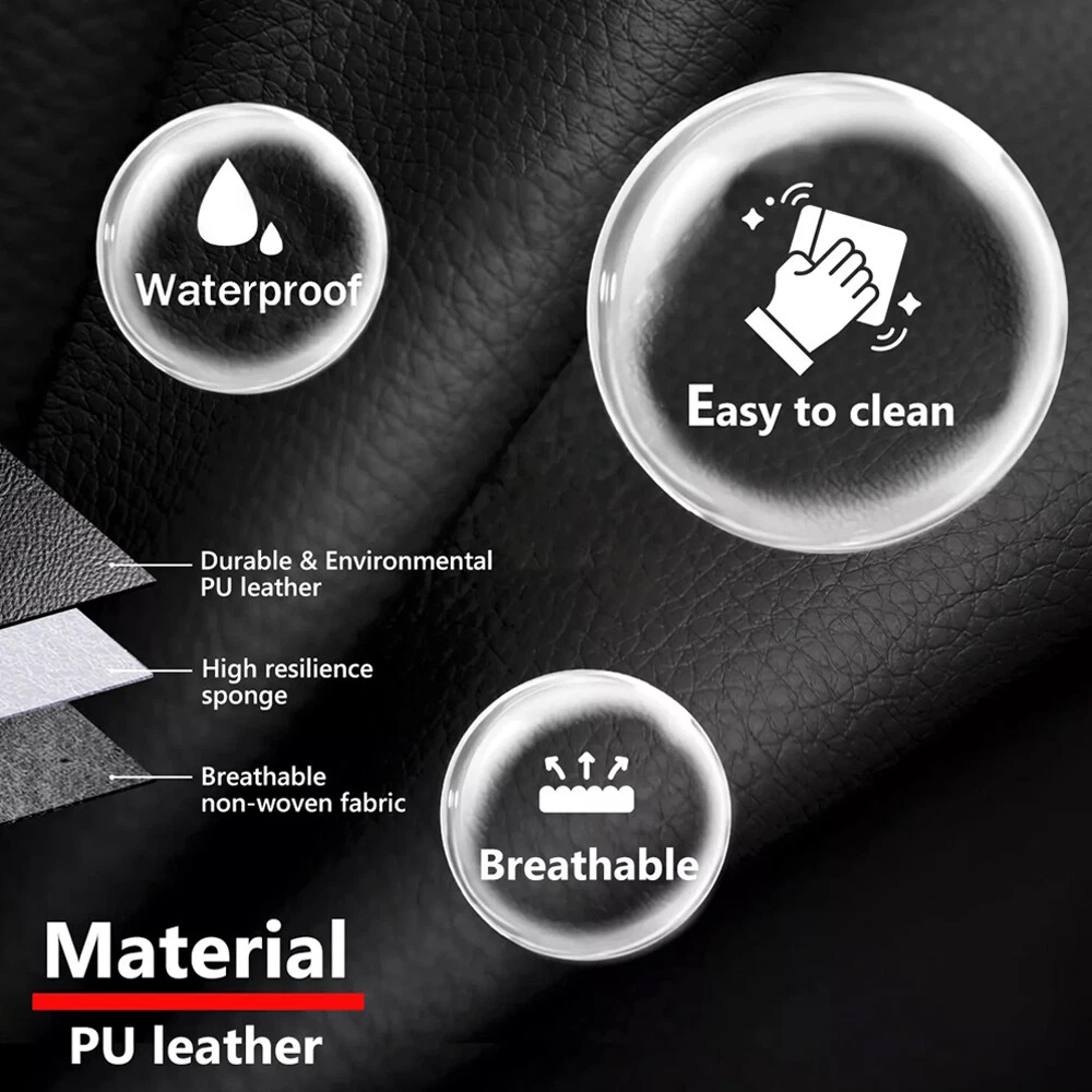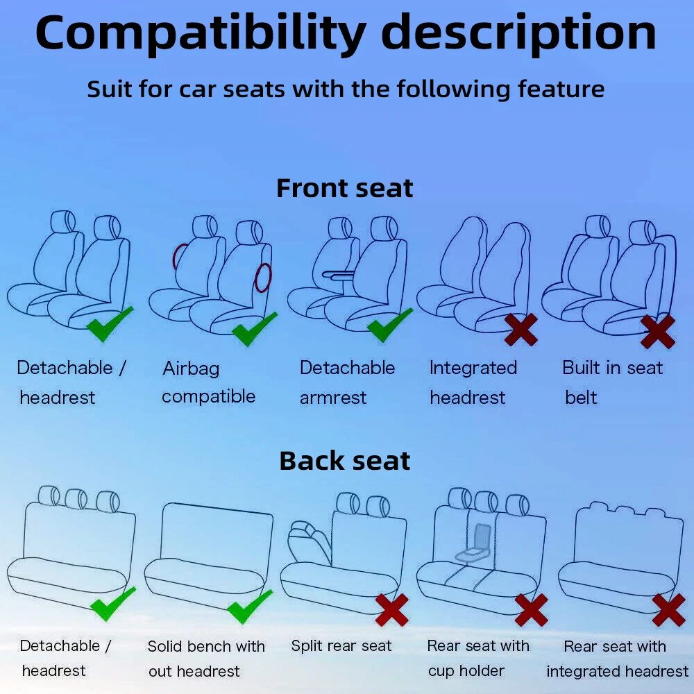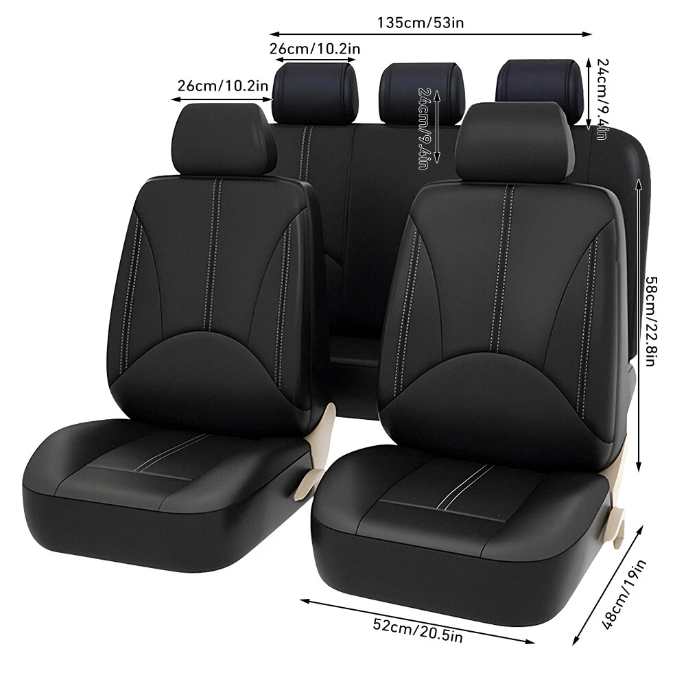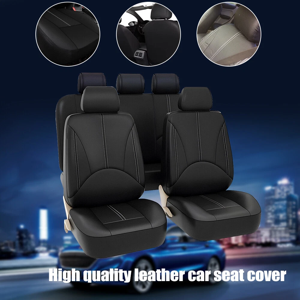 Features: 1.This cover fits all universal standard car seats,suitable for four seasons 2.Made of premium litchi pattern faux leather with small venting holes on the surface and filling with 5mm soft sponge, comfortable and breathable 3. This full seat cover set will completely cover your car seats, including the front and rear seats, backrests and headrests, not only prevent your car from the dirt, pets scathing,other pollutions, but also give your old seats a new look 4.It reserves for airbag outlet, will not affect the function of your airbag ,more safe and reliable 5.Come with a installation manual,easy to install 6.Easy care:when there are dirts on the cover, wipe with a wet rag Package Included: For 2 Front Seats only: 2 x Headrest Covers 2 x Front Seat Covers 1 x Bag Hook Accessories 1 x Installation Manual For 5 Seats Full Set: 5 x Separate Headrest Covers 2 x Front Bucket Seat Covers 1 x Rear Bench Seat Covers 1 x Rear Backrest Covers 1 x Bag Hook Accessories 1 x Installation Manual